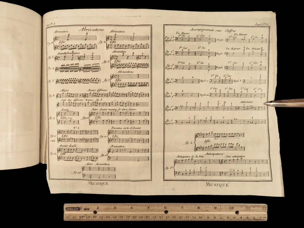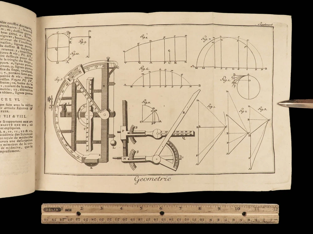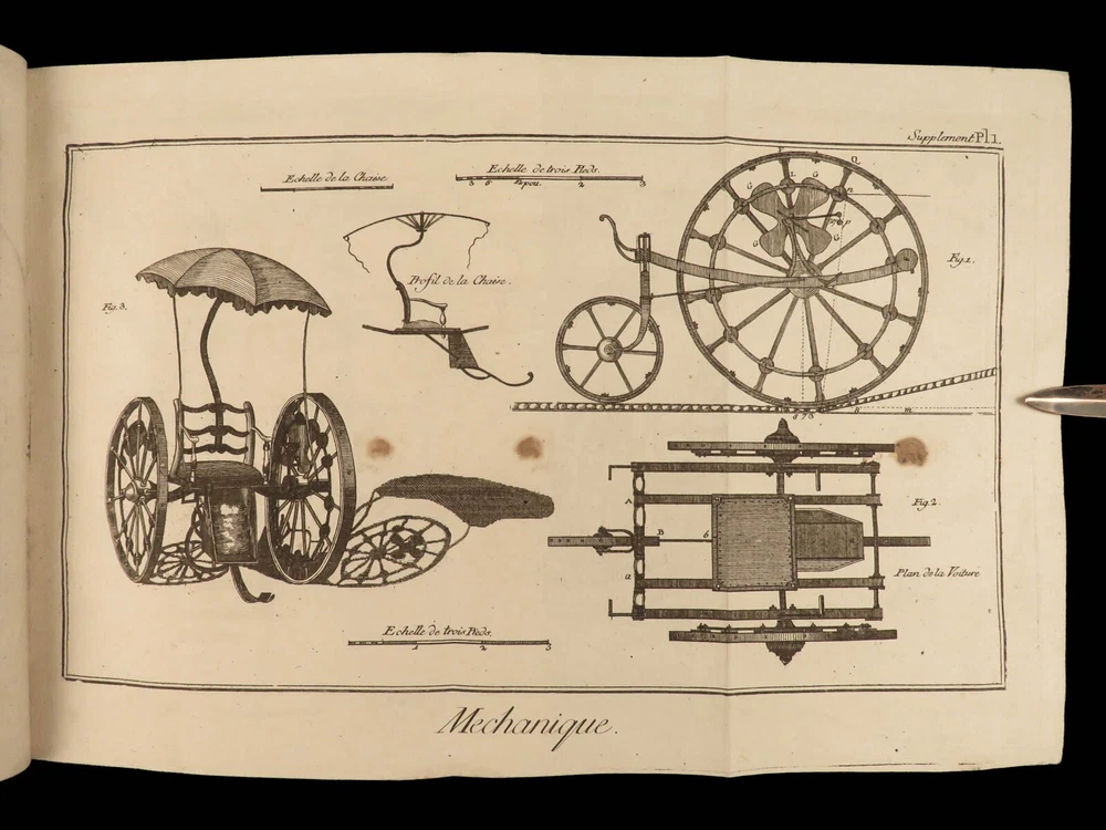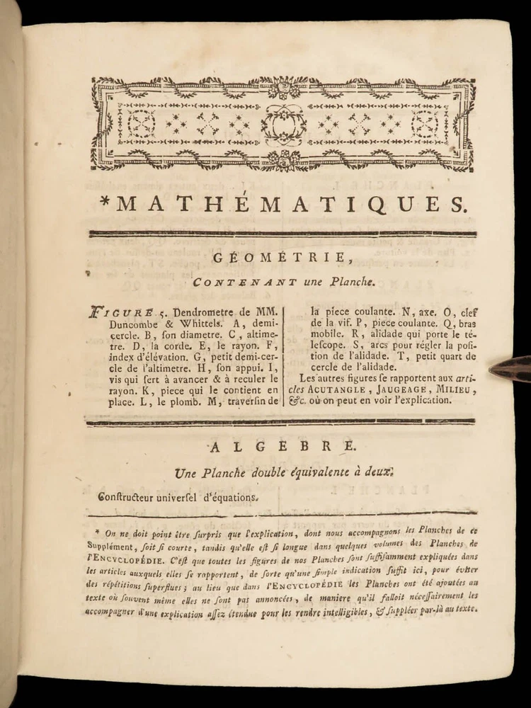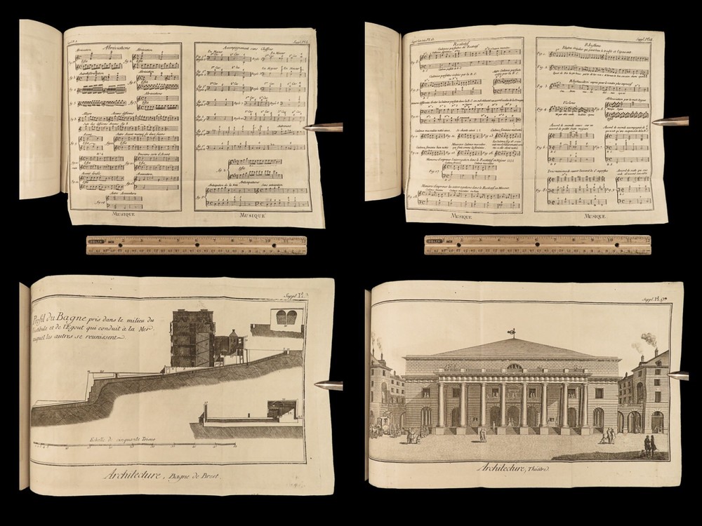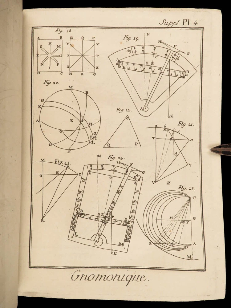 1781 Diderot Encyclopedia Illustrated Mechanics ART of WAR Weapons Architecture The Enlightenment’s most-important general encyclopedia! Through the mid-18 th -century, large collections of knowledge were relegated to specific areas of study like law, medicine, or religion. However, Denis Diderot’s ‘ Encyclopedie’ changed the public’s knowledge base as well as setting a standard for future generations of acquiring knowledge on many different subjects. This was the first encyclopedia to include contributions from many different named writers. It also was the first encyclopedia to describe work-related topics like agriculture, engineering, cooking, and trade. This rare edition is exclusively engravings of the mechanical arts including more than 100 full-page and folding engravings. Each section of the huge engravings is paired with a table describing what it in each illustration. Images in this tome include: · Astronomy · Gnomonics · Music · Geometry · Art of military, weapons · architecture Item number: #23674 Price: $950 DIDEROT, Denis Recueil De Planches, pour la nouvelle edition du dictionnaire raisonne des sciences, …tome III Paris : Briasson; David; Le Breton; Durand, 1781. Details : · Collation: Complete o 56 § Pagination errors expected o 107 exquisite full- and double-page plates! · Language: French · Binding: Leather; secure · Size : ~8.25in X 6.5in (21cm x 16.5cm) Our Guarantee: Very Fast. Very Safe. Free Shipping Worldwide. Customer satisfaction is our priority! Notify us with 7 days of receiving, and we will offer a full refund without reservation! 23674