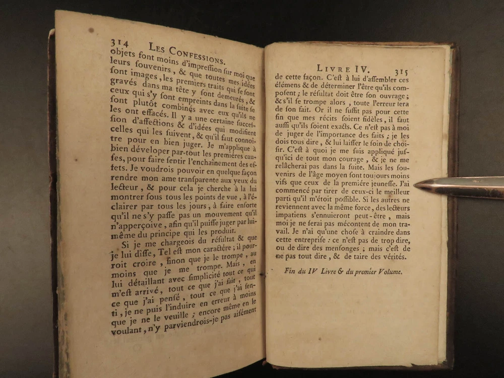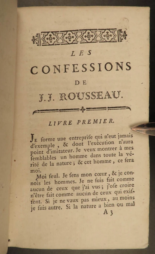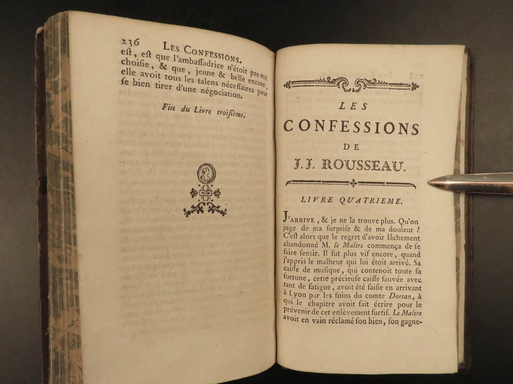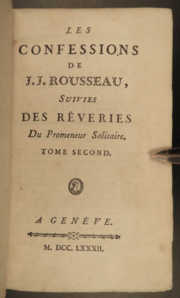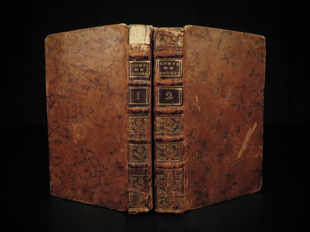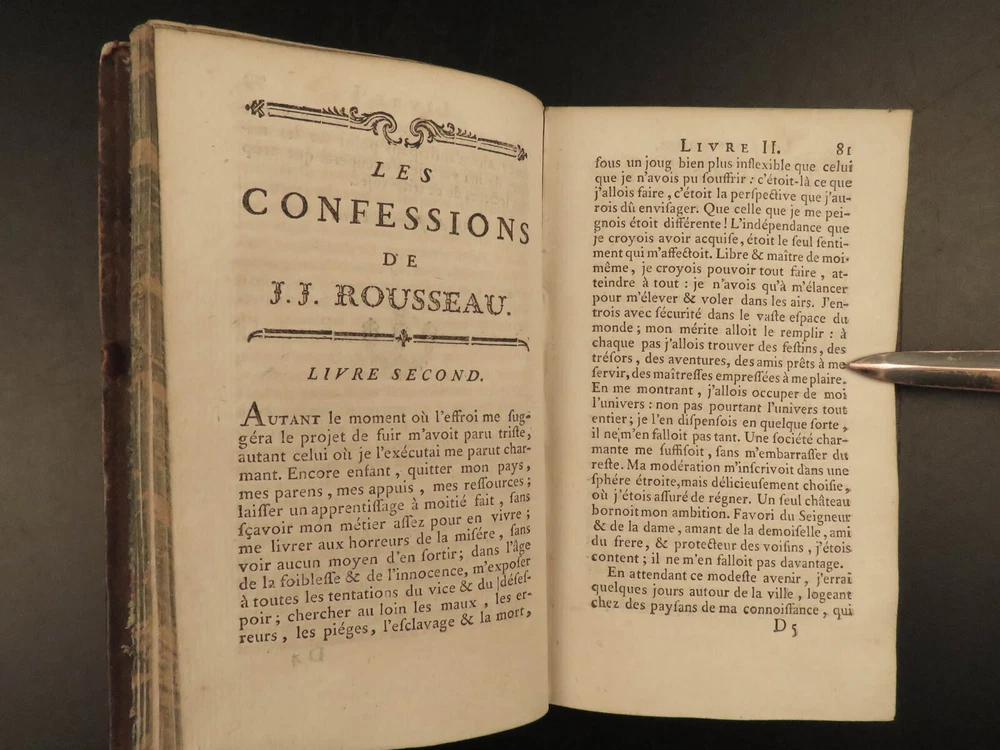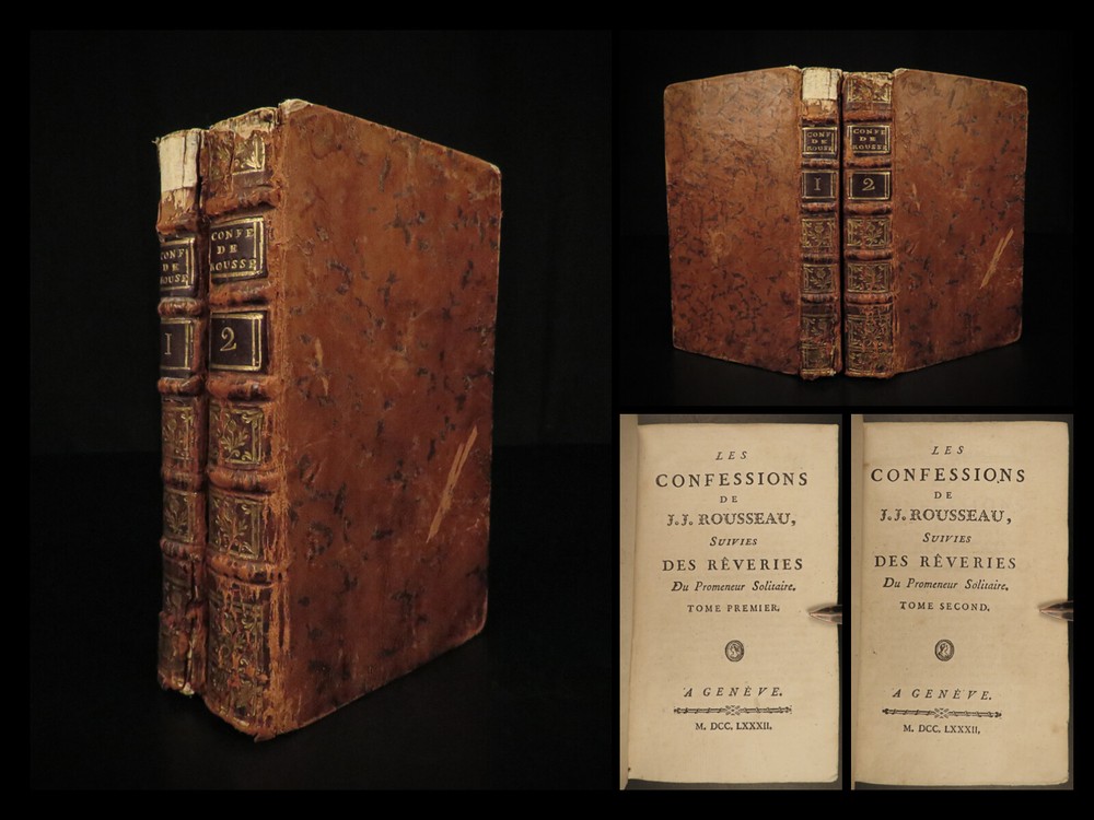 1782 Confessions of Jean-Jacques Rousseau Autobiography Enlightenment Philosophy “People who know little are usually great talkers, while men who know much say little.” ― Jean-Jacques Rousseau Jean-Jacques Rousseau was an 18 th -century Enlightenment philosopher whose political theories helped shape aspects of the French Revolution. His “ Confessions ” is simply his own autobiography. To this point, very few autobiographical works had been written, and, following the success of this work, many other autobiographies were published – a highly influential work! This work discusses Rousseau’s own feelings and outlooks on life, his great shames, successes, and even some controversial parts of his relationship with Therese Levasseur! This 1782 edition of ‘ Confessions’ was published as part of the complete works of Rousseau. Item number: #20578 Price: $599 ROUSSEAU, Jean-Jacques [Collection complete des oeuvres] Les Confessions de J.J. Rousseau A Geneve: 1782. Details : · Collation: Complete with all pages; 2 volumes o Vol. 1 – 315, [1] o Vol. 2 – 387, [1] · Language: French · Binding: Leather; tight and secure · Size : ~6.5in X 4in (16.5cm x 10cm) Our Guarantee: Very Fast. Very Safe. Free Shipping Worldwide. Customer satisfaction is our priority! Notify us with 7 days of receiving, and we will offer a full refund without reservation! 20578