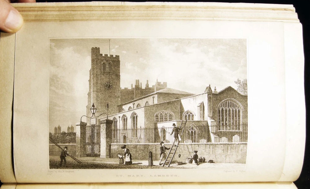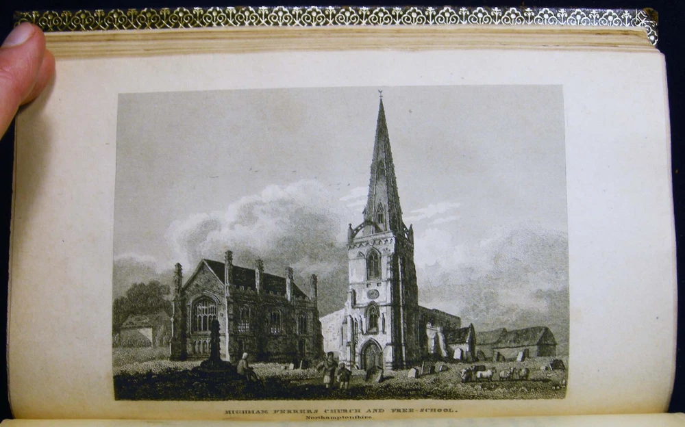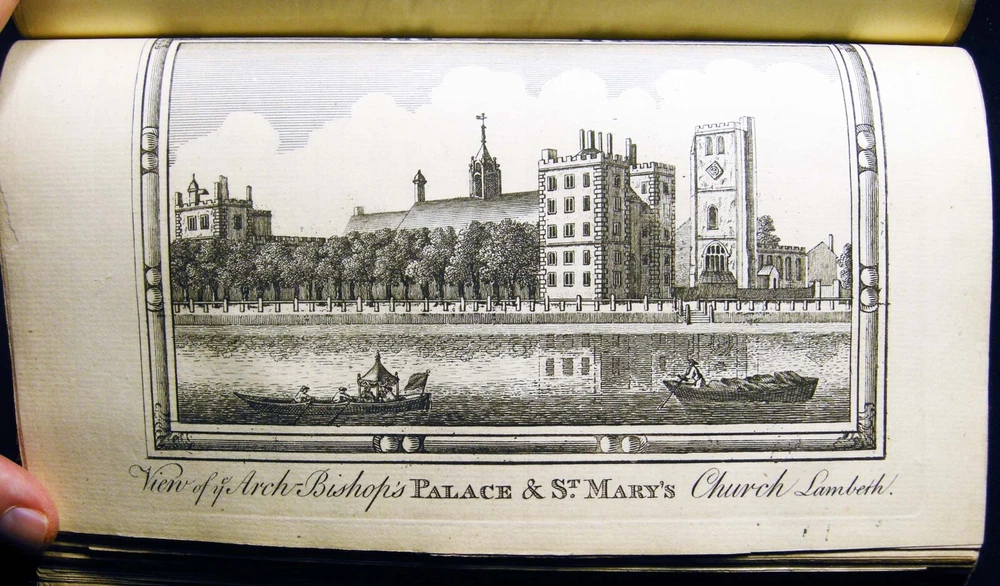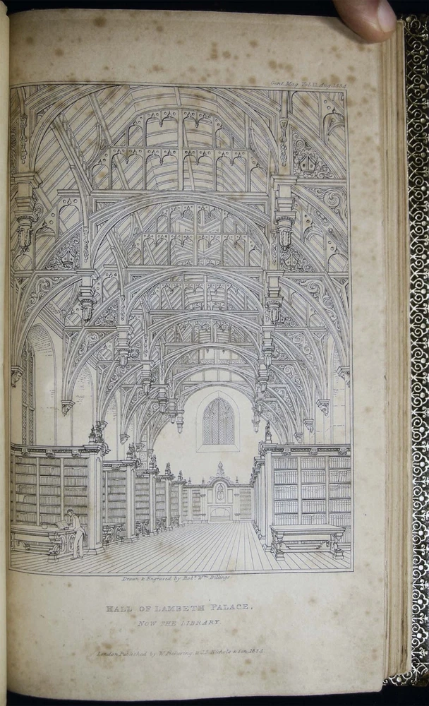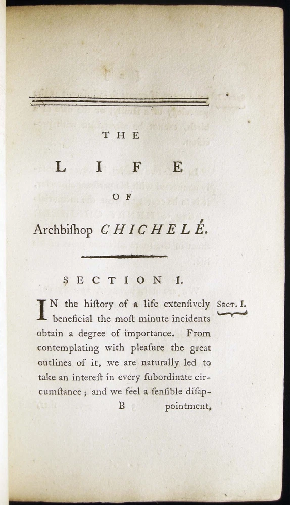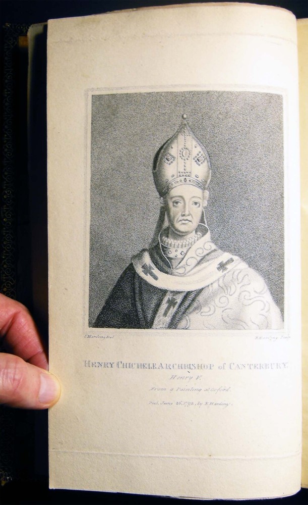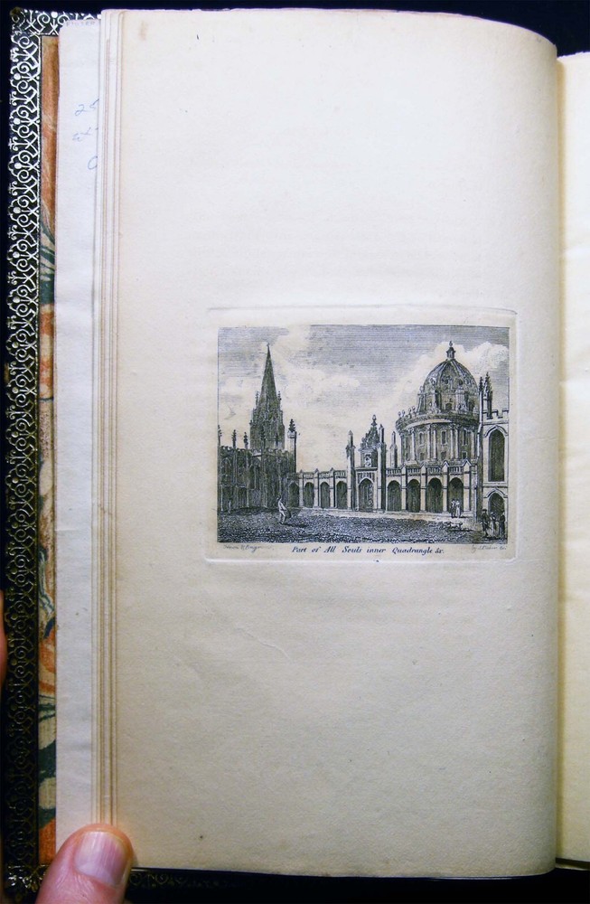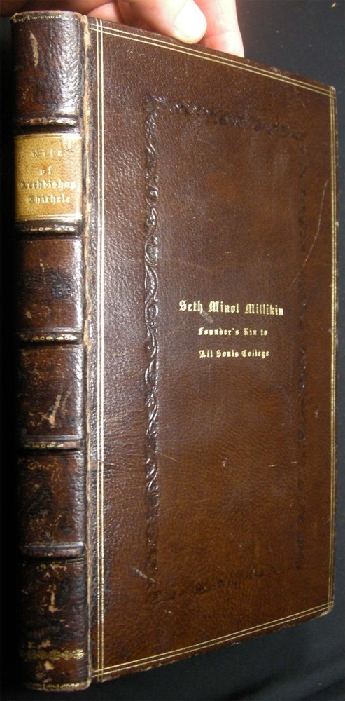 [029460] (United Kingdom - History - Oxford - Henry Chichele). The Life of Henry Chichele, Archbishop of Canterbury, Founder of All Souls College, in the University of Oxford. Extra-Illustrated and Bound By Pfister. London, England: Printed for J. Walter, Charing-Cross, 1783. xi + 232 pages. Illustrated with a frontispiece portrait of Henry Chichele by Harding, dated 1792; also, a Part of All Souls inner Quadrangle &c. by J. Fisher; Highham Ferrers church and free-school Northamptonshire; a View of the Arch-Bishop's Palace & St. Mary's Church Lambeth; the Hall of Lambeth Palace, now the Library by Billings, published by Pickering in 1834 and St. Mary, Lambeth by Higham after Shepherd published by Jones & Co. 1831. Henry Chichele (c. 1362 - 1443) English Administrator and archbishop of Canterbury "...His care extended to the provision of fellowships at his foundation of All Souls College for the founder's kin, though only a few took up the privilege in the fifteenth century...His success made it inevitable that he should be drawn into the service of the English government...Chichele was the third archbishop of Canterbury in succession to take an active role in the leadership of what was effectively an autonomous national church. His first principle was close co-ordination with royal policy, and he continued to be an active member of the council...His long career imparted a cool professionalism to the service of crown and church." (Jeremy Catto in the ODNB) The binding's cover is gilt titled "Seth Minot Millikin Founder's Kin to All Souls College." Approx. 5 1/2" x 9 1/8" size; bound in full polished dark brown morocco leather covered boards; gilt spine titles & band-decorations, marbled endpapers, gilt roll-tool turn-ins; binder's stamp of Pfister on the front endpaper edge. Some edge, tips wear and rubbing to the covers, half-title leaf top corner chipped a bit; a few marginal pencil line-marks, usually marking discussion of the Pynchon family; text block in very good condition.