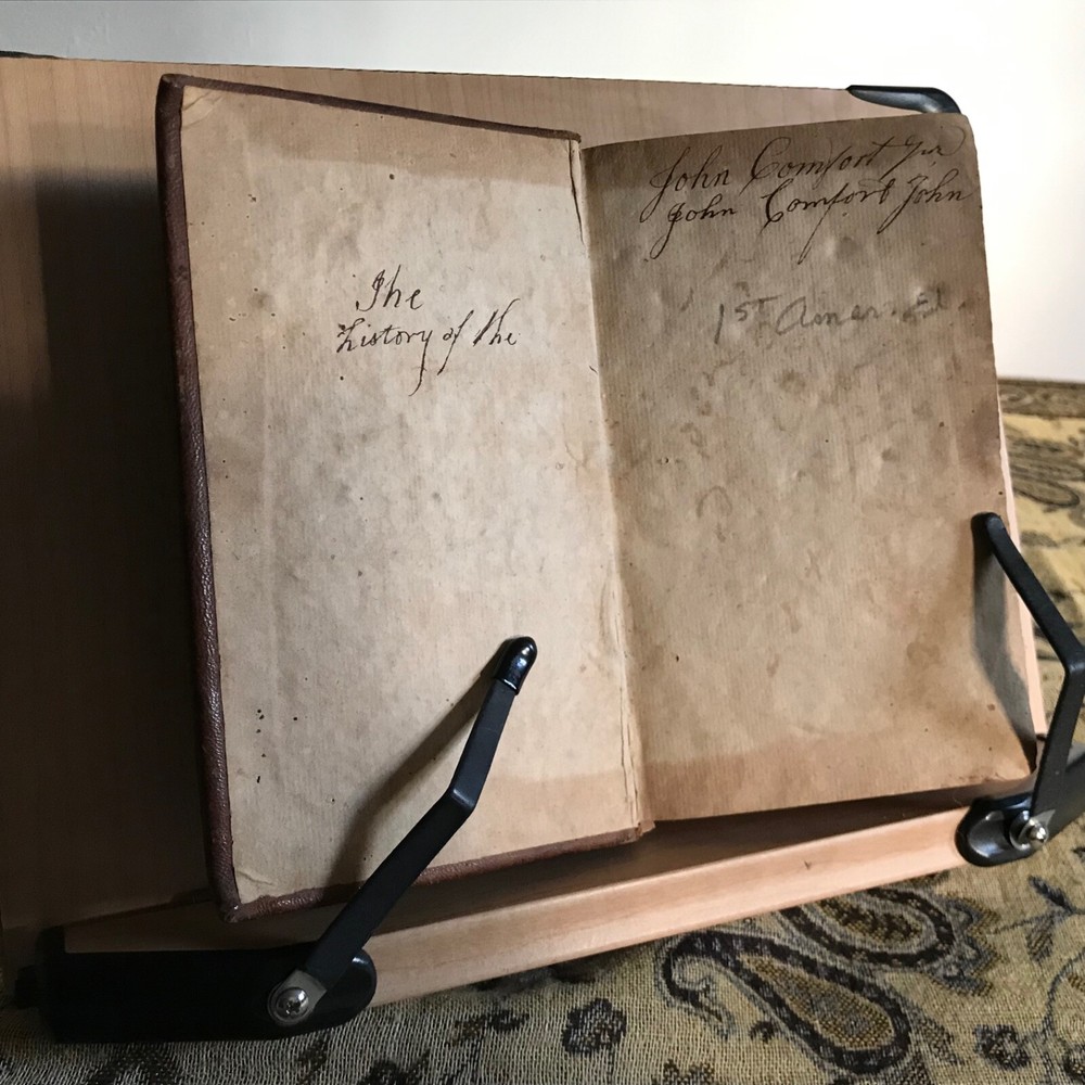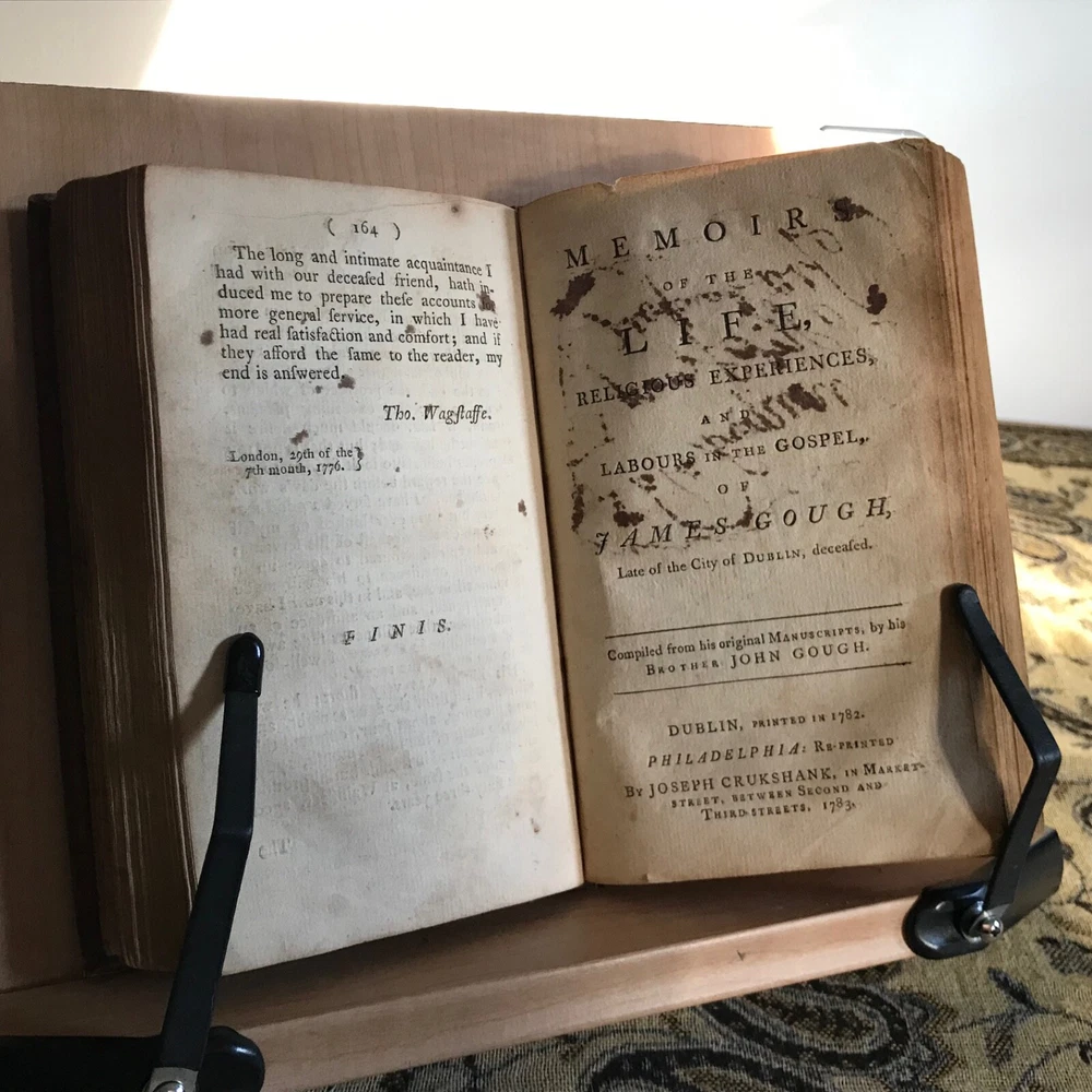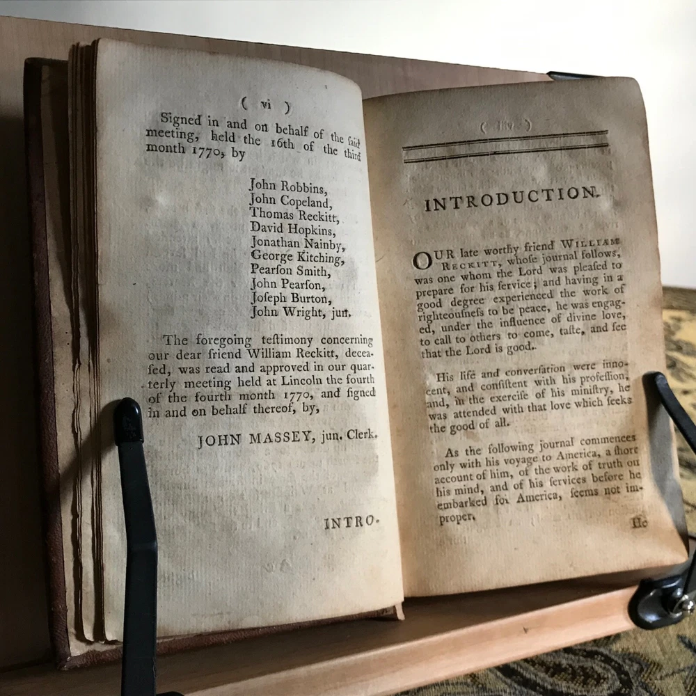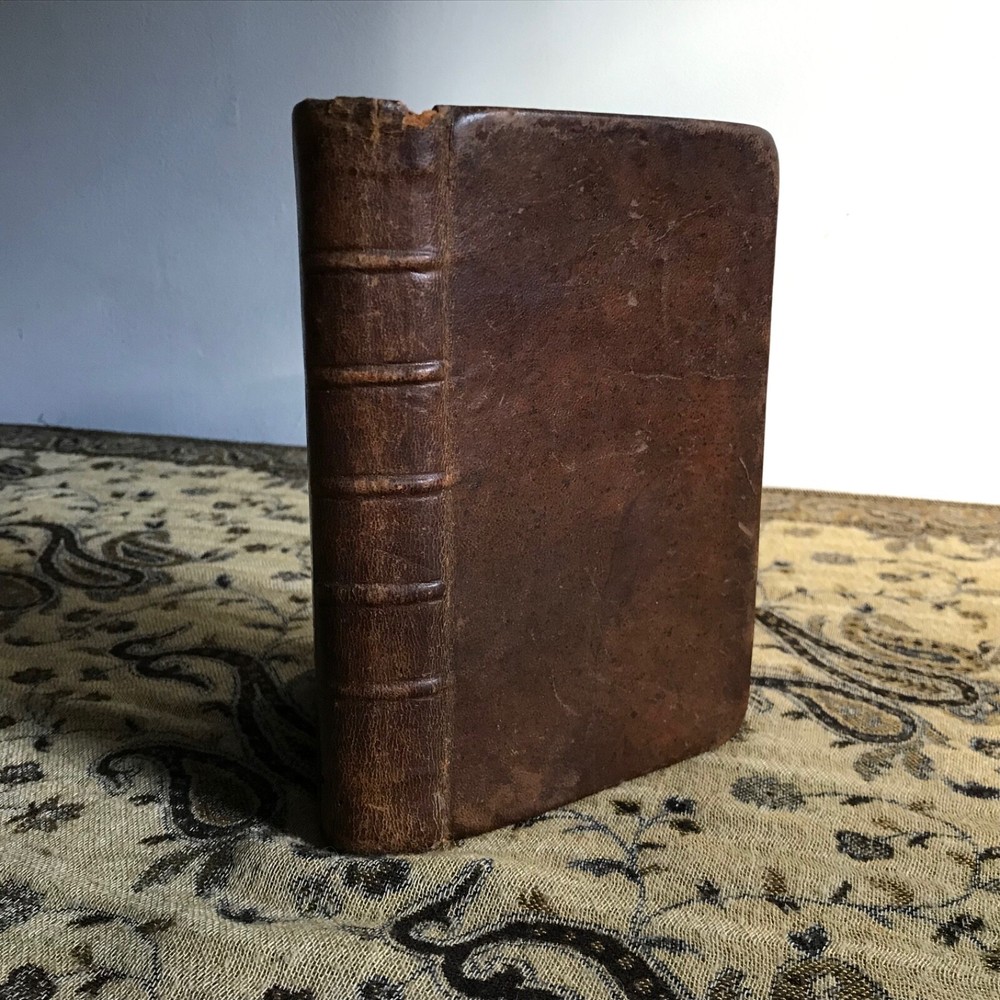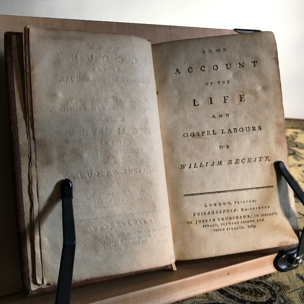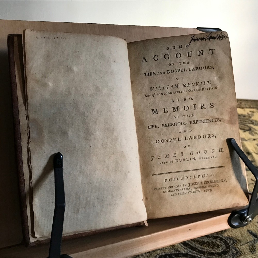 Some Account of the Life and Gospel Labours, of William Reckitt, Late of Lincolnshire in Great-Britain. Also, Memoirs of the Life and Religious Experiences, and Gospel Labours of James Gough, Late of Dublin, Deceased. Printed and Sold by Joseph Crukshank, Philadelphia, 1783, 182 pp plus contents, original leather binding, 7 x 4.25”, 12mo. In good condition. Boards are lightly worn with minor scuffing, edge wear. Corners lightly crushed. Top spine extreme is lightly chipped with small area of red rot. Old hand signature of John Comfort on front fly leaf. Signature is crossed out on title page. 165 pp old hand signature of Fra. Comfort dated 1795.. underneath is Victorian era handwriting. Interior is lightly toned with mild foxing. Slight rippling from previous humidity exposure. Binding tight and intact. Please see photos. Revolutionary Era Imprint of Joseph Crukshank! A scarce title. “ William Reckitt (1706-1769) was born in Lincolnshire to honest parents, both of whom died when he was very young. When an adolescent, serving as an apprentice to weaver, he was convinced of the Truth through the ministry of a Friend on a religious visit, and by diligently harkening to the Light of Christ that shined in his heart, he was preserved from the many temptations to which unguarded youth are commonly exposed. In 1742, at the age of thirty-six, he first came forth in the work of the ministry, and in 1756, when en route to America, he and several others on board were taken captive by a French privateer and brought to Morlaix. There he was detained for about six months, but was preserved throughout in remarkable quietness and resignation, to the great admiration of some of the French inhabitants.” RAREA1783BFJK