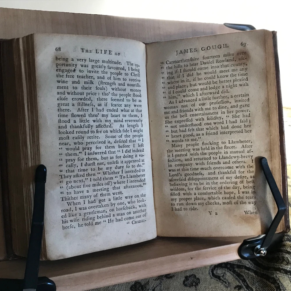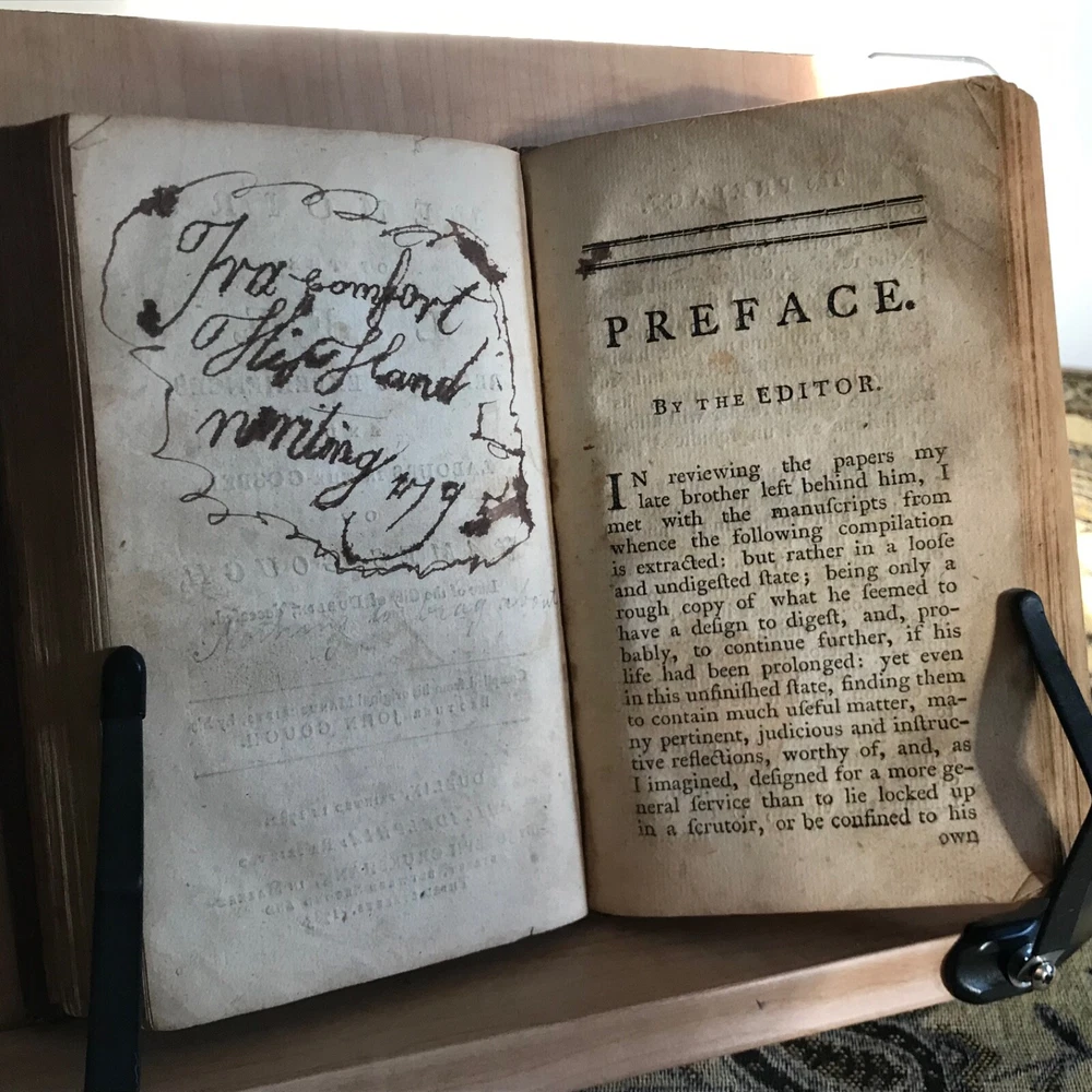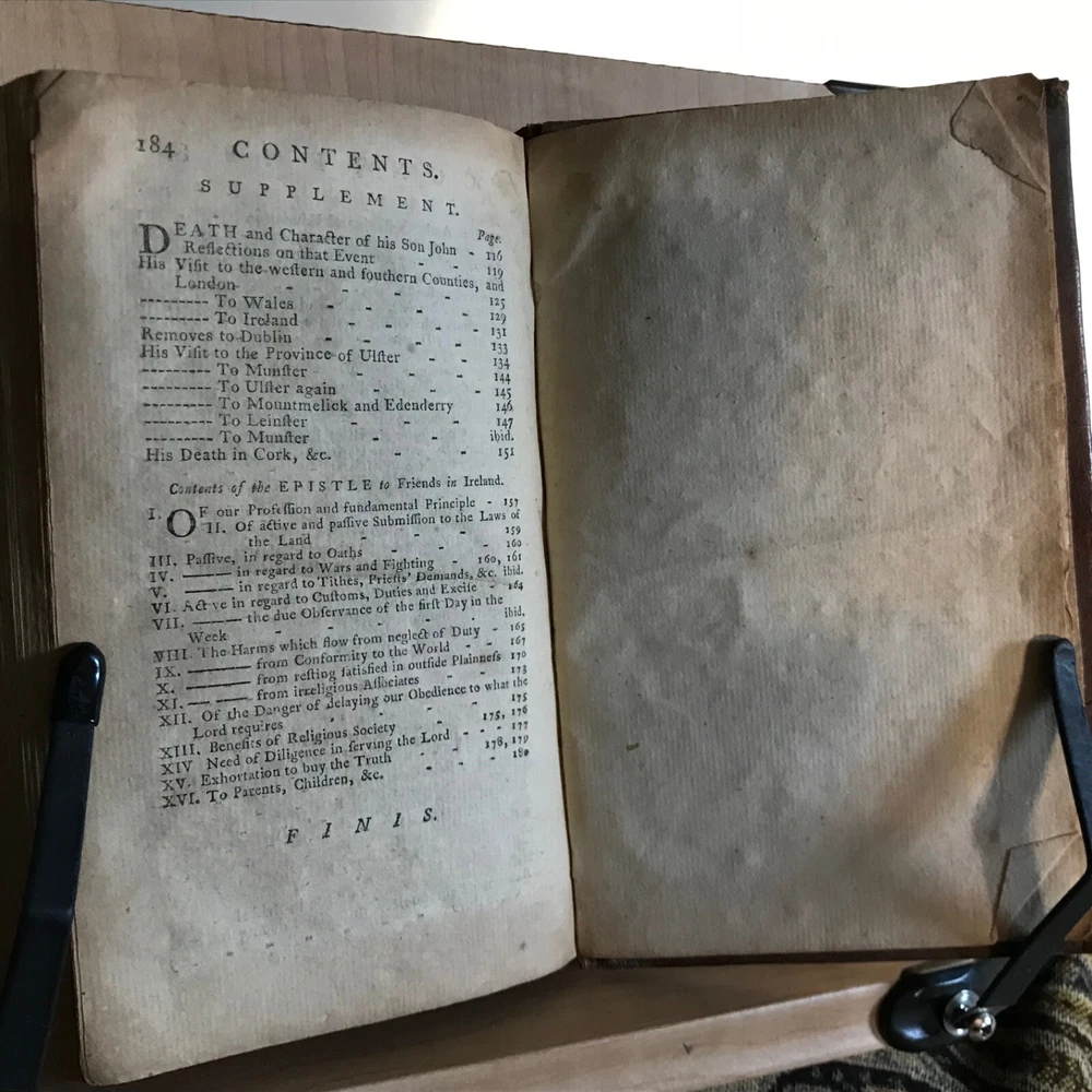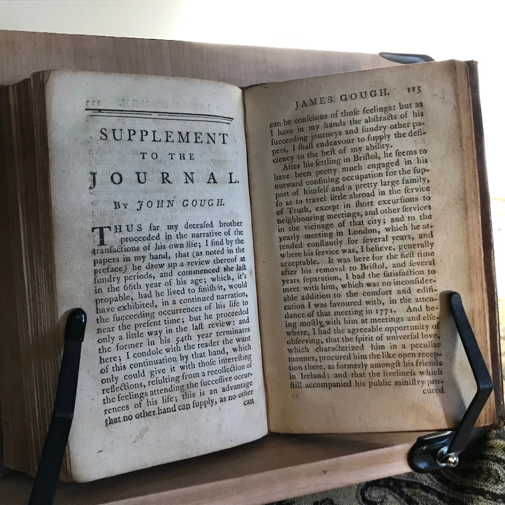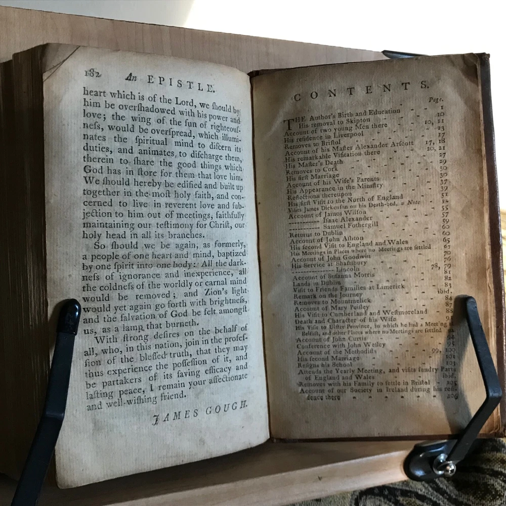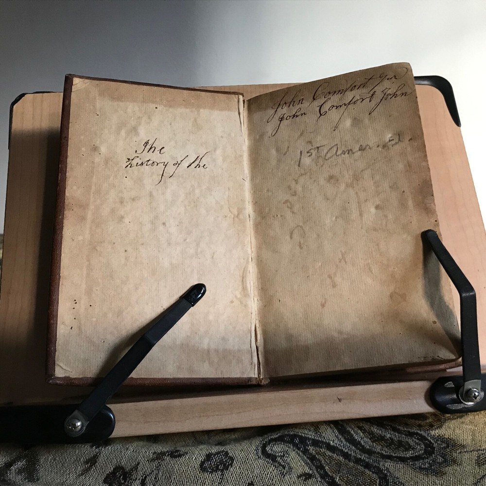 Some Account of the Life and Gospel Labours, of William Reckitt, Late of Lincolnshire in Great-Britain. Also, Memoirs of the Life and Religious Experiences, and Gospel Labours of James Gough, Late of Dublin, Deceased. Printed and Sold by Joseph Crukshank, Philadelphia, 1783, 182 pp plus contents, original leather binding, 7 x 4.25”, 12mo. In good condition. Boards are lightly worn with minor scuffing, edge wear. Corners lightly crushed. Top spine extreme is lightly chipped with small area of red rot. Old hand signature of John Comfort on front fly leaf. Signature is crossed out on title page. 165 pp old hand signature of Fra. Comfort dated 1795.. underneath is Victorian era handwriting. Interior is lightly toned with mild foxing. Slight rippling from previous humidity exposure. Binding tight and intact. Please see photos. Revolutionary Era Imprint of Joseph Crukshank! A scarce title. “ William Reckitt (1706-1769) was born in Lincolnshire to honest parents, both of whom died when he was very young. When an adolescent, serving as an apprentice to weaver, he was convinced of the Truth through the ministry of a Friend on a religious visit, and by diligently harkening to the Light of Christ that shined in his heart, he was preserved from the many temptations to which unguarded youth are commonly exposed. In 1742, at the age of thirty-six, he first came forth in the work of the ministry, and in 1756, when en route to America, he and several others on board were taken captive by a French privateer and brought to Morlaix. There he was detained for about six months, but was preserved throughout in remarkable quietness and resignation, to the great admiration of some of the French inhabitants.” RAREA1783BFJK