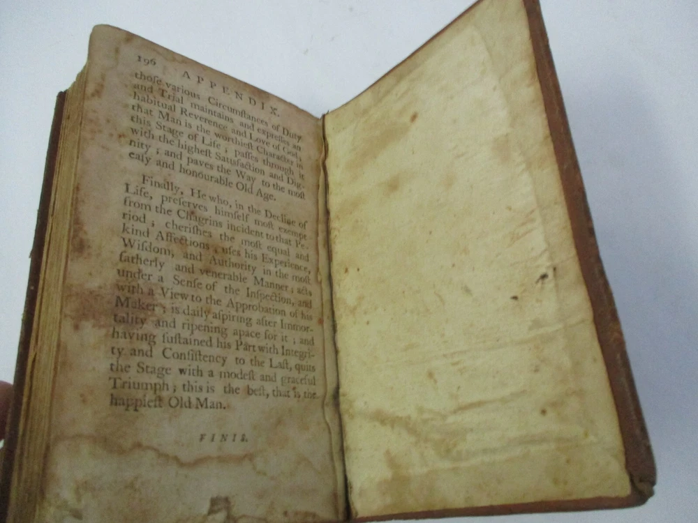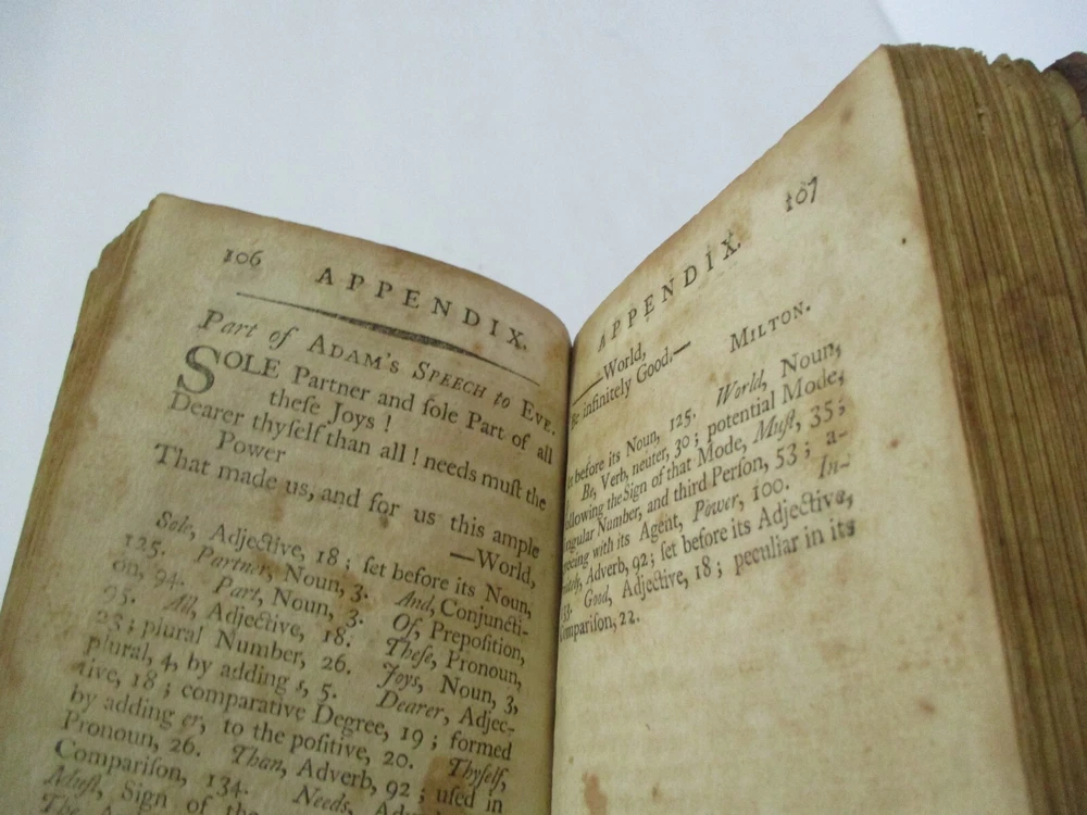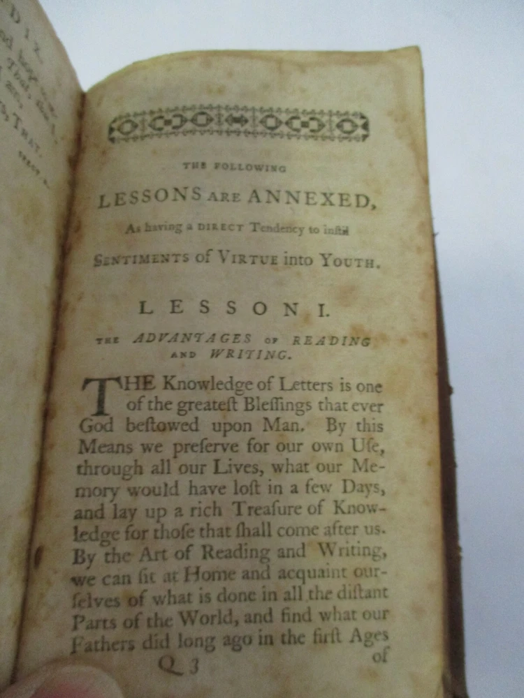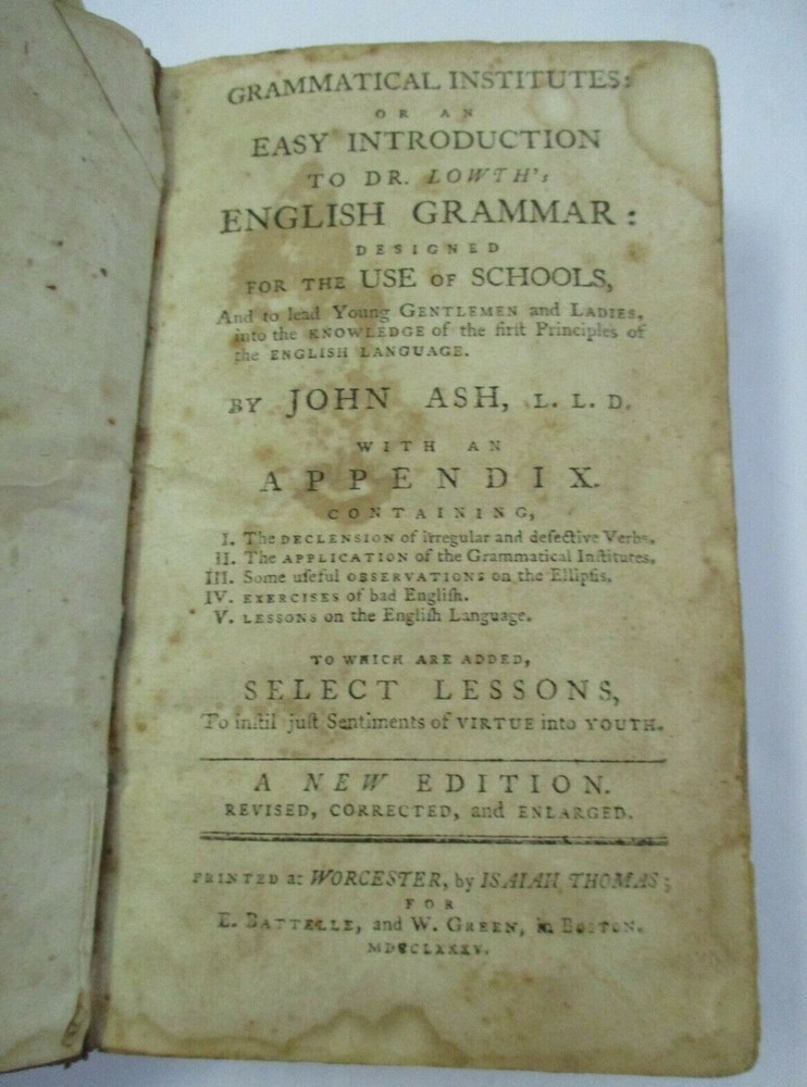 Revised, corrected and enlarged edition, printed at Worcester by Isaiah Thomas, measures 5 3/4 x 3 5/8 inches with leather binding, raised spine bands, 196 pages, appendix and select lessons. Rare. Thank you.
