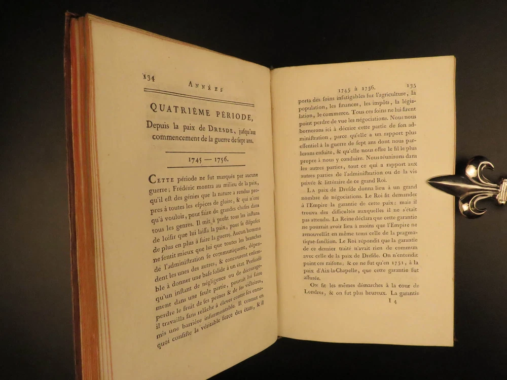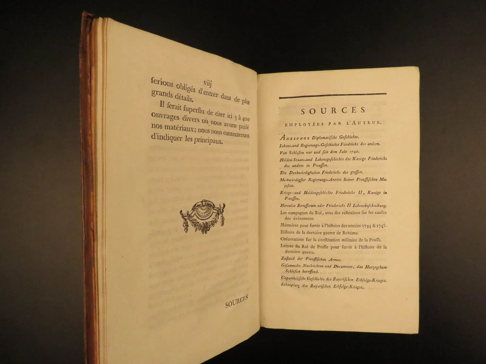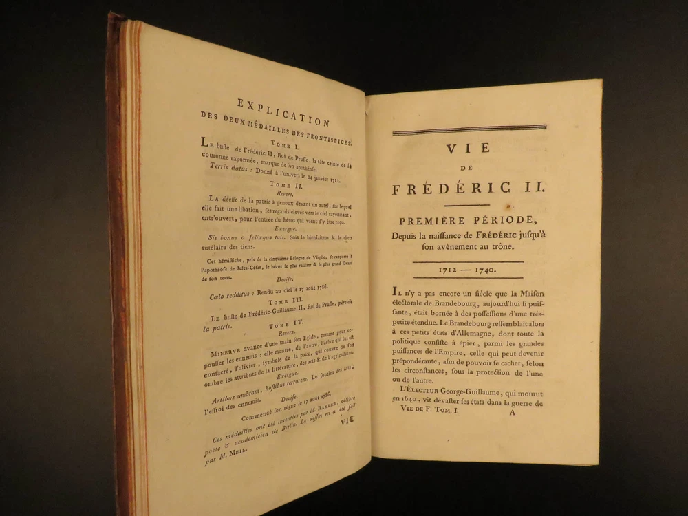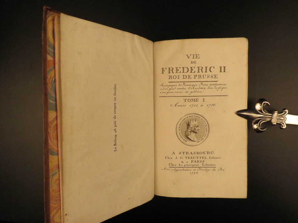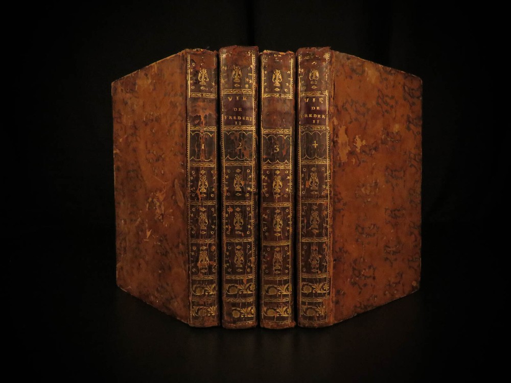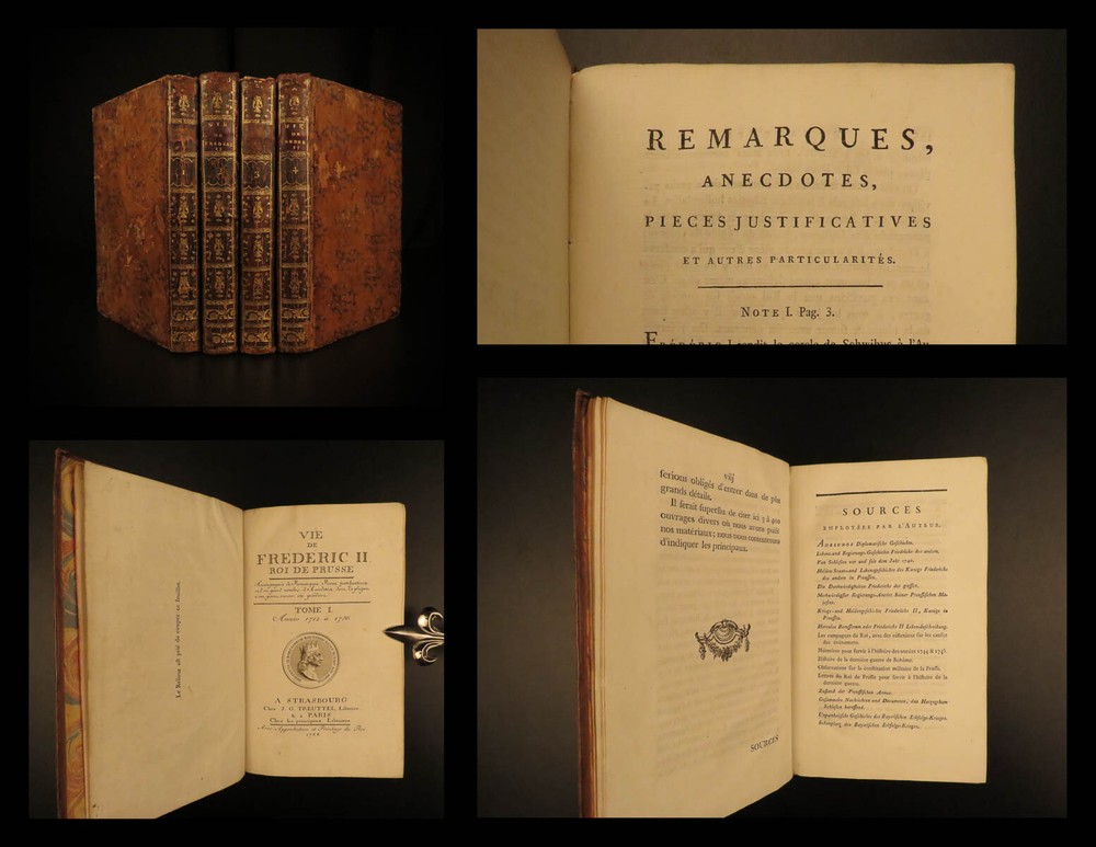 1788 Life of Frederick II of Prussia Germany WARS Austria Politics 4v Laveaux “The first object in the establishment of an army ought to be making provision for the belly, that being the basis and foundation of all operations – Frederick the Great Frederick II was the most famous King of Prussia, notable for his 46 years of reign. He served and ruled over Brandenburg-Prussia and was as significant force in the Wars of Polish and Austrian Succession. Frederick himself invited French historian Jean-Charles Laveaux to embark on a substantial work on the history of the Prussian monarchy (of course, Frederick II was the most important facet of that monarchy). This time spent with Frederick II allowed Laveaux to publish three different works surrounding the life and reign of Frederick II. ‘ Life of Frederick II, King of Prussia ’ includes documents, speeches, anecdotes, and first-hand experiences covering the life and eventual death of ‘Old Fritz’. Item number: #11552 Price: $550 LAVEAUX, Jean-Charles Vie De Frederic II., Roi De Prusse Strasbourg : Treuttel, 1788. Details : · Collation: Complete with all pages; 4 volumes o Vol. 1 – Years 1712-1756 § xii, 292, [2] o Vol. 2 – Years 1756-1763 § 358, [10] o Vol. 3 – Administration from 1772-1785 § 336 o Vol. 4 – Private life and literature § 256, 87, [5] · Provenance: Bookplate – Benj m . de Boulongne Jun r . · Language: French · Binding: Leather; tight & secure · Size : ~8in X 5in (20cm x 13cm) Our Guarantee: Very Fast. Very Safe. Free Shipping Worldwide. Customer satisfaction is our priority! Notify us with 7 days of receiving, and we will offer a full refund without reservation! 11552