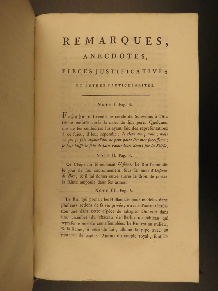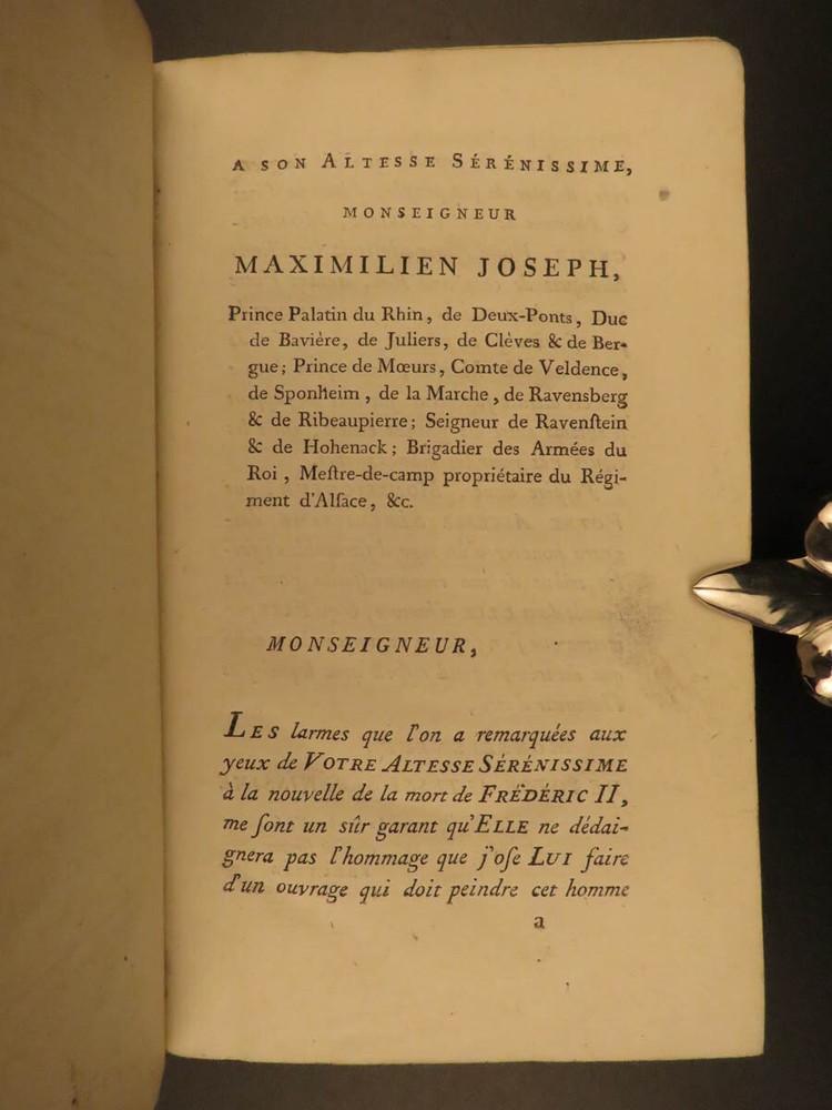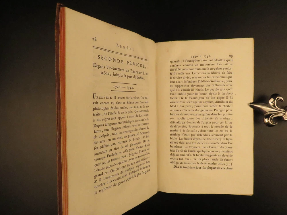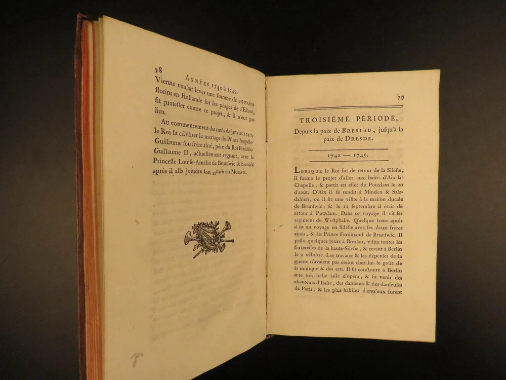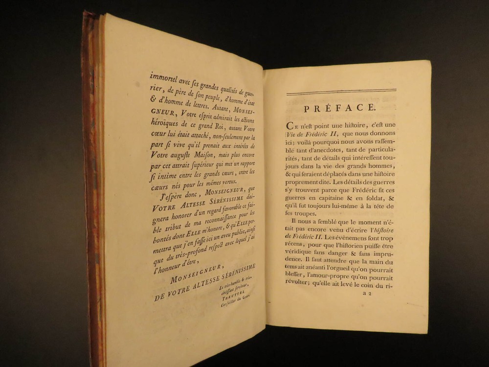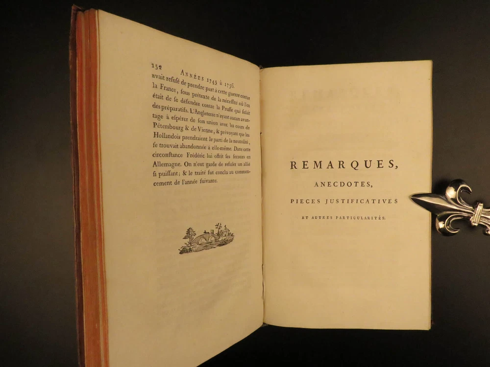 1788 Life of Frederick II of Prussia Germany WARS Austria Politics 4v Laveaux “The first object in the establishment of an army ought to be making provision for the belly, that being the basis and foundation of all operations – Frederick the Great Frederick II was the most famous King of Prussia, notable for his 46 years of reign. He served and ruled over Brandenburg-Prussia and was as significant force in the Wars of Polish and Austrian Succession. Frederick himself invited French historian Jean-Charles Laveaux to embark on a substantial work on the history of the Prussian monarchy (of course, Frederick II was the most important facet of that monarchy). This time spent with Frederick II allowed Laveaux to publish three different works surrounding the life and reign of Frederick II. ‘ Life of Frederick II, King of Prussia ’ includes documents, speeches, anecdotes, and first-hand experiences covering the life and eventual death of ‘Old Fritz’. Item number: #11552 Price: $550 LAVEAUX, Jean-Charles Vie De Frederic II., Roi De Prusse Strasbourg : Treuttel, 1788. Details : · Collation: Complete with all pages; 4 volumes o Vol. 1 – Years 1712-1756 § xii, 292, [2] o Vol. 2 – Years 1756-1763 § 358, [10] o Vol. 3 – Administration from 1772-1785 § 336 o Vol. 4 – Private life and literature § 256, 87, [5] · Provenance: Bookplate – Benj m . de Boulongne Jun r . · Language: French · Binding: Leather; tight & secure · Size : ~8in X 5in (20cm x 13cm) Our Guarantee: Very Fast. Very Safe. Free Shipping Worldwide. Customer satisfaction is our priority! Notify us with 7 days of receiving, and we will offer a full refund without reservation! 11552