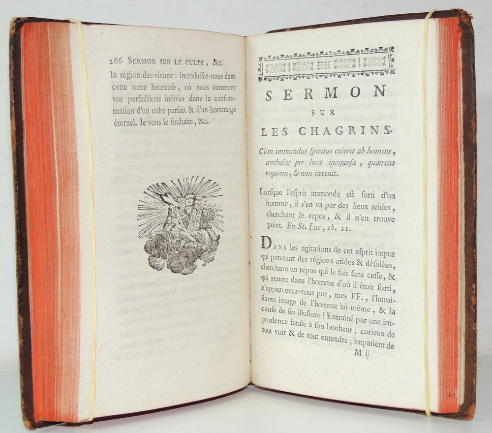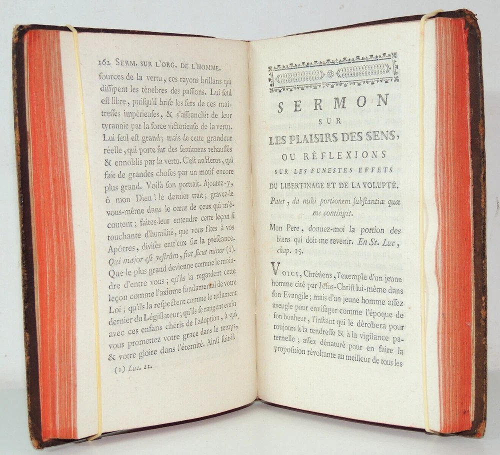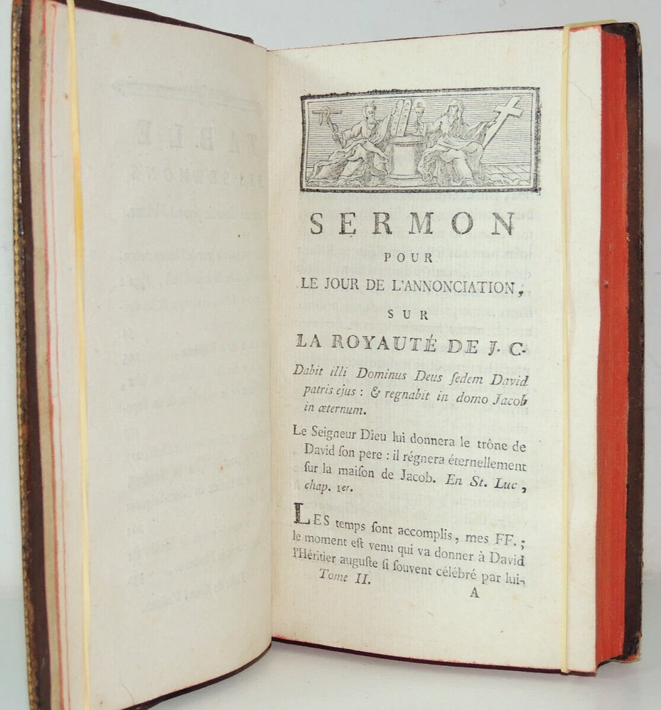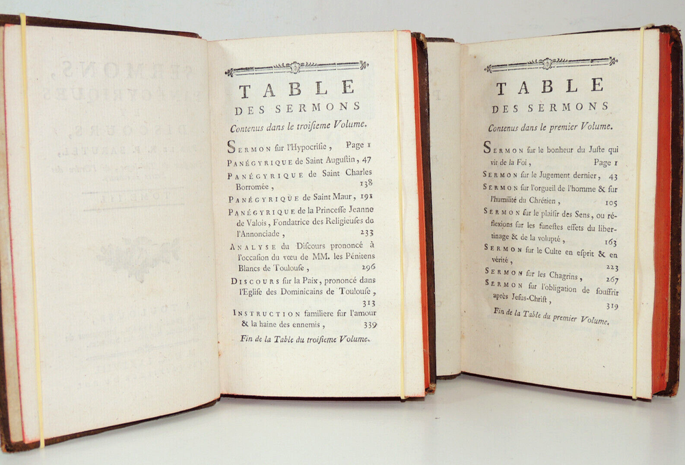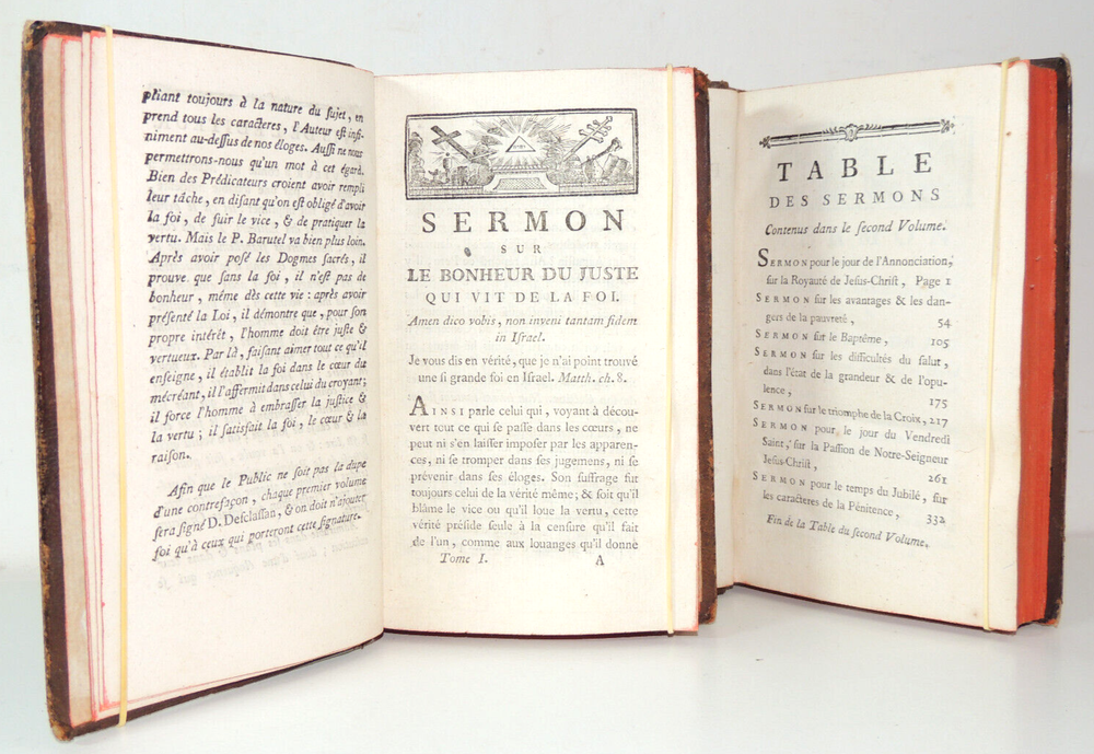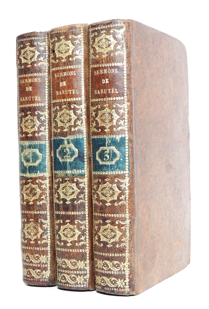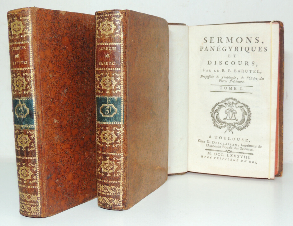 RP BARUTEL. "Sermons, Panégyriques et Discours" Bien complet des trois tomes, cet ensemble des textes de Barutel est rare. De l'ordre des Frères prêcheurs (Dominicains), le Père Barutel nous livre ici sa pensée : les premier et second volumes sont consacrés aux sermons, le troisième au sermon sur l'hypocrisie, aux panégyriques de Saint Augustin, de Saint Maur, de la princesse Jeanne de Valois, au discours prononcé lors des vœux des pénitents blancs de Toulouse, et à son discours sur la Paix Reliures pleine basane époque, 18x11, legs. frottement aux bords et coins, dos lisse superbement orné. Très beaux exemplaires, bien frais, 390, 390 & 368pp. A Toulouse, chez Desclassans, 1788. ref/25/2.