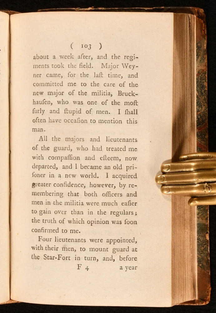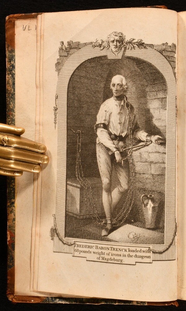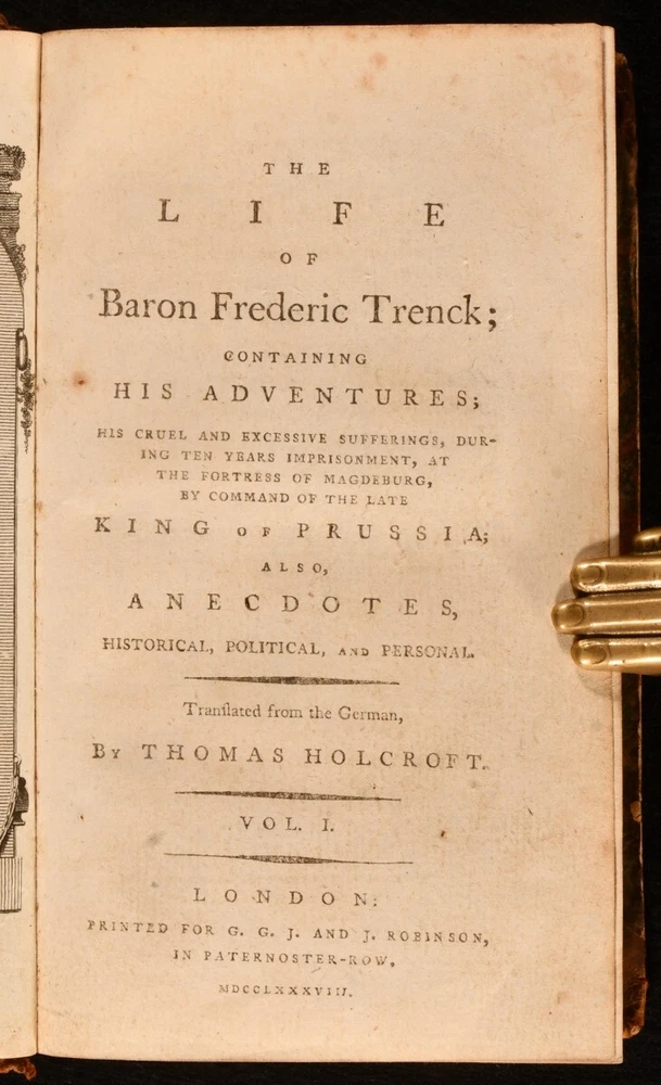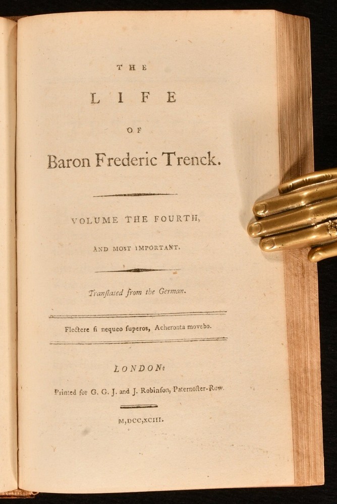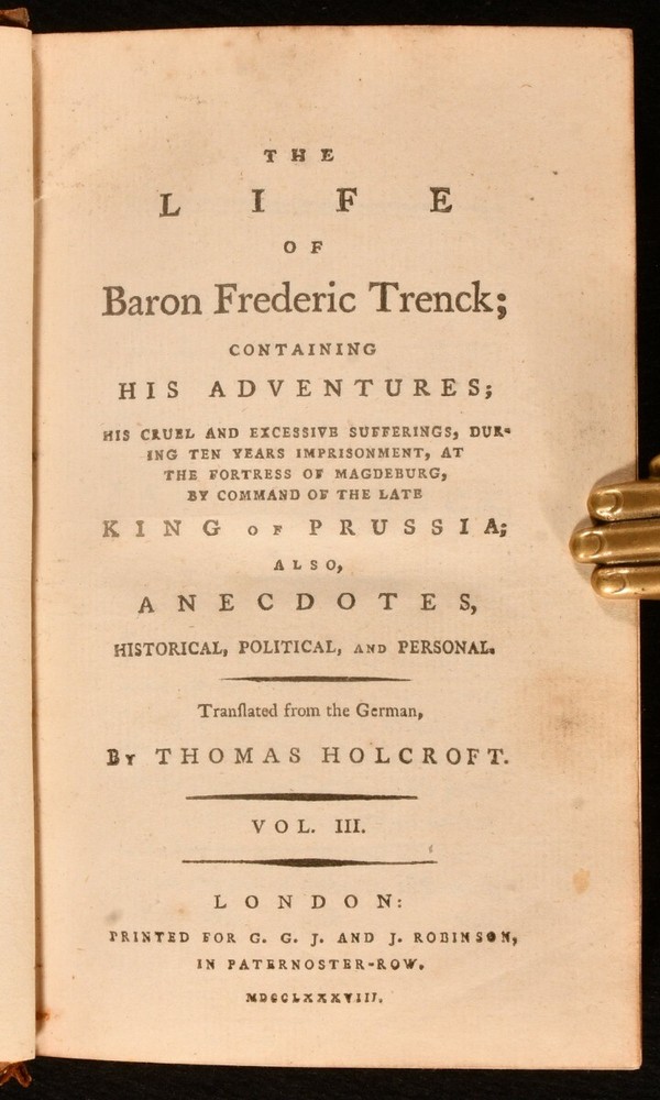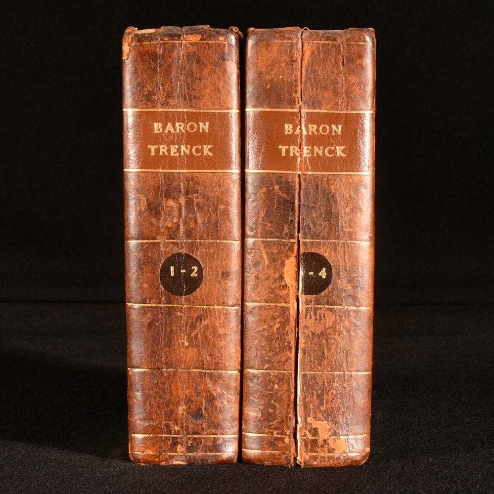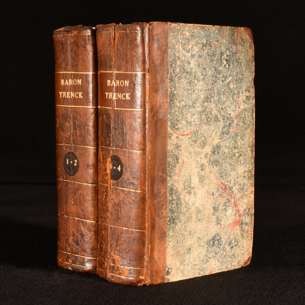 Click here to see our other books! The Life of Baron Frederic Trenck Friedrich von der Trenck; Thomas Holcroft [trans.] 1788-1793 G.G. and J. Robinson : London 7.5" by 5" viii [1], 2-380; 352; 336; 424pp SUMMARY The very scarce four volume first English language translation of the autobiography of Prussian officer Baron Friedrich von der Trenck. First Edition,Leather Binding,Very Scarce Overall Condition: Good Only This book weighs 1.5 KG when packed UK Postage: £ 3.99 US Postage: £ 23.99 EU Postage : £ 18.99 European Postage: £ 19.99 Asia Postage: £ 31.99 Worldwide Postage: £ 32.99 DESCRIPTION With all four volumes of the very scarce first edition present, including the exceedingly uncommon fourth volume. With volumes I-III published in 1788 (ESTC T118999), and volume IV published in 1793 (ESTC T118998). Baron Frederic Trenck was a cunning soldier who served the Kind of Prussia, Frederick the Great. Trenck's wild behaviour landed him into Magdeburg prison, where he spent for ten years. Upon his release, he travelled to Paris to watch the revolution, only to be guillotined two days before Robespierre, in response to rumours that he was an Austrian spy. English dramatist and poet translated Trenck's work into English. Illustrated with an engraved frontispiece to volume I. Bound without publisher's advertisements. CONDITION In half calf bindings, with marbled paper covered boards. Rubbing to back strip heads and tails and board perimeters. Head of front joints and head of rear joint of volume III-IV starting, with boards holding firm. Lacking half of one volume number label. Back strip and text block of volume III-IV vertically split in two, between pages 96 and 97 of volume IV. Otherwise, internally firmly bound. Pages bright and generally clean, with only the odd spot. Overall Condition: Good Only GLOSSARY OF TERMS Overall Condition (Dustwrapper condition rating is shown after that for the book itself, where a dustwrapper is present) Fine - Very well preserved copy showing very little wear Very Good Indeed - Only one or two minor faults, really a very attractive copy Very Good - Quite a wide term meaning no major faults but probably several smaller ones often expected given the age of the book, but still a respectable copy Good - Meaning not very good. Some more serious faults as will be described in the condition report under 'condition' Good Only - Meaning one or more faults that could really do with repair Fair - As with good only above but with other faults leaving a compromised copy even after repair Poor - Really bad and possibly seriously incomplete. We only sell books in this condition where their rarity or value makes them attractive none the less. Major defects will be described. GUARANTEE We offer a full money back guarantee on our descriptions. Please ask for details and conditions. We prefer PAYPAL. If you pay via PAYPAL we will post the item off the same or the next working day with the postage you have selected. Please note we cannot accept USD cheques