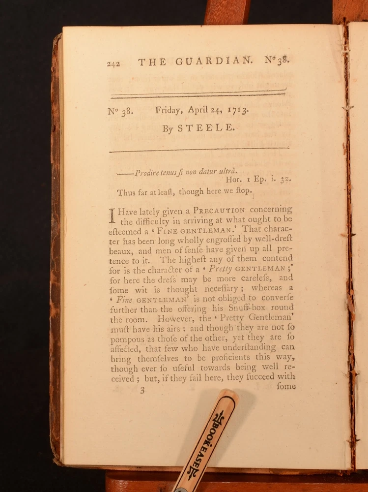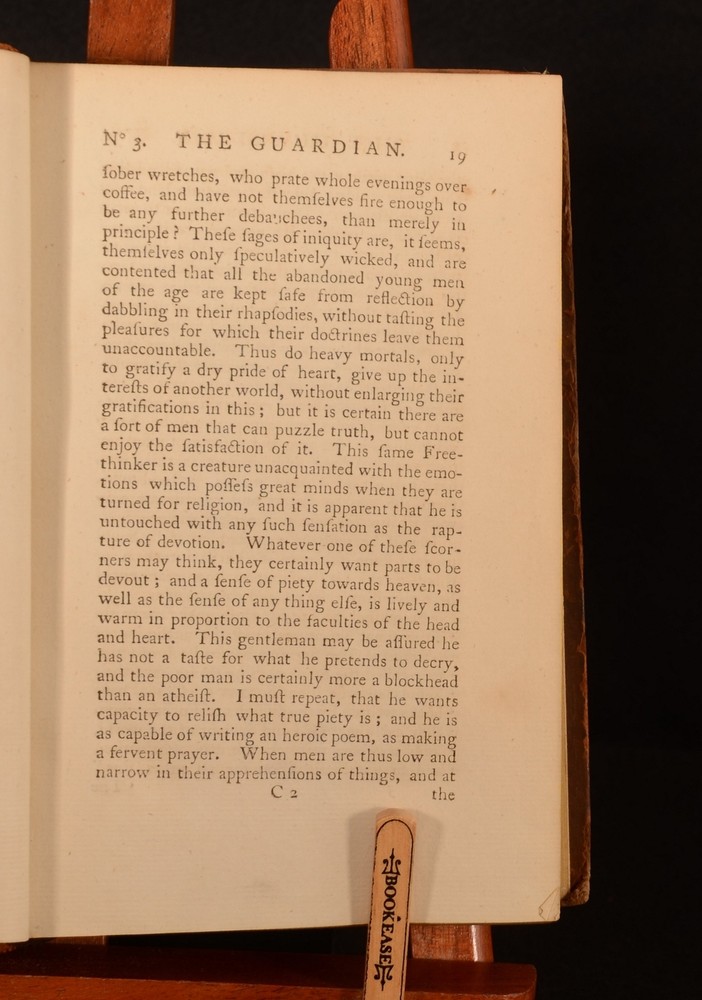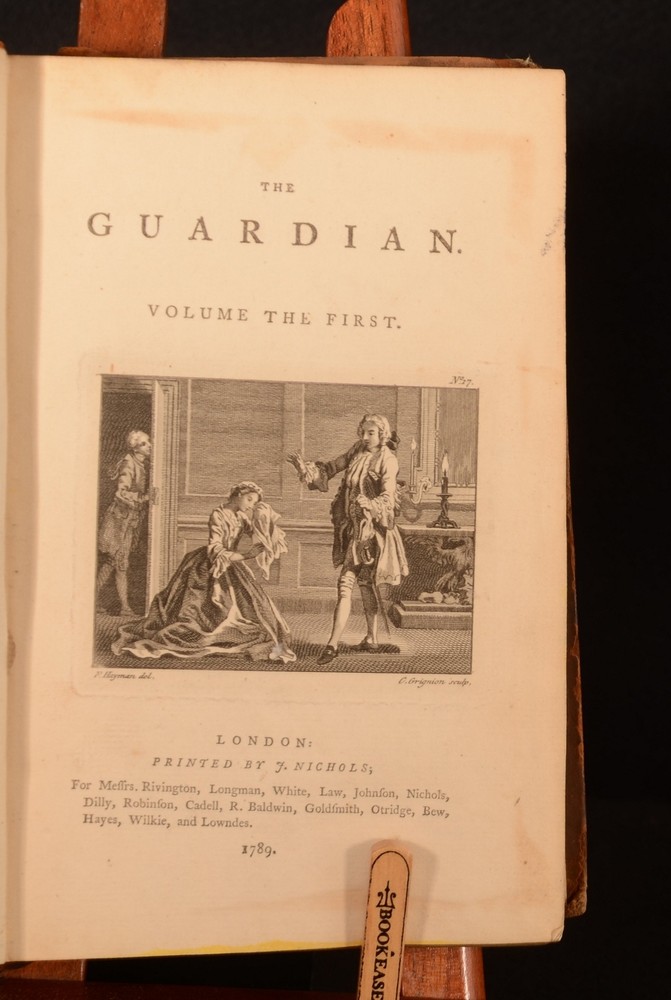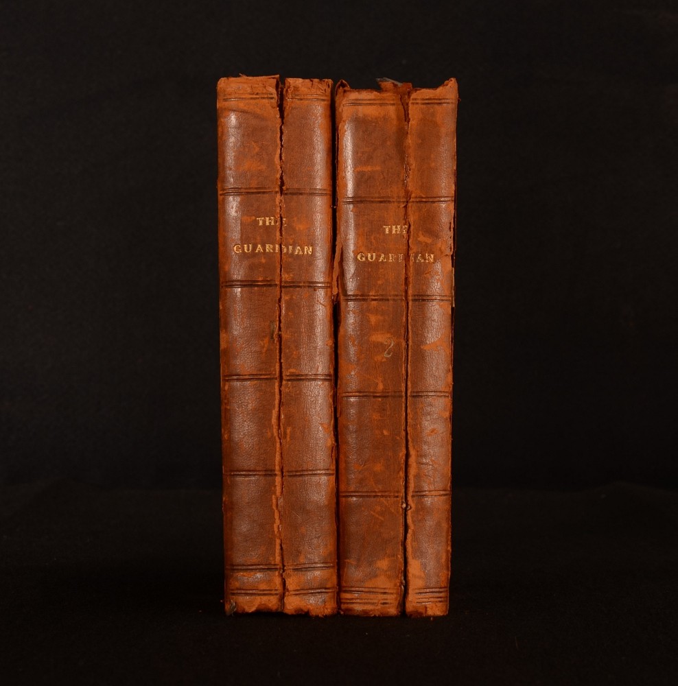 Click here to see our other books! The Guardian Various 1789 Rivington; et al : London 8.5" by 5.5" iv, 571pp; 600pp SUMMARY A set of the essays originally published in 'The Guardian' newspaper, founded by Richard Steele. Leather Binding Overall Condition: Fair This book weighs 2 KG when packed UK Postage: £ 3.99 US Postage: £ 29.99 EU Postage : £ 21.99 European Postage: £ 23.99 Asia Postage: £ 37.99 Worldwide Postage: £ 38.99 DESCRIPTION Complete in two volumes. 'The Guardian' was a short-lived newspaper that was published from 12th March 1713 to the 1st October 1713. The newspaper was founded by Richard Steele, and had contributions from his friend and colleague Joseph Addison. Other contributors include Thomas Tickell, Alexander Pope, and Ambrose Philips. With illustrations to the title page. Richard Steele was an Irish politician and playwright. He was a member of the Kit-Kat Club, an English Whig club with strong literary and political associations. His first successful play was 'The Funeral', which was performed at Drury Lane. Joseph Addison was an essayist, politician and playwright. He also held form the Kit-Kat Club, which renewed his friendship with Richard Steele, whom he at met at Charterhouse School. His most famous work was 'Cato, a Tragedy', a successful play about Marcus Porcius Cato Uticensis. Addison and Steele founded several publications during their friendship, including the daily publication 'The Spectator', which ran from 1711 to 1712. CONDITION In the original calf binding. Externally, with slight cracks to the spines. Leather to the spines is lifting. Light marks to the boards. Some rubbing and bumping to the extremities. Front board of Volume II may detach with further handling. Rear joint of Volume II is starting but firm. Internally, generally firmly bound due to the cracks to the spines. Pages are lightly age-toned with some scattered spots, mostly to the first and last few pages. Overall Condition: Fair GLOSSARY OF TERMS Overall Condition (Dustwrapper condition rating is shown after that for the book itself, where a dustwrapper is present) Fine - Very well preserved copy showing very little wear Very Good Indeed - Only one or two minor faults, really a very attractive copy Very Good - Quite a wide term meaning no major faults but probably several smaller ones often expected given the age of the book, but still a respectable copy Good - Meaning not very good. Some more serious faults as will be described in the condition report under 'condition' Good Only - Meaning one or more faults that could really do with repair Fair - As with good only above but with other faults leaving a compromised copy even after repair Poor - Really bad and possibly seriously incomplete. We only sell books in this condition where their rarity or value makes them attractive none the less. Major defects will be described. GUARANTEE We offer a full money back guarantee on our descriptions. Please ask for details and conditions. We prefer PAYPAL. If you pay via PAYPAL we will post the item off the same or the next working day with the postage you have selected. Please note we cannot accept USD cheques