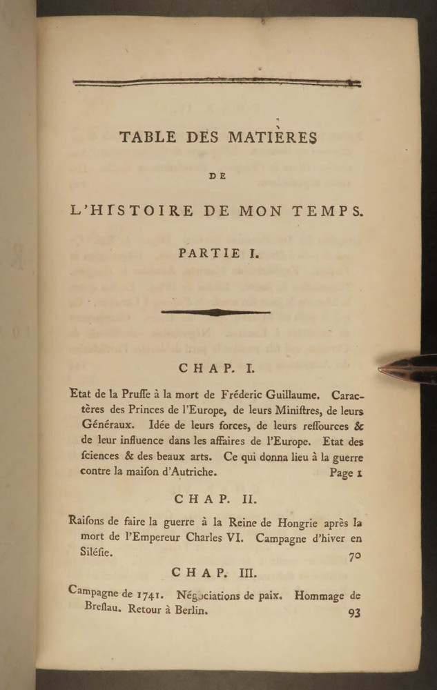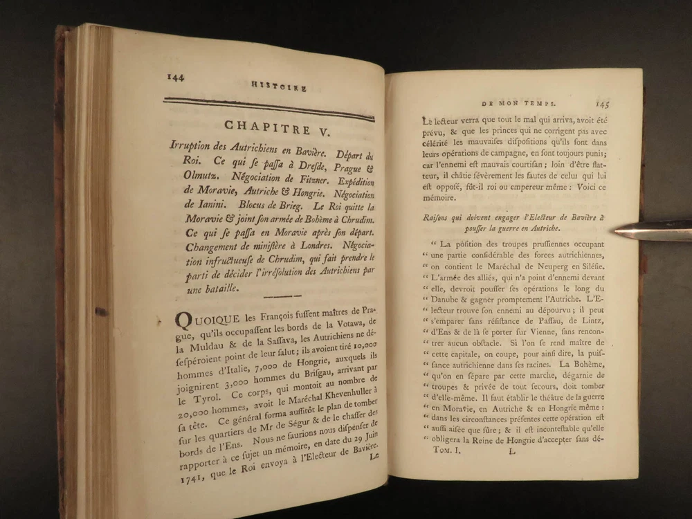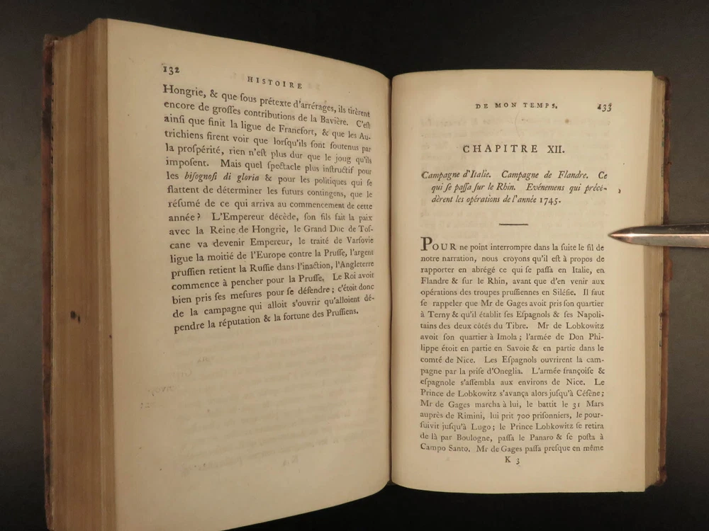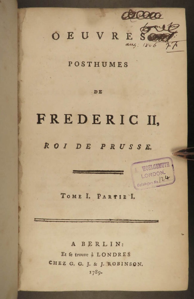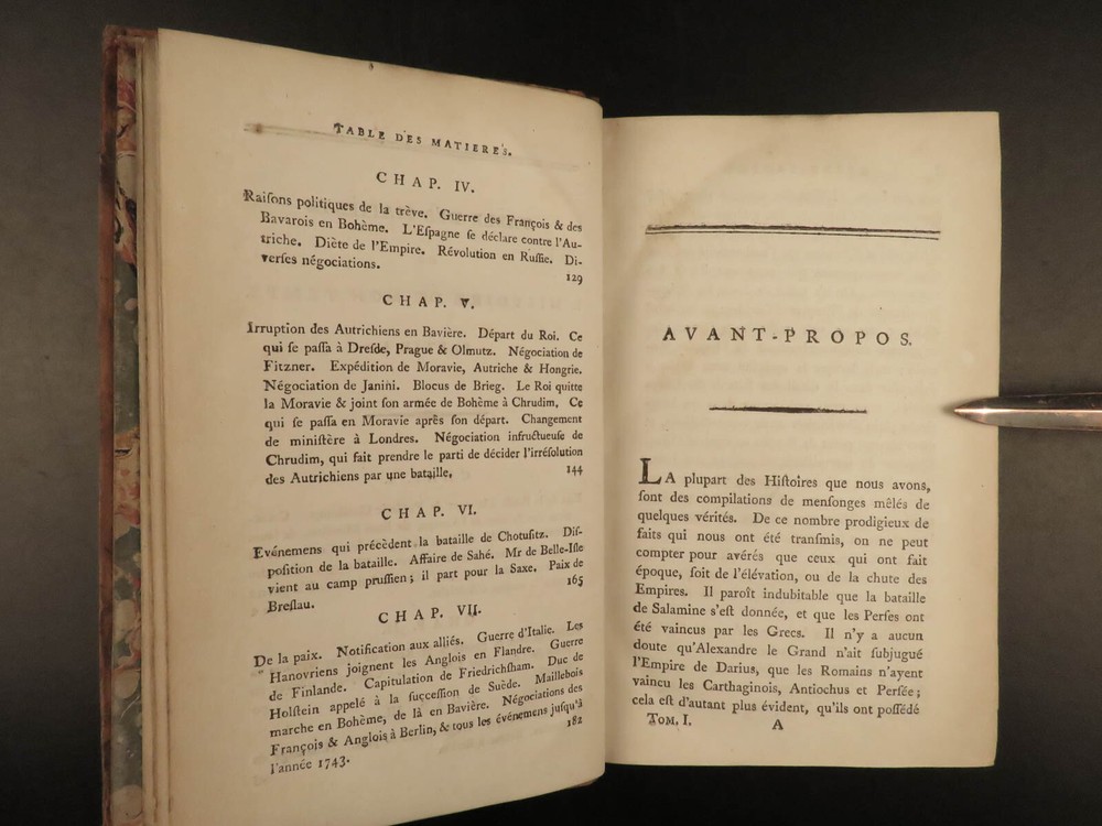 1789 Works of Frederick II of Prussia Germany Seven Years WAR Politics 15v SET “The first object in the establishment of an army ought to be making provision for the belly, that being the basis and foundation of all operations.” – Frederick the Great Frederick II was the most famous King of Prussia, notable for his 46 years of reign. He served and ruled over Brandenburg-Prussia and was a significant force in the Wars of Polish and Austrian Succession. Throughout his life, Frederic II wrote numerous works, most of which deal with military instruction and history of war. Perhaps his ‘History of the Seven Years War’ is his most famous, a work detailing not only his involvement in the war, but the outcomes and their influence on European history. Item number: #20269 Price: $750 FREDERIC II, King of Prussia Oeuvres posthumes de Frederic II, roi de Prusse. Berlin ; Et se trouve a Londres : Robinson, 1789. Details : · Collation: Complete with all pages; 15 volumes ( complete !) o Each volume individually paginated · Language: French · Binding: Leather; tight and secure · Size : ~8in X 5.25in (20.5cm x 13.5cm) Our Guarantee: Very Fast. Very Safe. Free Shipping Worldwide. Customer satisfaction is our priority! Notify us with 7 days of receiving, and we will offer a full refund without reservation! 20269