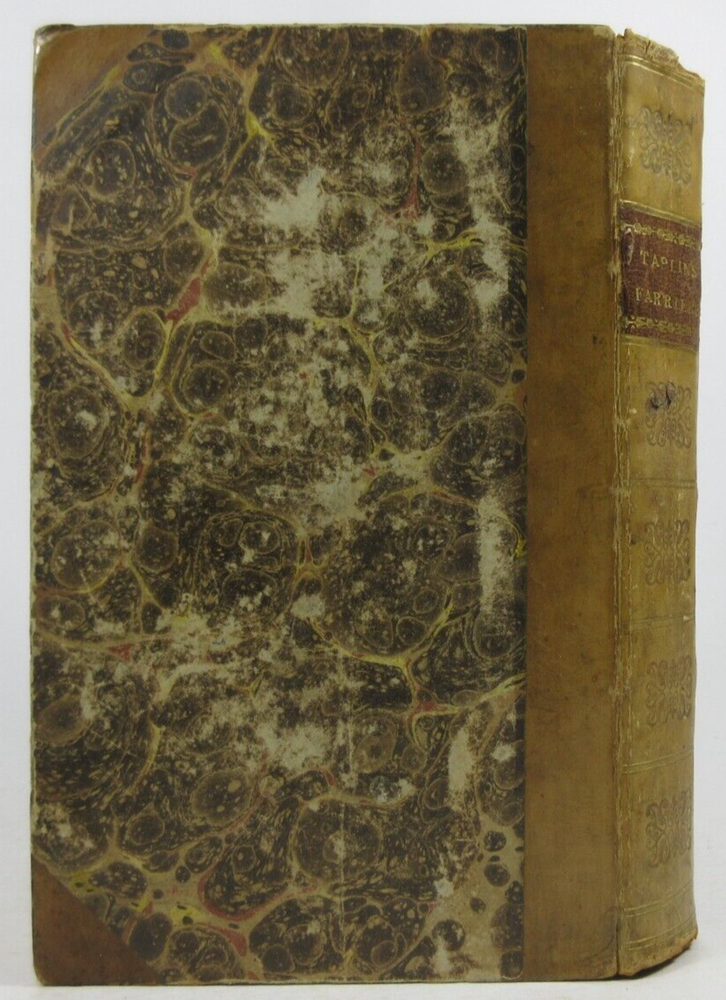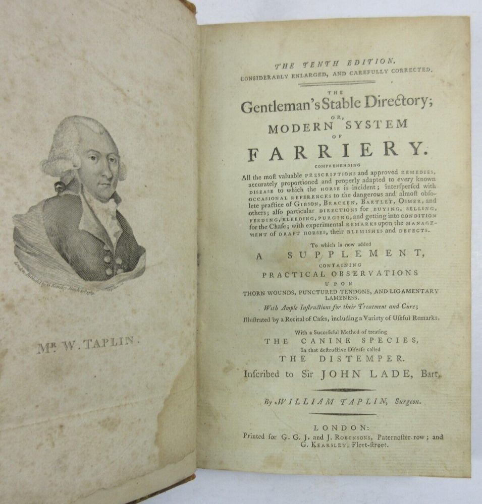 For sale is a leather rebound, 10th edition of The Gentleman's Stable Directory; or Modern System of Farriery...A Supplement, Containing Practical Observations upon Thorn Wounds, Punctured Tendons, and Ligamentary Lameness by William Taplin, surgeon . 10th Edition, published in 1796, printed in London for G.G.J. & J. Robinsons, Paternofter Row; & G. Kearsley Fleet-Ftreet. Binding is holding sound, though the front cover has a small split with partially exposed mesh. The pages are generally unmarked with the exception of age toning. Features 1/4 leather & marble boards with gilded decoration to the spine . Boards show light shelf wear around the edges with minor bumping to the corners. Please see photos for condition detail. shelf reference # L-2477