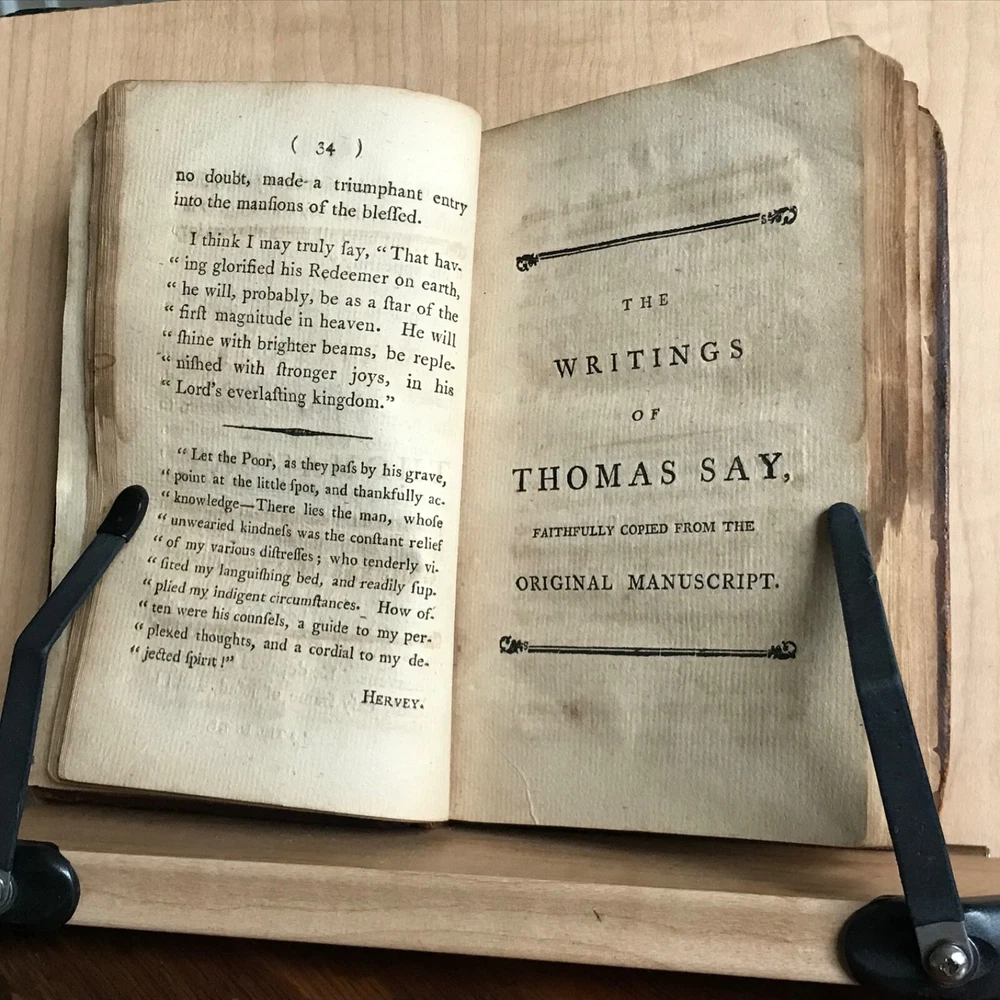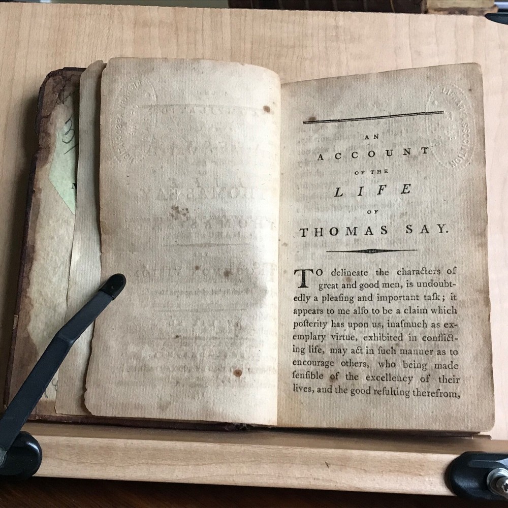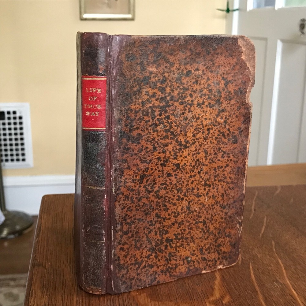 A Short Compilation of the Extraordinary Life and Writings of Thomas Say; in Which is Faithfully Copied, From the Original Manuscript, The Uncommon Vision, Which he had when a young Man. By His Son (Benjamin Say), Printed and Sold by Budd and Bartram, Philadelphia, 1796, 151 pp, full leather, 6.5 x 4”, 18mo. In good condition. Spine and joints have been nicely rebacked. Nearly undetectable. Moderate wear to extremities with heavy scuffing to top right corner of front board. Small indent of loss at said corner. Heavy rubbing to edges as well with light red rot. Morocco label intact. Ex-library of The Library Association of the Diligent Hose Company No. 124 Case 13. Previous bookseller’s markings on end papers. Front fly has been repaired at the gutter with Japanese paper. Edges of fly are quite chipped and toned. Internally toned with instances of sporadic age stain and foxing. Free of known marginalia. Fore-edge soiled with age stain. Binding remains intact. Collated and complete. Please see photos. Scarce writings of Thomas Say’s (1709-1796) famous “vision”, also miraculous medical cures by laying of hands. Benjamin Say (1755-1813) was a member of the U.S. House of Representatives in Pennsylvania and father to pioneering entomologist Thomas Say (1787-1835). RAREA1796CILX