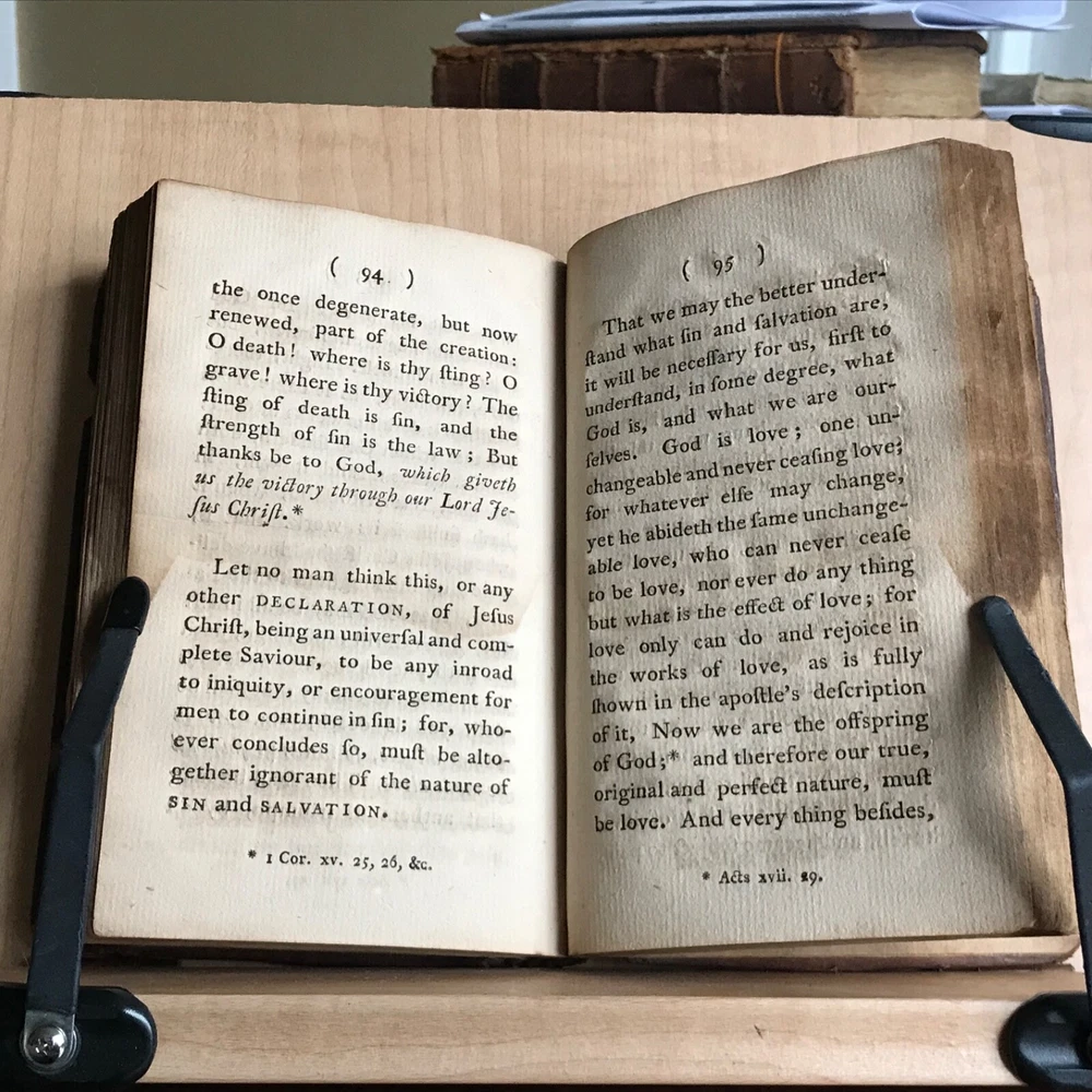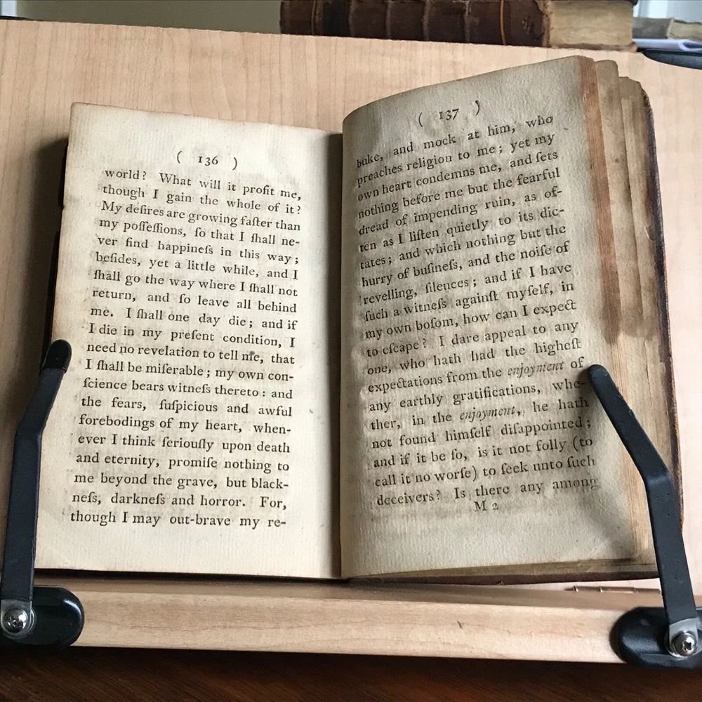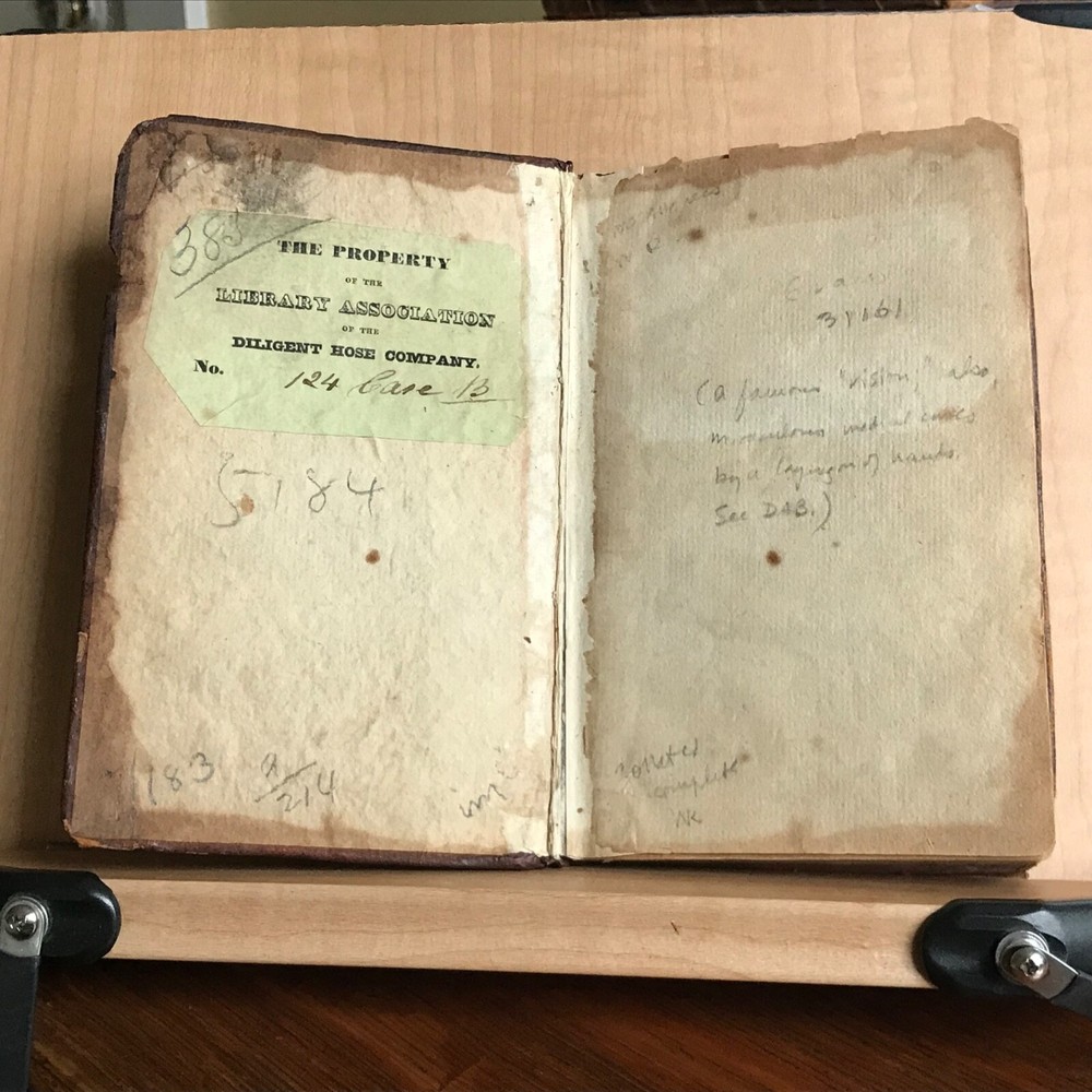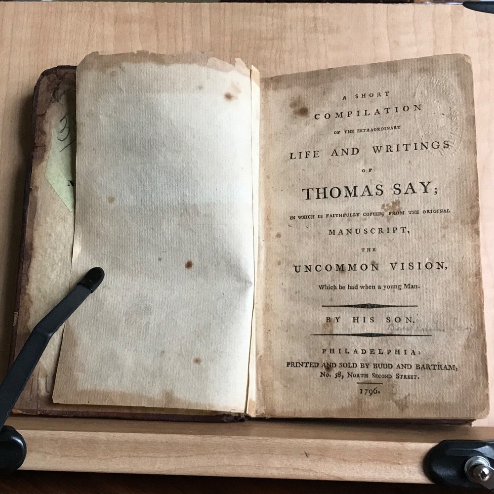 A Short Compilation of the Extraordinary Life and Writings of Thomas Say; in Which is Faithfully Copied, From the Original Manuscript, The Uncommon Vision, Which he had when a young Man. By His Son (Benjamin Say), Printed and Sold by Budd and Bartram, Philadelphia, 1796, 151 pp, full leather, 6.5 x 4”, 18mo. In good condition. Spine and joints have been nicely rebacked. Nearly undetectable. Moderate wear to extremities with heavy scuffing to top right corner of front board. Small indent of loss at said corner. Heavy rubbing to edges as well with light red rot. Morocco label intact. Ex-library of The Library Association of the Diligent Hose Company No. 124 Case 13. Previous bookseller’s markings on end papers. Front fly has been repaired at the gutter with Japanese paper. Edges of fly are quite chipped and toned. Internally toned with instances of sporadic age stain and foxing. Free of known marginalia. Fore-edge soiled with age stain. Binding remains intact. Collated and complete. Please see photos. Scarce writings of Thomas Say’s (1709-1796) famous “vision”, also miraculous medical cures by laying of hands. Benjamin Say (1755-1813) was a member of the U.S. House of Representatives in Pennsylvania and father to pioneering entomologist Thomas Say (1787-1835). RAREA1796CILX