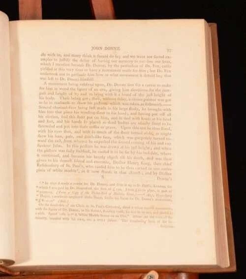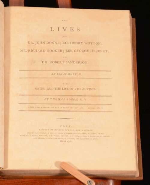 Click here to see our other books! The Lives of Dr John Donne; Sir Henry Wotton; Mr Richard Hooker; Mr George Herbert; and Dr Robert Sanderson Isaac Walton 1796 J. Robson et al : York 10.5" by 9" SUMMARY A first edition of this collection of biographies by Isaac Walton. Illustrated,Leather Binding,Rebound Overall Condition: Very Good Indeed This book weighs 0.75 KG when packed UK Postage: £ 3.99 US Postage: £ 19.99 EU Postage : £ 15.99 European Postage: £ 16.99 Asia Postage: £ 21.99 Worldwide Postage: £ 25.99 DESCRIPTION Illustrated throughout with numerous plates. Including biographies of Dr John Donne, Sir Henry Wotton, Mr Richard Hooker, Mr George Herbert, and Dr Robert Sanderson. It was probably as an angler that Walton made the acquaintance of Sir Henry Wotton. Sir Henry Wotton dying in 1639, Walton undertook his life also; it was finished in 1642 and published in 1651. His life of Hooker was published in 1662, that of George Herbert in 1670 and that of Bishop Robert Sanderson in 1678. All these subjects were endeared to the biographer by a certain gentleness of disposition and cheerful piety; three of them at least Donne, Wotton and Herbert were anglers. Their lives were evidently written with loving pains, in the same leisurely fashion as his Angler, and like it are of value less as exact knowledge than as harmonious and complete pictures of character. An edition of Walton's Lives, by G Sampson, appeared in 1903. CONDITION Rebound in half-morocco. Externally, very smart. Internally, firmly bound. Pages are bright and generally clean, with just some scattered light spotting and marginal tidemarks to the frontispiece. Overall Condition: Very Good Indeed GLOSSARY OF TERMS Overall Condition (Dustwrapper condition rating is shown after that for the book itself, where a dustwrapper is present) Fine - Very well preserved copy showing very little wear Very Good Indeed - Only one or two minor faults, really a very attractive copy Very Good - Quite a wide term meaning no major faults but probably several smaller ones often expected given the age of the book, but still a respectable copy Good - Meaning not very good. Some more serious faults as will be described in the condition report under 'condition' Good Only - Meaning one or more faults that could really do with repair Fair - As with good only above but with other faults leaving a compromised copy even after repair Poor - Really bad and possibly seriously incomplete. We only sell books in this condition where their rarity or value makes them attractive none the less. Major defects will be described. GUARANTEE We offer a full money back guarantee on our descriptions. Please ask for details and conditions. We prefer PAYPAL. If you pay via PAYPAL we will post the item off the same or the next working day with the postage you have selected. Please note we cannot accept USD cheques