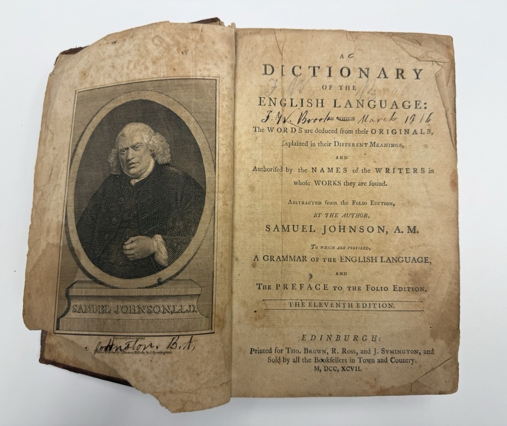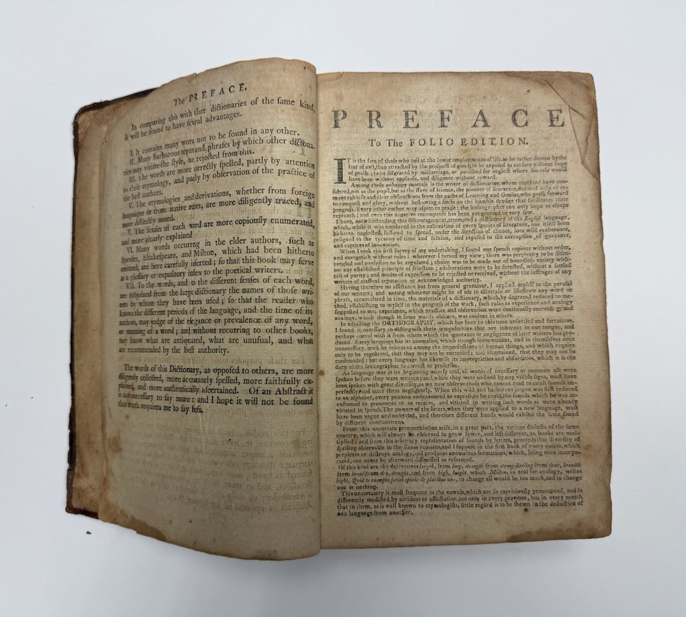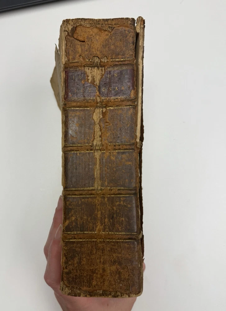The product is a rare and valuable antique book titled "A Dictionary to the English Language" by Samuel Johnson, A.M. This book is the Preface to the Folio edition and was published in 1797 by Tho. Brown, R. Ross, & J. Symington in the United States. Published in Edinburgh, Scotland. The book is missing the back and a few pages. It ends on the “WIL” section.