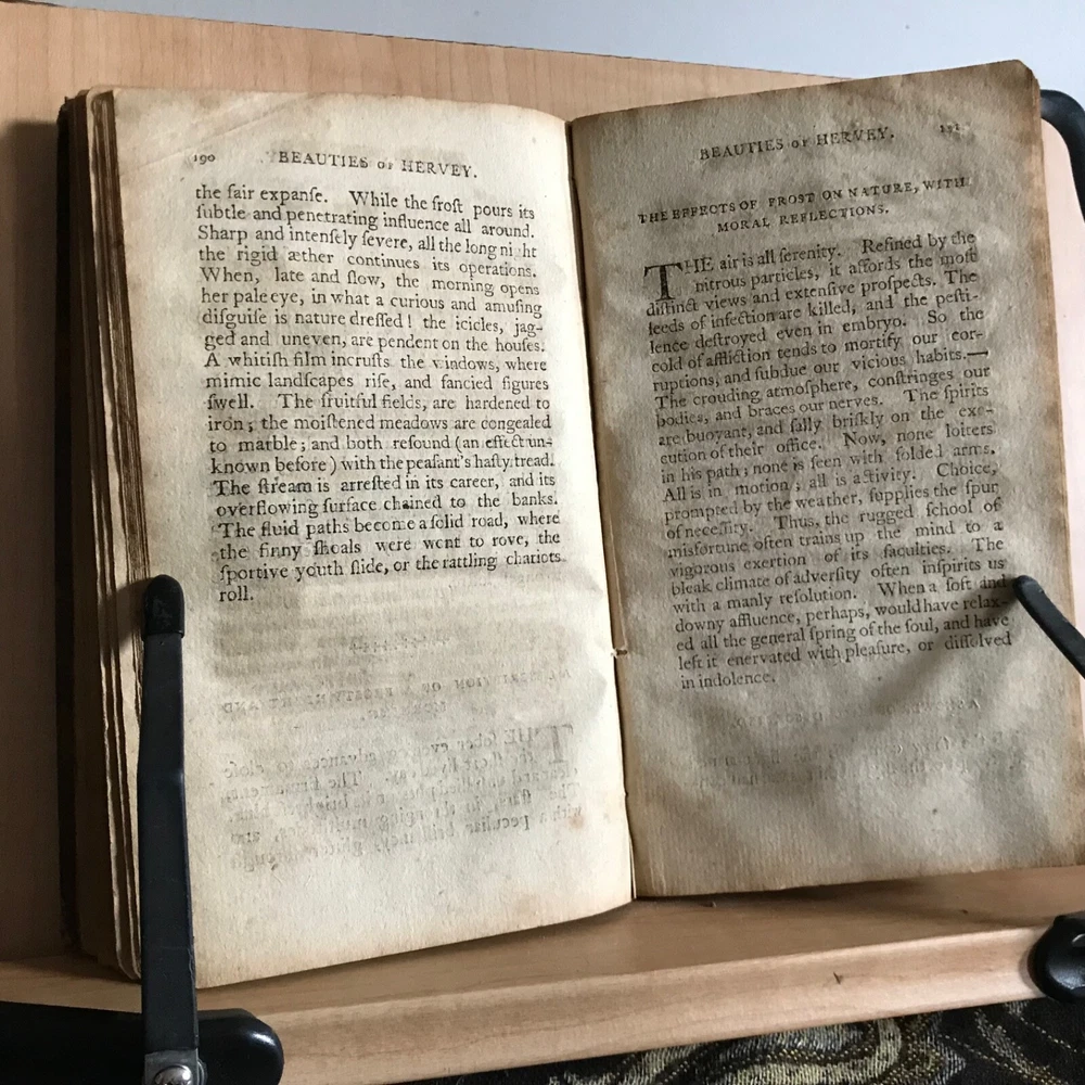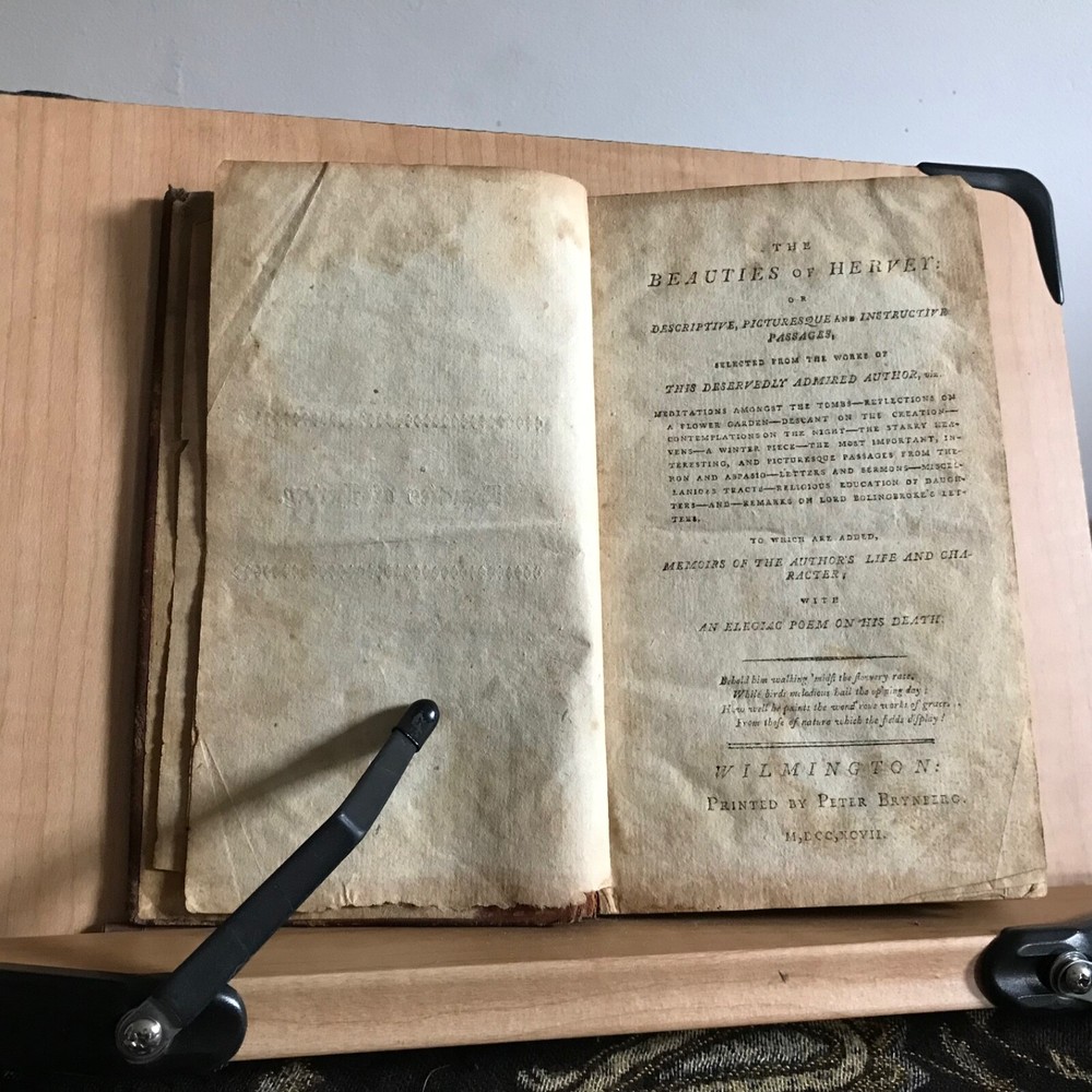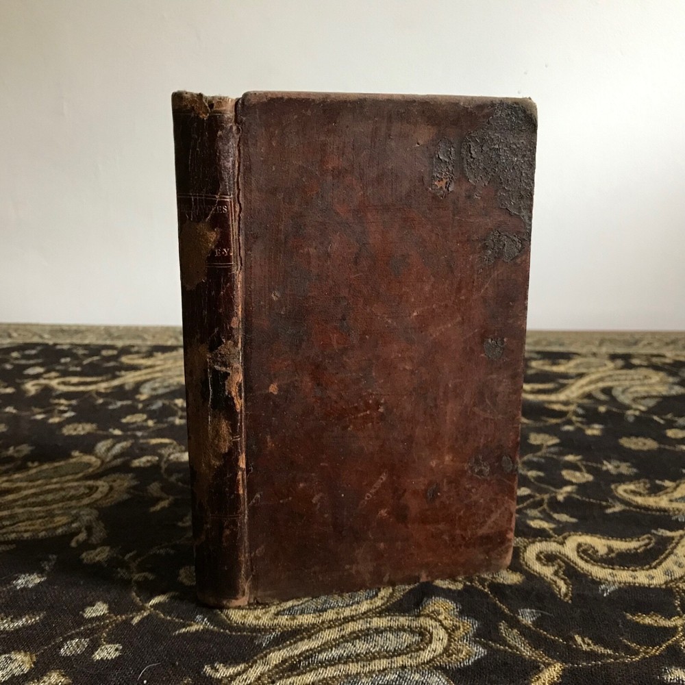 The Beauties of Hervey: Or, Descriptive, Picturesque and Instructive Passages, Selected from the Works of This Deservedly Admired Author, Memoirs of the Author’s Life and Characters; with An Elegiac Poem on His Death, James Hervey, Printed by Peter Brynberg, Wilmington, Delaware, 1797, 226 pp plus elegy, full original leather, 7 x 4.5”, 12mo. In fair condition. Boards are mottled with wear to edges and corners. Light surface scuffing and dryness to hinges. Spine label is mostly missing with loss along spine overall. Tree calf leather. Interior is moderately toned, lightly soiled. Chipped flyleaf. “Margaret Graham’s Book October 22nd, 1811” on second flyleaf. Spotting throughout. Free of marginalia. Binding tight and intact. Please see photos. Hervey, a popular bombastic Divine, had a deep influence on William Blake who painted “Epitome of James Hervey’s Meditations among the Tombs”. Two works in this collection — Meditations Amongst the Tombs & Theron and Aspasio decisively influenced the imagery in Blake’s well-known poem The Tyger. COLU1797ABFK-variant