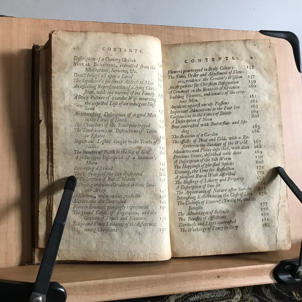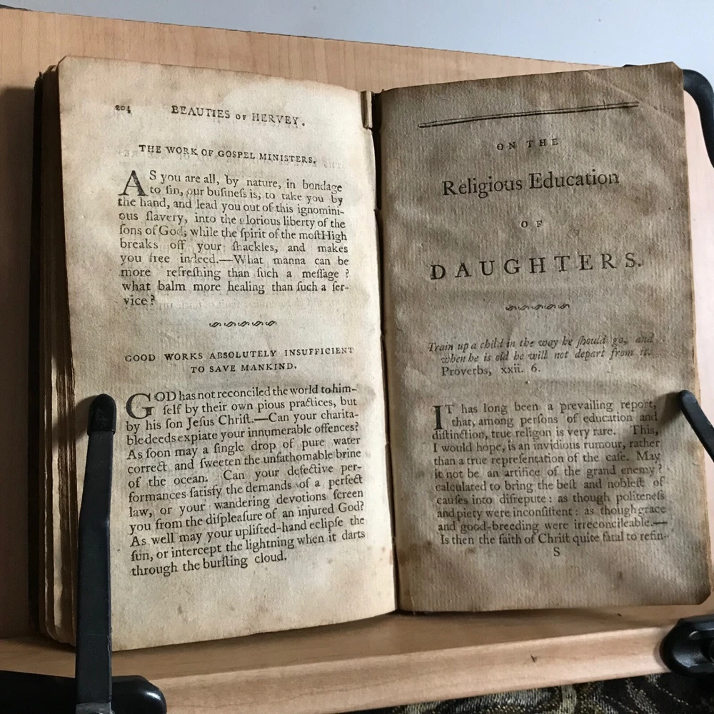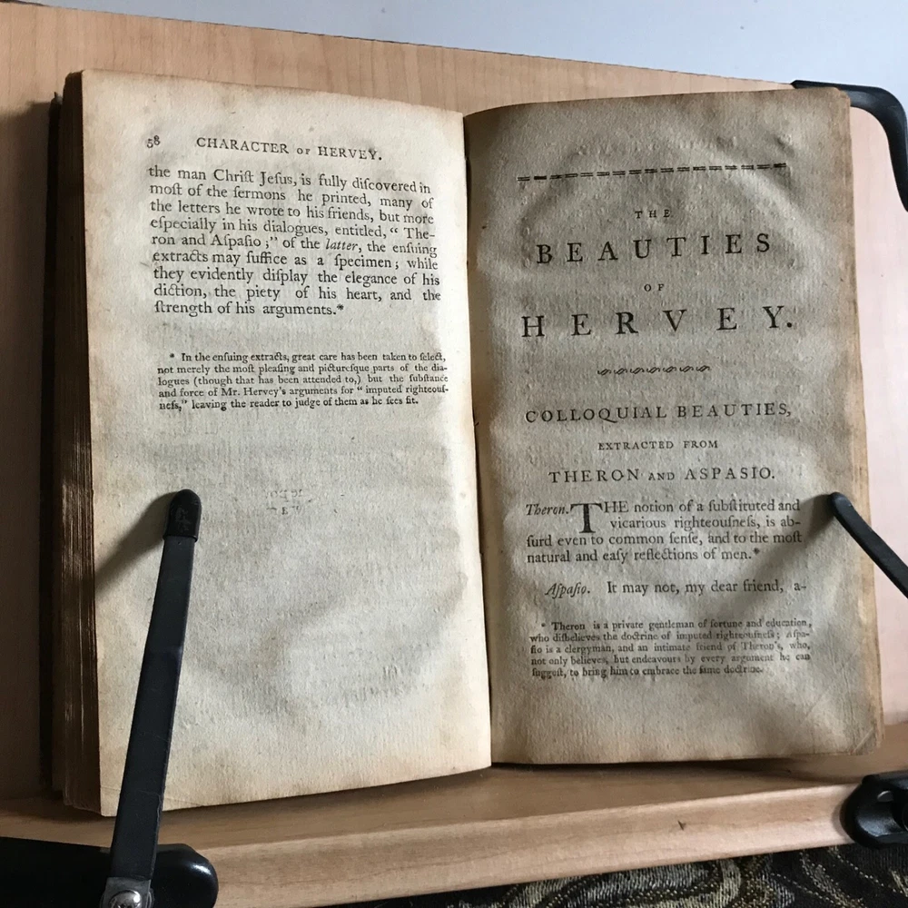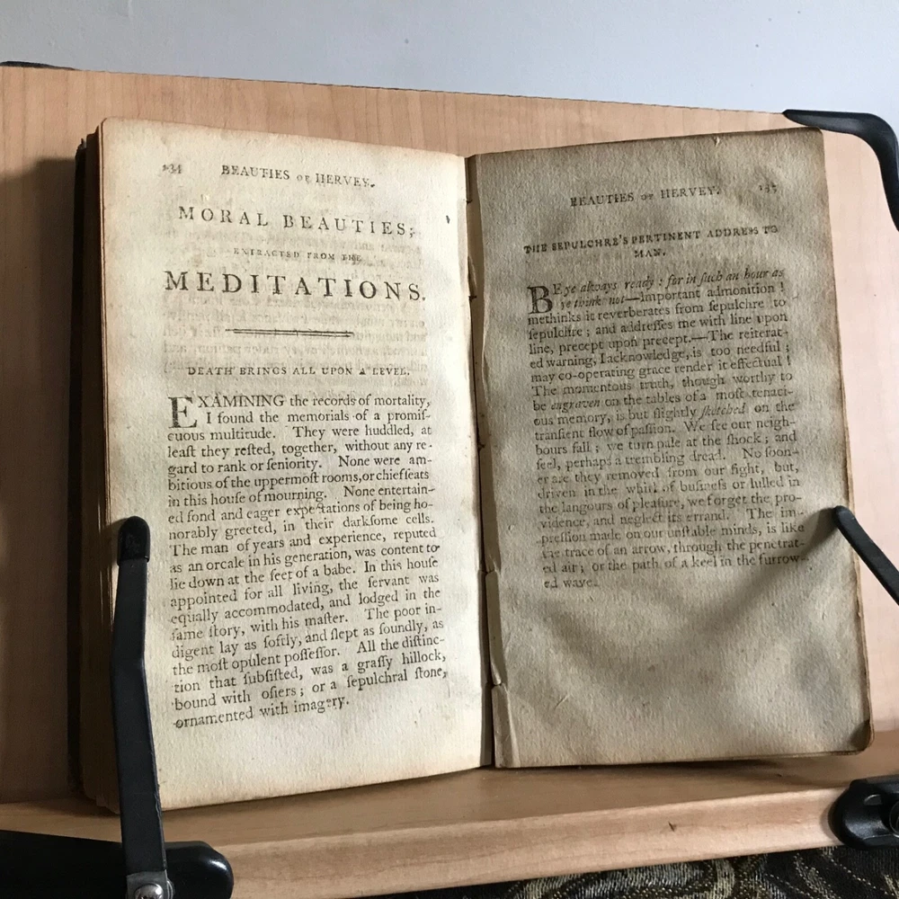 The Beauties of Hervey: Or, Descriptive, Picturesque and Instructive Passages, Selected from the Works of This Deservedly Admired Author, Memoirs of the Author’s Life and Characters; with An Elegiac Poem on His Death, James Hervey, Printed by Peter Brynberg, Wilmington, Delaware, 1797, 226 pp plus elegy, full original leather, 7 x 4.5”, 12mo. In fair condition. Boards are mottled with wear to edges and corners. Light surface scuffing and dryness to hinges. Spine label is mostly missing with loss along spine overall. Tree calf leather. Interior is moderately toned, lightly soiled. Chipped flyleaf. “Margaret Graham’s Book October 22nd, 1811” on second flyleaf. Spotting throughout. Free of marginalia. Binding tight and intact. Please see photos. Hervey, a popular bombastic Divine, had a deep influence on William Blake who painted “Epitome of James Hervey’s Meditations among the Tombs”. Two works in this collection — Meditations Amongst the Tombs & Theron and Aspasio decisively influenced the imagery in Blake’s well-known poem The Tyger. COLU1797ABFK-variant