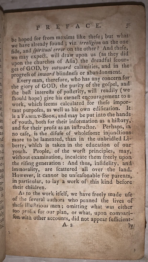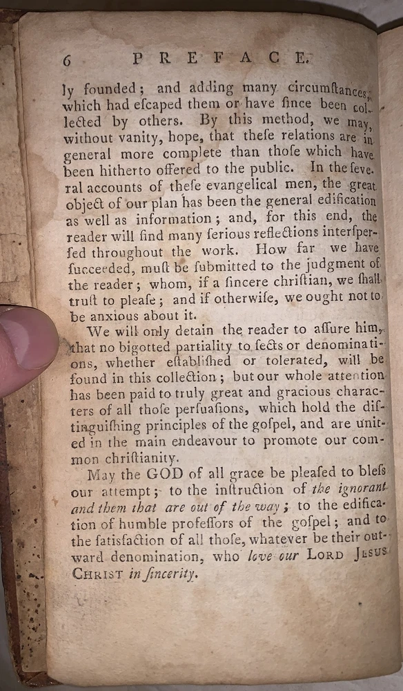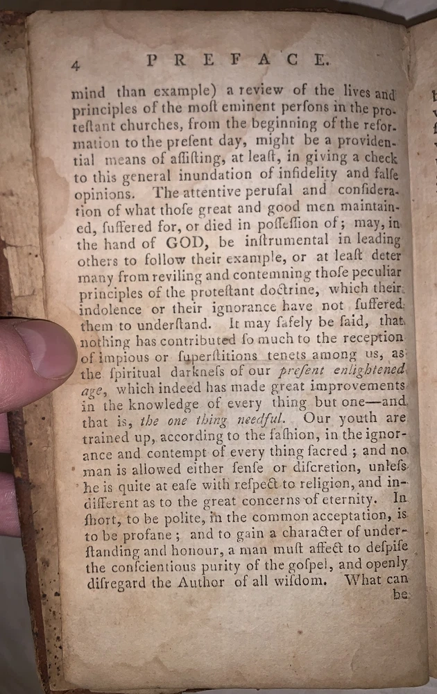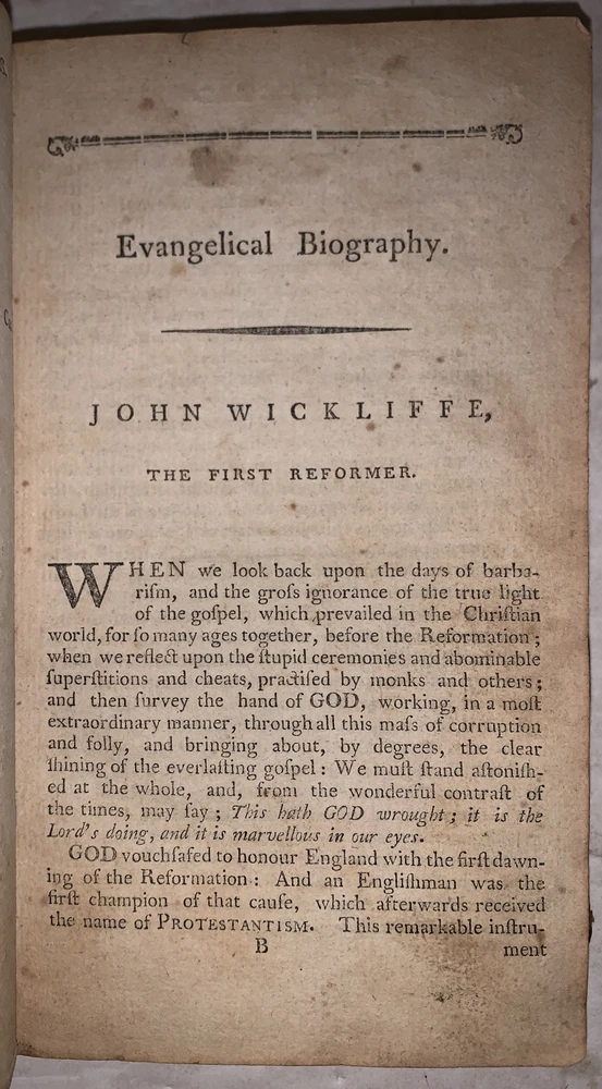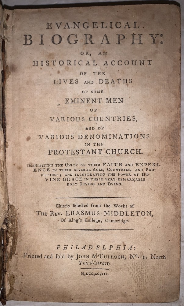 Evangelical Biography: or, an Historical Account of the Lives and Deaths of some Eminent Men of Various Countries, and of Various Denominations in the Protestant Church. Chiefly selected from the Works of the Rev. Erasmus Middleton Philadelphia: John McCulloch 1798 Octavo, 256 pages, period full leather. Front hinge cracked, loss to leather on top board and spine, damage to spine, front free endpaper detached, previous owner's inscriptions, a few tears, rubbing and wear, foxing and discoloration, else in good condition. If you have any questions, feel free to ask and don't forget to check out my other listings.