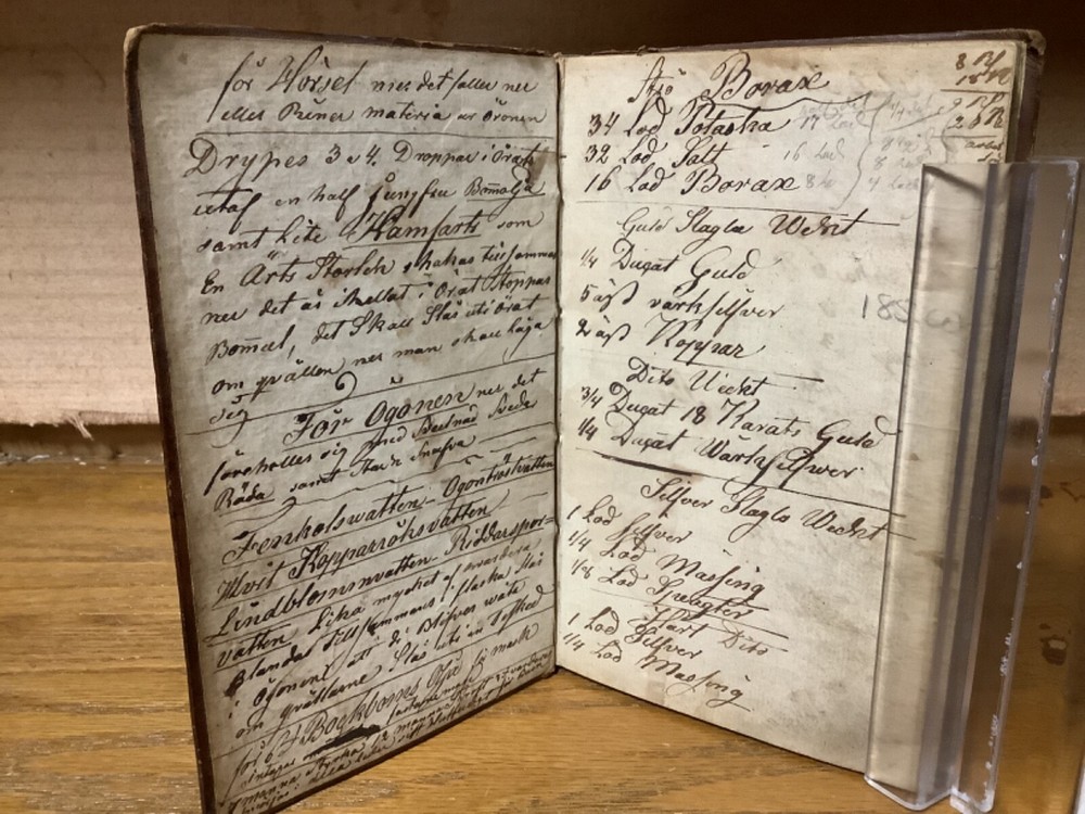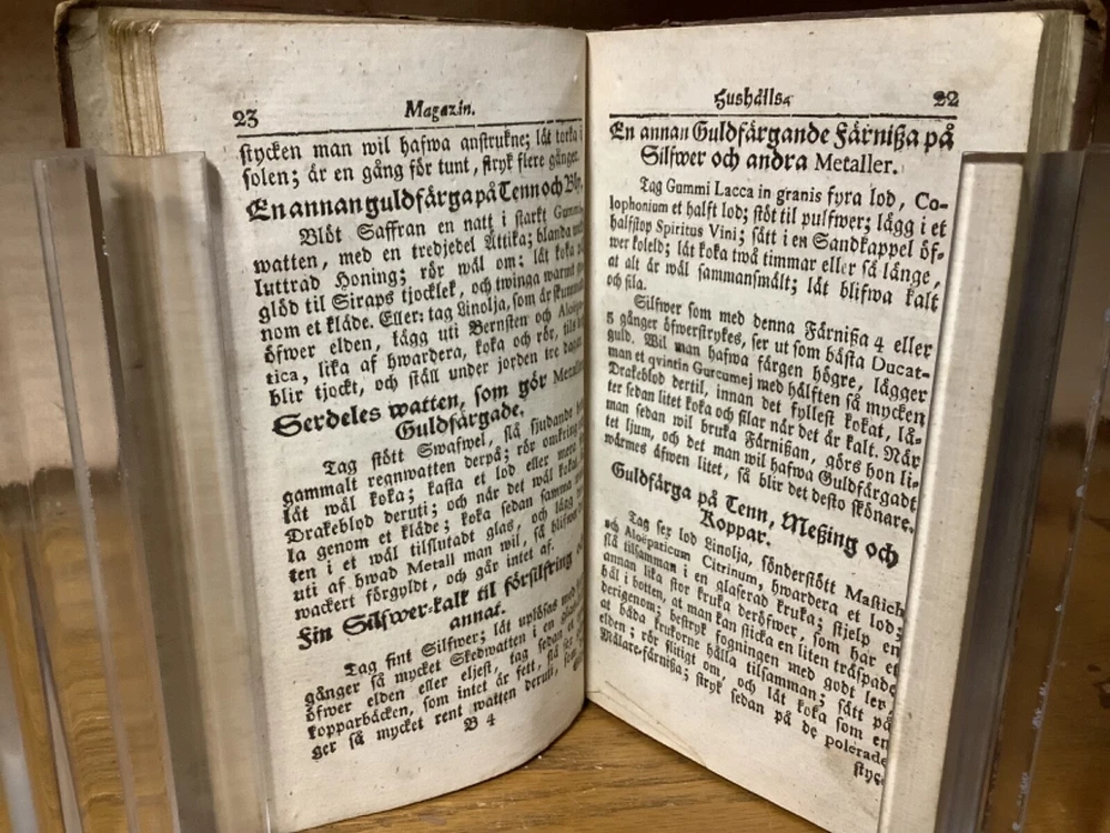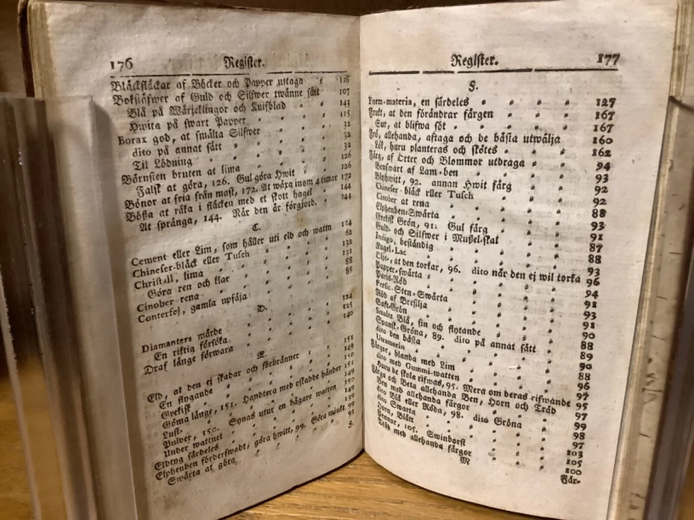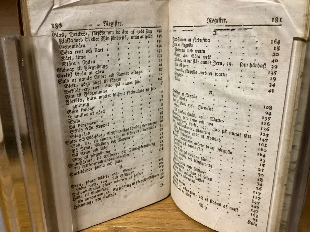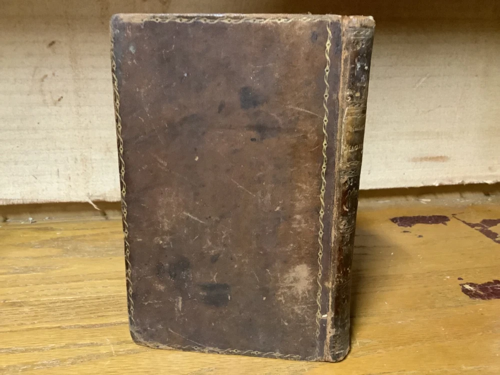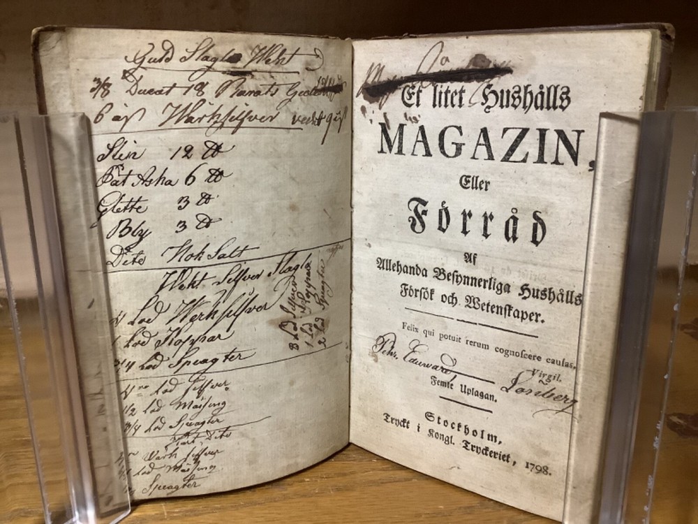 Et Litet Hushalls Magazin. Printed in Stockholm. 1798, 188 pp, 7” x 4.5”, 8vo, full leather hardcover. In good condition, with superficial rubbing and wear to exterior, primarily along edges and corners. Hinges remain in good condition and text block remains bound well. Heavily inscribed at front and rear, with some inscriptions and markings elsewhere within the text block, including on the title page. General age-related toning to pages, along with periodic foxing and wear. Please see photographs and ask any questions prior to purchasing. A very scarce piece in Swedish, designed to provide basic information on a variety of subjects, including metallurgy. Please see photographs for a complete list of covered subjects. COLN1798DIJB-0524-aj1688