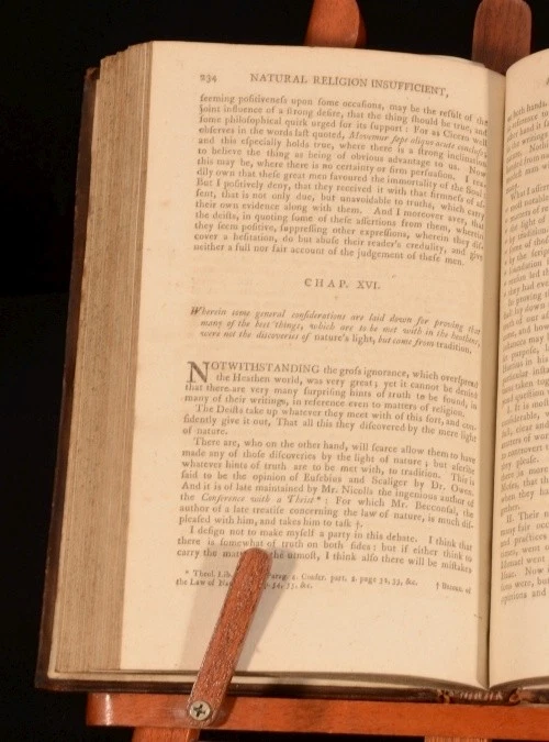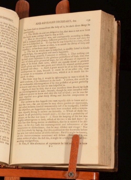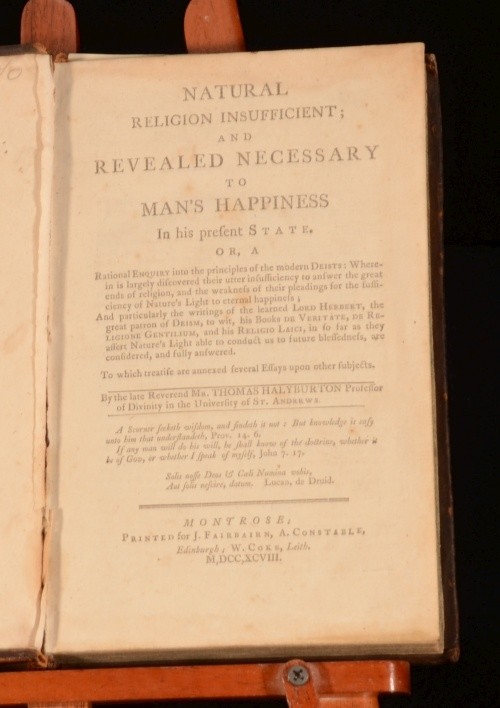 Click here to see our other books! Natural Religion Insufficient; and Revealed Necessary to Man’s Happiness in his Present State Thomas Halyburton 1798 J Fairbairn, A Constable : London 8.5" by 5.5" 377pp SUMMARY A fascinating and highly detailed enquiry into the principles of the modern Deists, with particular focus into the writings of Lord Herbert. Leather Binding Overall Condition: Very Good This book weighs 0.75 KG when packed UK Postage: £ 3.99 US Postage: £ 19.99 EU Postage : £ 15.99 European Postage: £ 16.99 Asia Postage: £ 21.99 Worldwide Postage: £ 25.99 DESCRIPTION Extremely scarce; being one of ten copies located, of which three are within America. "Natural Religion Insufficient; and Revealed Necessary to Man’s Happiness was first published in 1714. A conservative evangelical, Halyburton was a vigorous opponent of what he deemed to be deistic thought, distinguishing between what he calls ‘mortal deists’ and ‘immortal deists’. The former deny immortality. In his judgment, they ‘are, in effect, mere atheists’ with whom it is pointless to debate at any length (p. 30). The latter hold that there is a future state but have fundamentally defective ideas about God and salvation. This is because they affirm that natural religion is sufficient. In an extensive reply to them Halyburton argues, with particular reference to what he claims to find in Herbert of Cherbury and, to much lesser extent, in Blount and other so-called ‘deistic’ writers, that ‘experience of the world’ (p.184) shows that the teaching of natural religion is inadequate in relation to the knowledge of God, the proper nature of worship, the true happiness of human being and the way to attain it, the motives for obedience, the origin of sin, and the means for obtaining pardon." (Cited from the catalogue of The Antiquarian Library of Emertitus Professor David A. Pailin). From the private library of theologian and professor of philosophy, David A Pailin. CONDITION In original tree calf binding with calf and gilt spine label. Externally, sound with only some light cracking to the front joint and minor straining to the rear hinge. Internally, generally firmly bound, although lacking the front endpapers, bright, although with the odd spot. College library bookplate, as well as David Pailin's bookplate and ink signature to the front pastedown. Overall Condition: Very Good GLOSSARY OF TERMS Overall Condition (Dustwrapper condition rating is shown after that for the book itself, where a dustwrapper is present) Fine - Very well preserved copy showing very little wear Very Good Indeed - Only one or two minor faults, really a very attractive copy Very Good - Quite a wide term meaning no major faults but probably several smaller ones often expected given the age of the book, but still a respectable copy Good - Meaning not very good. Some more serious faults as will be described in the condition report under 'condition' Good Only - Meaning one or more faults that could really do with repair Fair - As with good only above but with other faults leaving a compromised copy even after repair Poor - Really bad and possibly seriously incomplete. We only sell books in this condition where their rarity or value makes them attractive none the less. Major defects will be described. GUARANTEE We offer a full money back guarantee on our descriptions. Please ask for details and conditions. We prefer PAYPAL. If you pay via PAYPAL we will post the item off the same or the next working day with the postage you have selected. Please note we cannot accept USD cheques