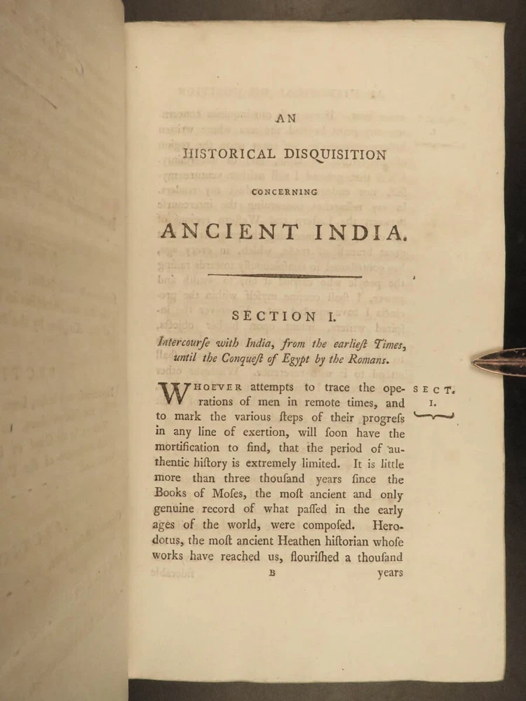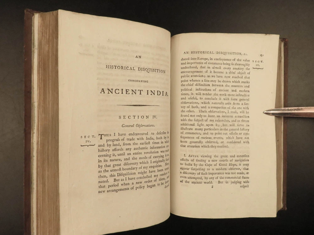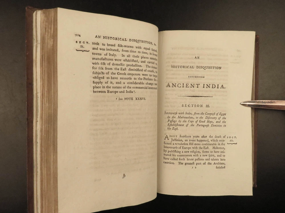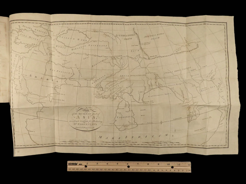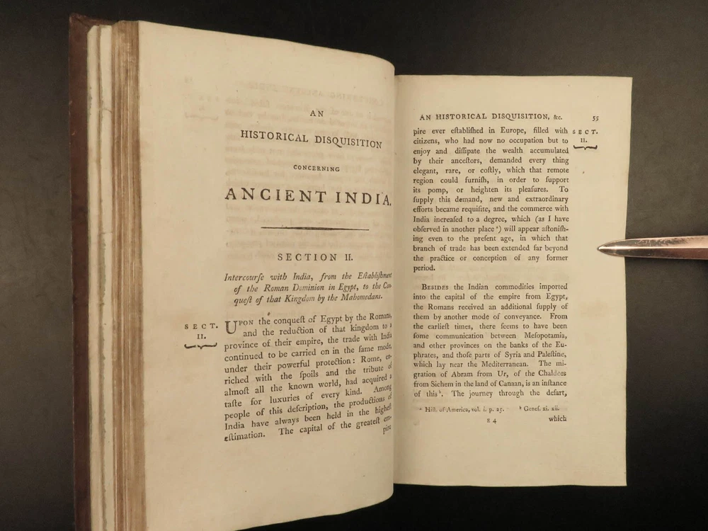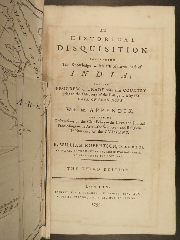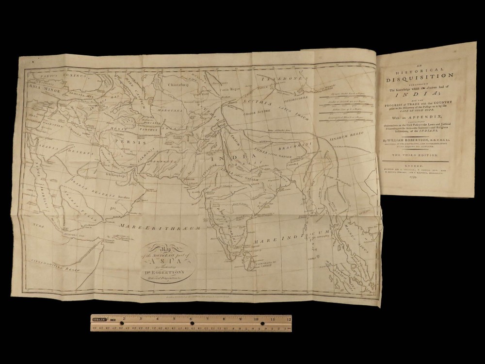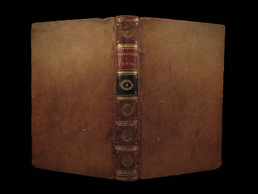 1799 History of INDIA Asia MAPS Egypt Hindu Robertson Scottish Enlightenment William Robertson was a notable 18 th -century Scottish historian, and, according to Humphreys, ‘made significant contributions to the writing of Scottish history and the history of Spain and Spanish America.’ While Robertson was most known for his histories of America and Great Britain, he also published an historical account of India. In this work, ‘ An Historical Disquisition Concerning the Knowledge of India’ , Robertson explored the commercial and cultural connections India had with the West through the end of the 15 th -century. According to Stewart Brown, this work “represents one of the more significant achievements of the late Scottish Enlightenment.” The DNB says of this work: “the early and high civilization of India, and the wonderful progress of its inhabitants in elegant arts and useful science, may have some influence upon the behavior of Europeans towards that people” This fine work features 2 enormous, folding maps of India. Item number: #22269 Price: $499 ROBERTSON, William An historical disquisition concerning the knowledge which the ancients had of India : and the progress of trade with that country prior to the discovery of the passage to it by the Cape of Good Hope London: Printed for A. Strahan [and 2 others], 1799. Details : · Collation: Complete with all pages o vi, [2], 441, [23] o Illustrated with 2 large folding maps · References: Humphreys, William Robertson and his History of America ; Brown, William Robertson, Early Orientalism ; · Provenance: Armorial bookplate – Thomas Augustus Jessopp Esq r . Of Waltham Abbey, Essex o Motto: POÆMIA VIRTUTIS HONORES · Language: English · Binding: Leather; tight and secure · Size : ~8.5in X 5.5in (21.5cm x 14cm) Our Guarantee: Very Fast. Very Safe. Free Shipping Worldwide. Customer satisfaction is our priority! Notify us with 7 days of receiving, and we will offer a full refund without reservation! 22269