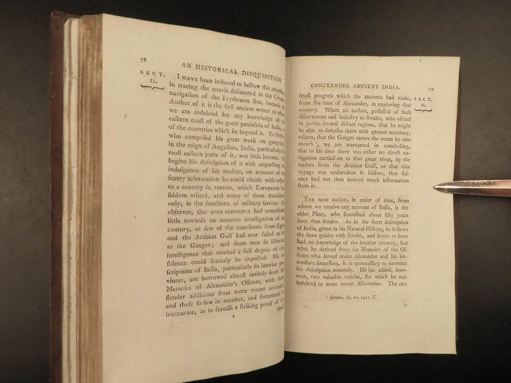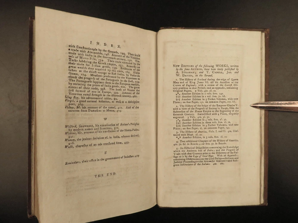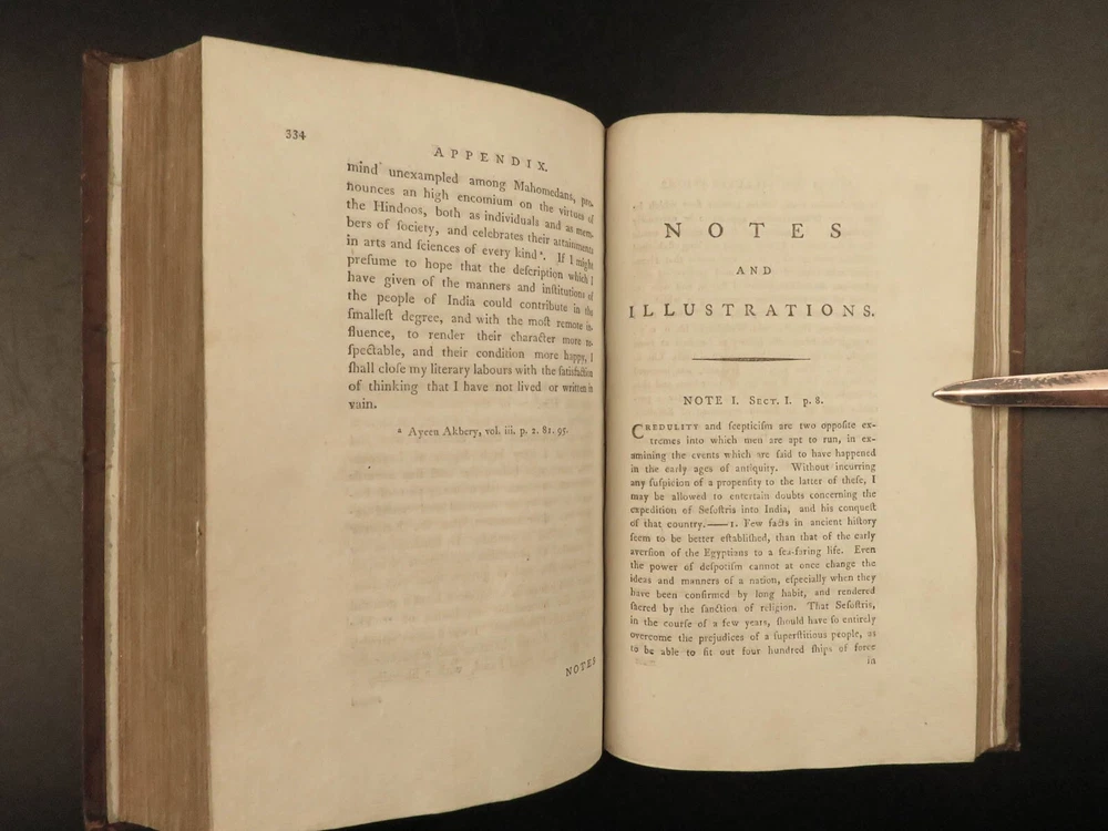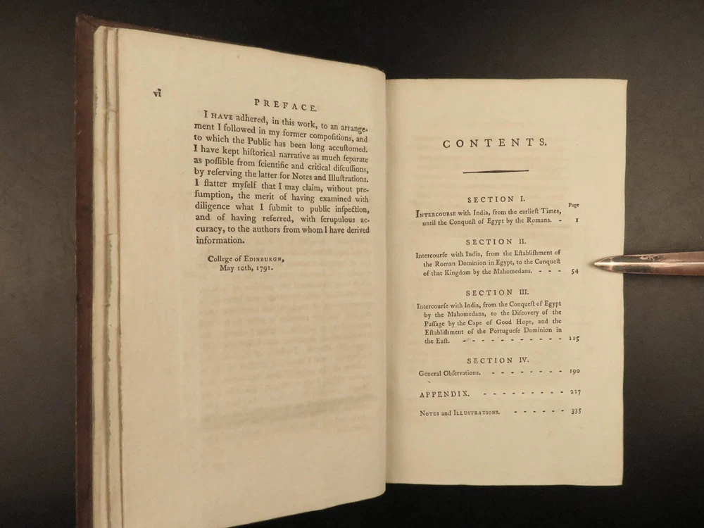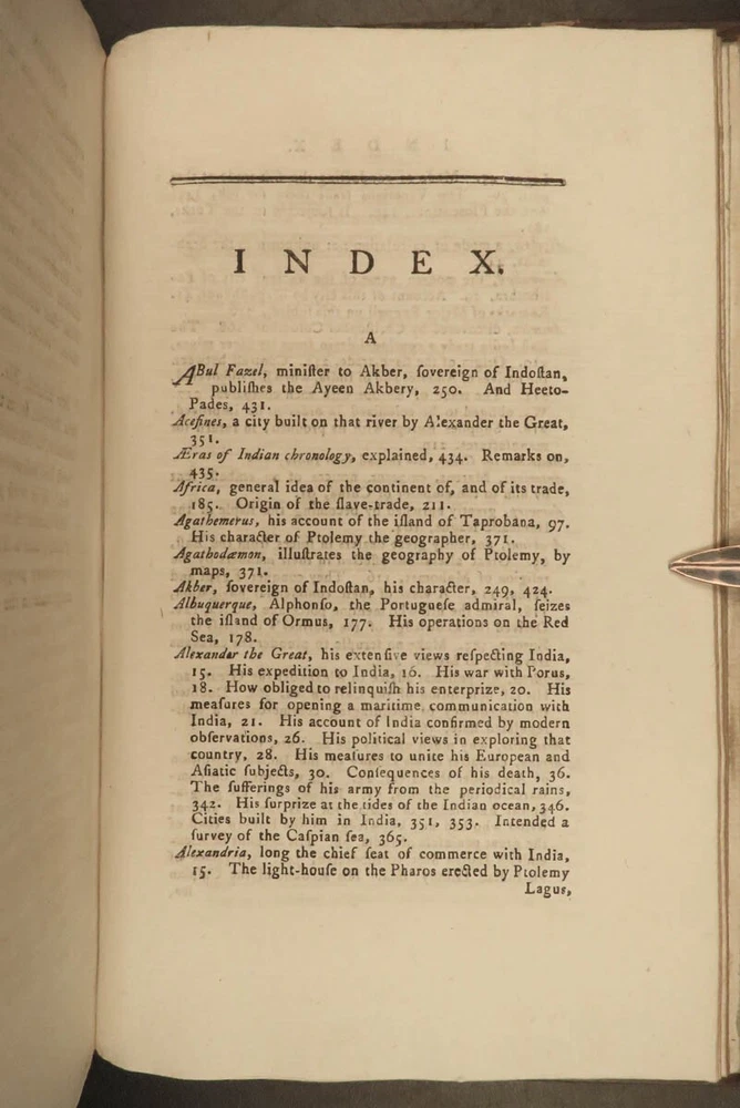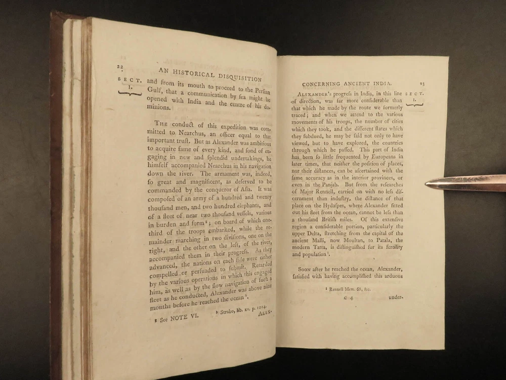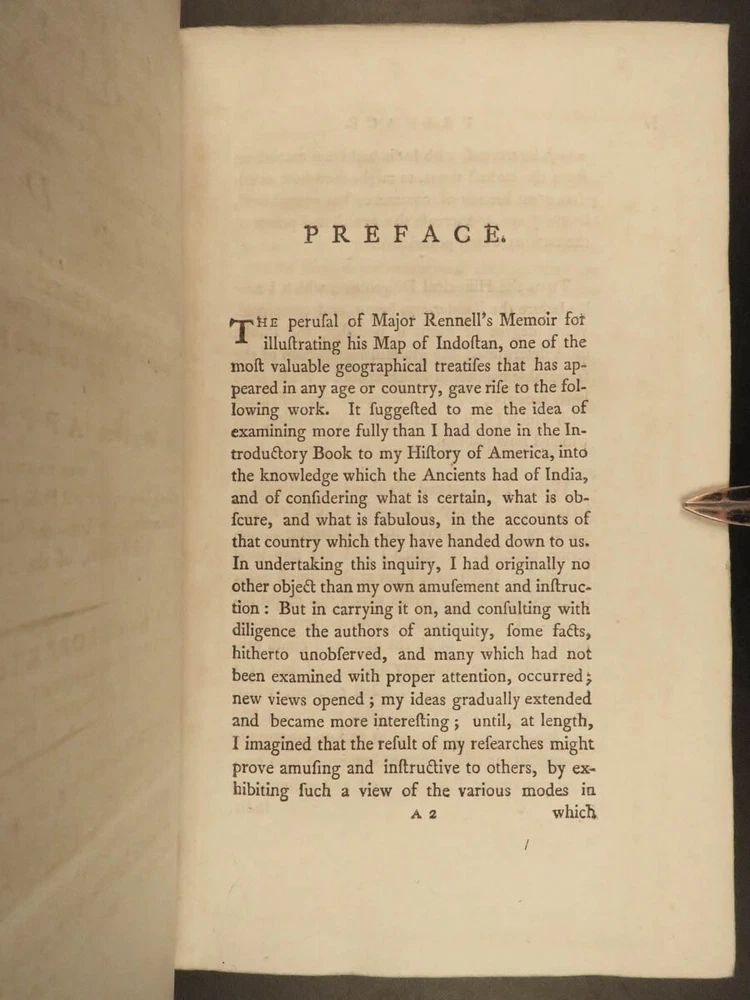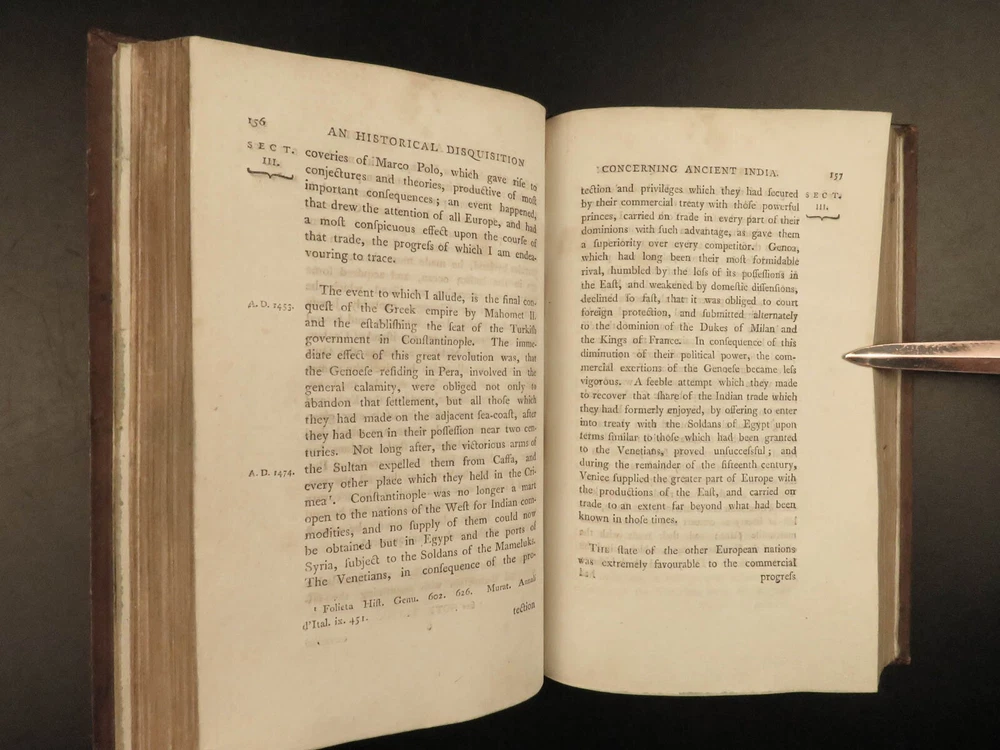 1799 History of INDIA Asia MAPS Egypt Hindu Robertson Scottish Enlightenment William Robertson was a notable 18 th -century Scottish historian, and, according to Humphreys, ‘made significant contributions to the writing of Scottish history and the history of Spain and Spanish America.’ While Robertson was most known for his histories of America and Great Britain, he also published an historical account of India. In this work, ‘ An Historical Disquisition Concerning the Knowledge of India’ , Robertson explored the commercial and cultural connections India had with the West through the end of the 15 th -century. According to Stewart Brown, this work “represents one of the more significant achievements of the late Scottish Enlightenment.” The DNB says of this work: “the early and high civilization of India, and the wonderful progress of its inhabitants in elegant arts and useful science, may have some influence upon the behavior of Europeans towards that people” This fine work features 2 enormous, folding maps of India. Item number: #22269 Price: $499 ROBERTSON, William An historical disquisition concerning the knowledge which the ancients had of India : and the progress of trade with that country prior to the discovery of the passage to it by the Cape of Good Hope London: Printed for A. Strahan [and 2 others], 1799. Details : · Collation: Complete with all pages o vi, [2], 441, [23] o Illustrated with 2 large folding maps · References: Humphreys, William Robertson and his History of America ; Brown, William Robertson, Early Orientalism ; · Provenance: Armorial bookplate – Thomas Augustus Jessopp Esq r . Of Waltham Abbey, Essex o Motto: POÆMIA VIRTUTIS HONORES · Language: English · Binding: Leather; tight and secure · Size : ~8.5in X 5.5in (21.5cm x 14cm) Our Guarantee: Very Fast. Very Safe. Free Shipping Worldwide. Customer satisfaction is our priority! Notify us with 7 days of receiving, and we will offer a full refund without reservation! 22269