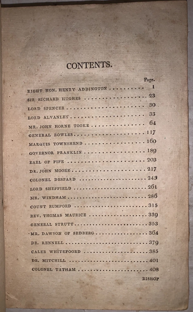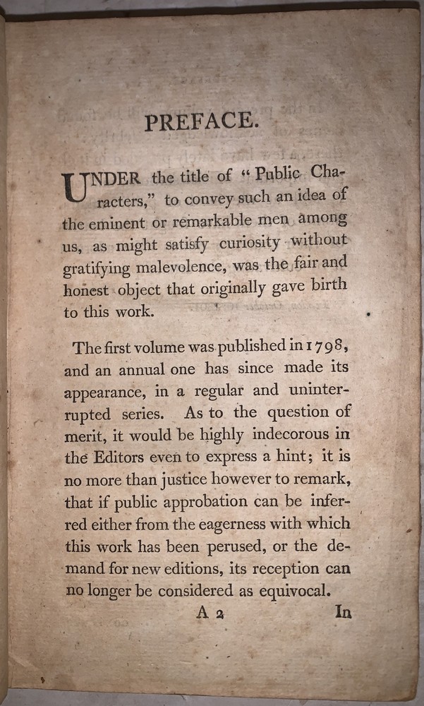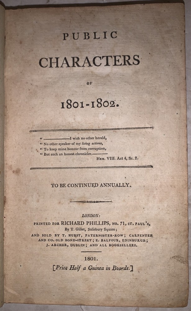 Public Characters of 1800-1801 To be continued annually London: Richard Phillips 1801 First Edition Octavo, vi, [2], 594 pages, period full leather. On the inside of the top board is a bookplate indicating this volume is from the Norristown Library Company. Illustrated with two black and white plates. Both boards detached, small loss to the corner of the first plate, rubbing and wear, scuffs, some foxing and discoloration, else in good condition. The Norristown Library Company, founded in 1799, stands as one of Pennsylvania's oldest institutions dedicated to fostering literacy and knowledge within the community of Norristown and its environs. Originally established through the initiative of community-minded individuals, the library has served as a vital center for learning and intellectual enrichment for over two centuries. From its inception, the Norristown Library Company has adapted to the evolving needs of its patrons, offering a diverse collection of books, resources, and educational programs. Through the dedication of its founders, members, staff, and supporters, the library has remained a cherished institution, promoting literacy, education, and community engagement for generations. If you have any questions, feel free to ask and don't forget to check out my other listings.
