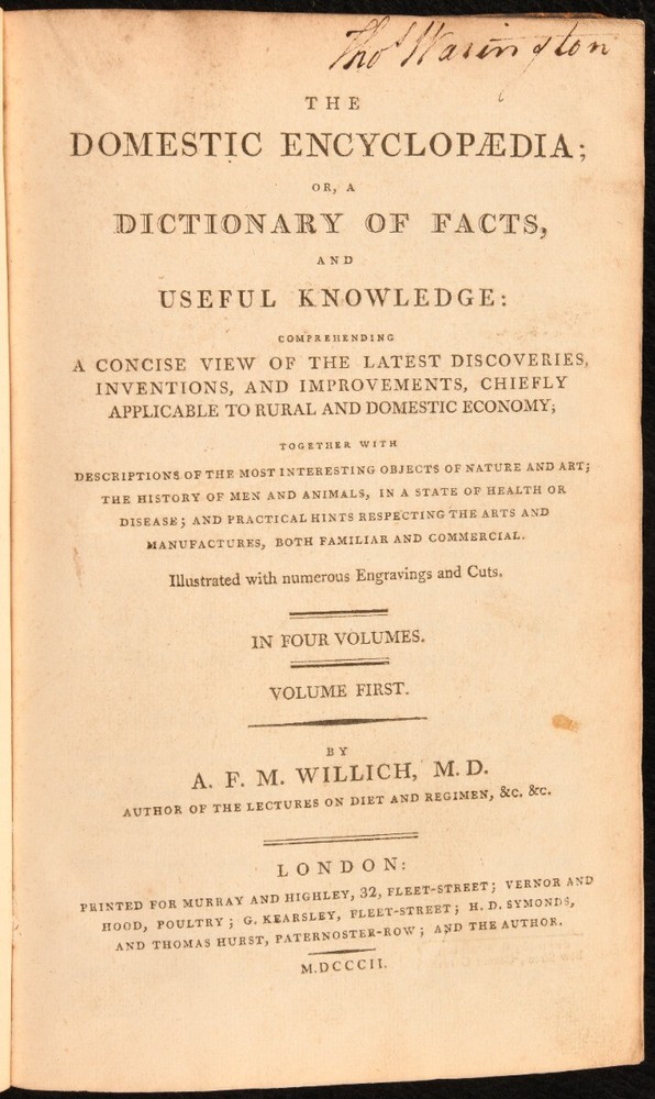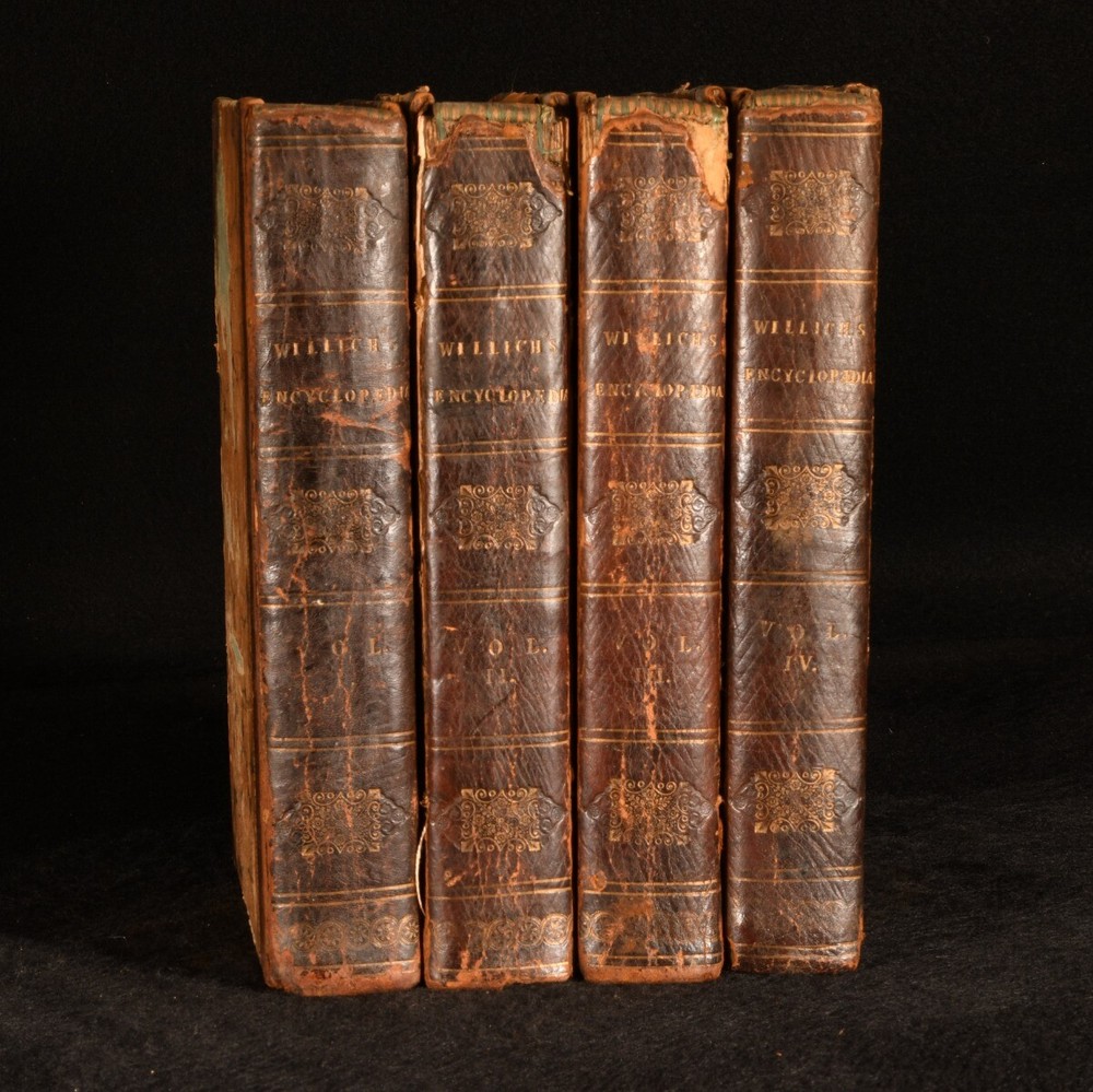 Click here to see our other books! The Domestic Encyclopaedia; or, a Dictionary of Facts, and Useful Knowledge: Comprehending a Concise View of the Latest Discoveries, Inventions, and Improvements, Chiefly Applicable to Rural and Domestic Economy; Together with Descriptions of the Most Interesting Objects of Nature and Art; the History of Men and Animals, in a State of Health or Disease; and Practical Hints Respecting the Arts and Manufactures, both Familiar and Commercial A. F. M. Willich 1802 Murray and Highley : London 8" by 5" iv, 528; SUMMARY The uncommon first edition of this early nineteenth-century domestic encyclopaedia, adorned with engravings and woodcuts. First Edition,Illustrated,Leather Binding Overall Condition: Good Only This book weighs 3 KG when packed UK Postage: £ 3.99 US Postage: £ 36.99 EU Postage : £ 25.99 European Postage: £ 27.99 Asia Postage: £ 47.99 Worldwide Postage: £ 69.99 DESCRIPTION First edition. Complete in four volumes. Uniformly bound in half calf, with marbled boards. Illustrated throughout with engravings and cuts, including six plates to Volume I; seven to Volume II; five to Volume III and ten to Volume IV, one being hand-coloured. Collated, complete. A comprehensive encyclopedia that covers an array of topics relating to domestic and rural life, including agriculture, cooking, medicine, household management, health and much more. Written by German medical writer, Anthony Florian Madinger Willich, who specialised in diet, nutrition and other aspects of personal medicine. CONDITION Uniformly bound in half calf, with marbled boards. Externally, with rubbing to the extremities, notably to the boards of Vol IV and II. With loss of leather to the spines of Vols II and III. Front board of Vol III and rear board of Vol II at risk of detaching with further handling. Front board of Vol II is tender. Internally, firmly bound, with occasional spots and slight age toning to the pages. Tide mark affecting the first few leaves of Volume IV. Overall Condition: Good Only GLOSSARY OF TERMS Overall Condition (Dustwrapper condition rating is shown after that for the book itself, where a dustwrapper is present) Fine - Very well preserved copy showing very little wear Very Good Indeed - Only one or two minor faults, really a very attractive copy Very Good - Quite a wide term meaning no major faults but probably several smaller ones often expected given the age of the book, but still a respectable copy Good - Meaning not very good. Some more serious faults as will be described in the condition report under 'condition' Good Only - Meaning one or more faults that could really do with repair Fair - As with good only above but with other faults leaving a compromised copy even after repair Poor - Really bad and possibly seriously incomplete. We only sell books in this condition where their rarity or value makes them attractive none the less. Major defects will be described. GUARANTEE We offer a full money back guarantee on our descriptions. Please ask for details and conditions. We prefer PAYPAL. If you pay via PAYPAL we will post the item off the same or the next working day with the postage you have selected. Please note we cannot accept USD cheques