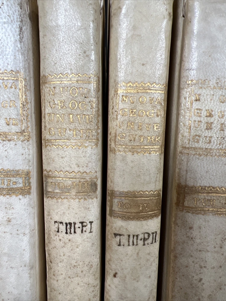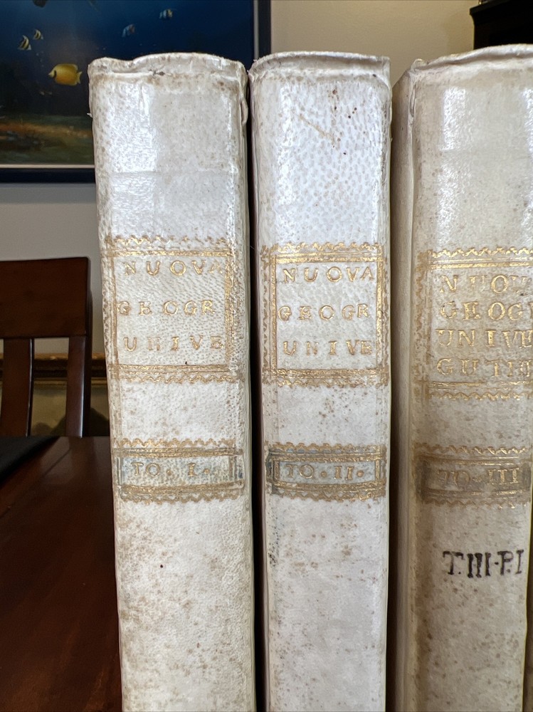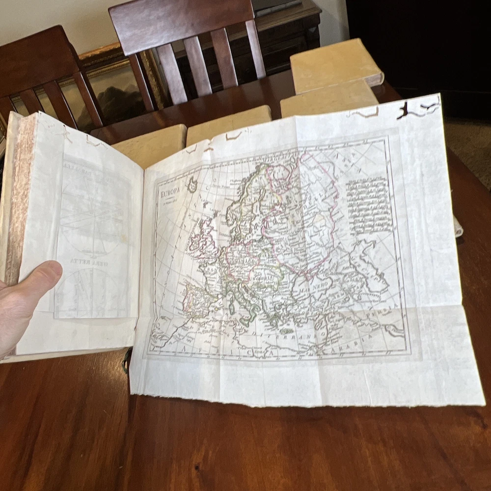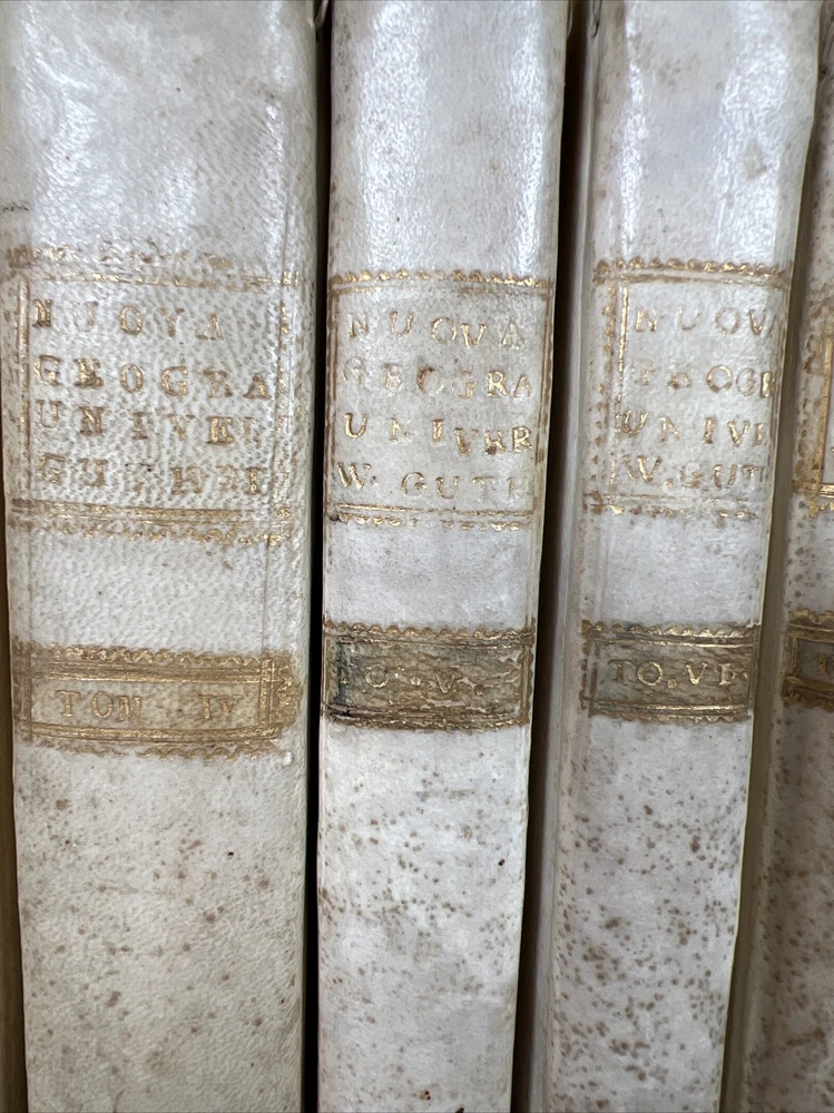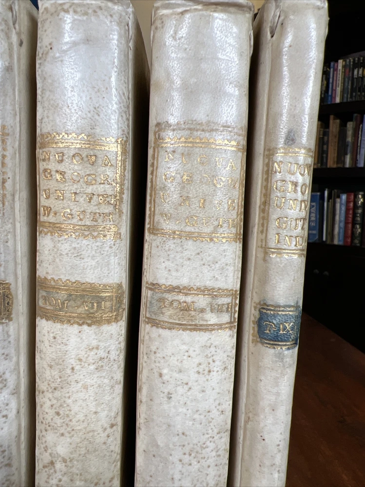 COMPLETE 9 Volume Atlas Set by W. Guthrie -Bound in original calfskin leather -Every volume with maps attached -One Full Western Hemisphere Map -One Full Eastern Hemisphere Map -Maps of all continents with the exception of Antarctica. Fantastic map of the United States/North America. Please see photos for bookworm marks in some of the books. Happy to report that none of the bookworm marks go through the map image areas. All image areas of the maps are very clean and bright. All maps attached. No separated pages. The feel of these books is absolutely sensational. The calfskin leather in hand is sublime. -Volumes are 10 inches tall and 7 1/2 inches across -Please feel free to message me with any questions or any requests for additional photos. I am very happy to send them and will respond to your question without 12 hours or less