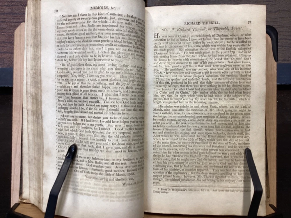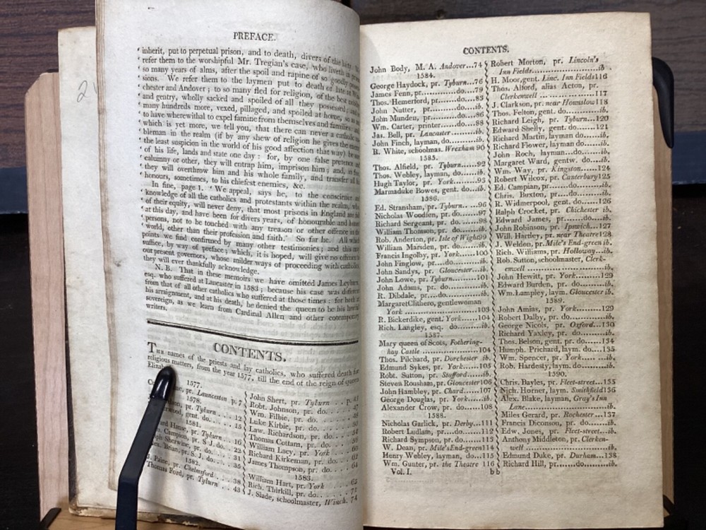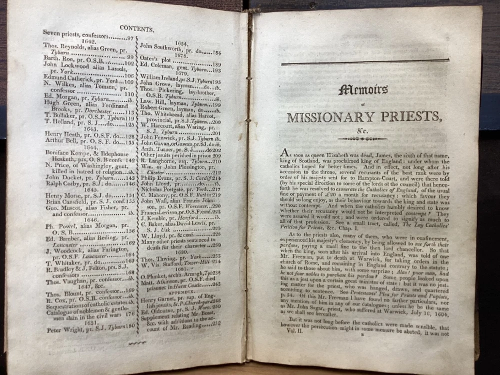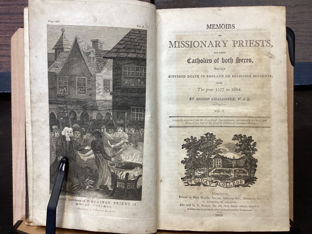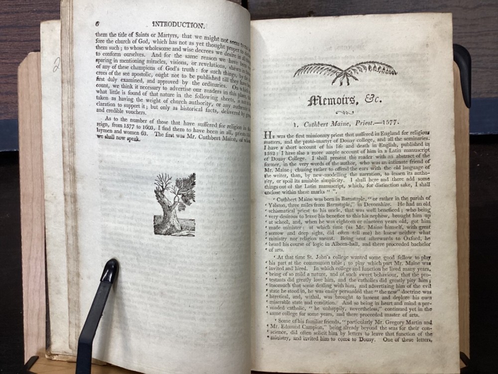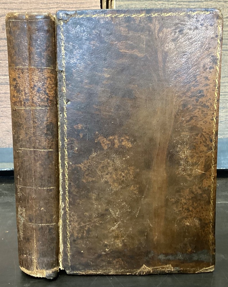 Memoirs of Missionary Priests, and Other Catholics of Both Sexes, That Have Suffered Death in England on Religious Accounts, from the year 1577 to 1684, Volumes 1 and 2, by Bishop Challoner, V.A.L., Mark Wardle, Manchester, 1803, 240pp, 256pp, leather, 5.5 x 8.5", 8vo Fair condition. Wear to front and rear boards. Edges are scuffed and tips bumped with exposed boards. Gilt detailing around edges of both front and rear boards. Front joint is cracked. An instance of worming appears to be present on front board. Spine is cracked and chipped with some exposed binding at tail; illegible. Marginalia on front pastedown and flyleaf. Frontispiece opposite title pages of both volumes. Toning, age-staining, foxing, and tea-staining throughout textblock. Please see photos. Written by Bishop Richard Challoner, these volumes provide a detailed account of the persecution of Catholics in England during the period between 1577 and 1684. Challoner focuses on the stories of Catholic priests and other individuals who were martyred for their faith during this time period. The book includes biographical information about these individuals, as well as descriptions of the events that led to their persecution and eventual death. Challoner also provides a historical context for the persecution of Catholics in England during this time period, including the political and religious factors that contributed to it. FORN-MSB-0224-TUB0006-JC137