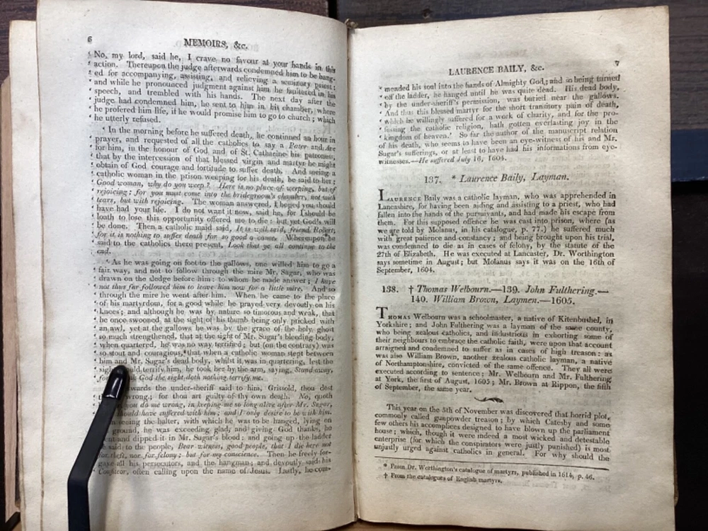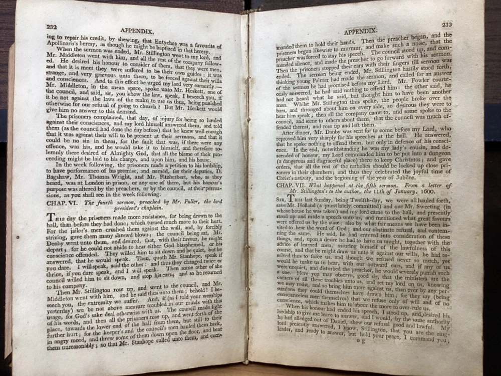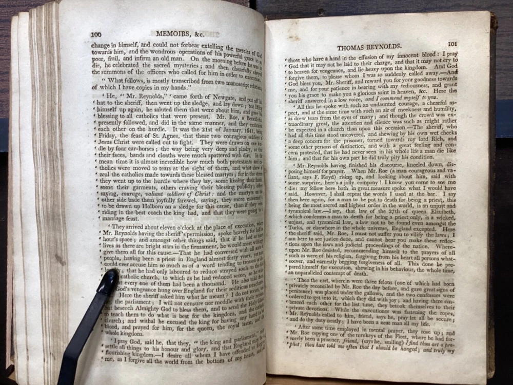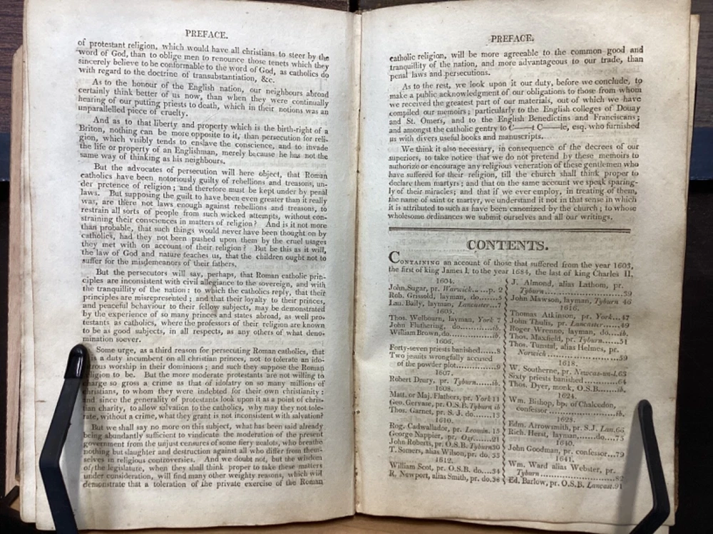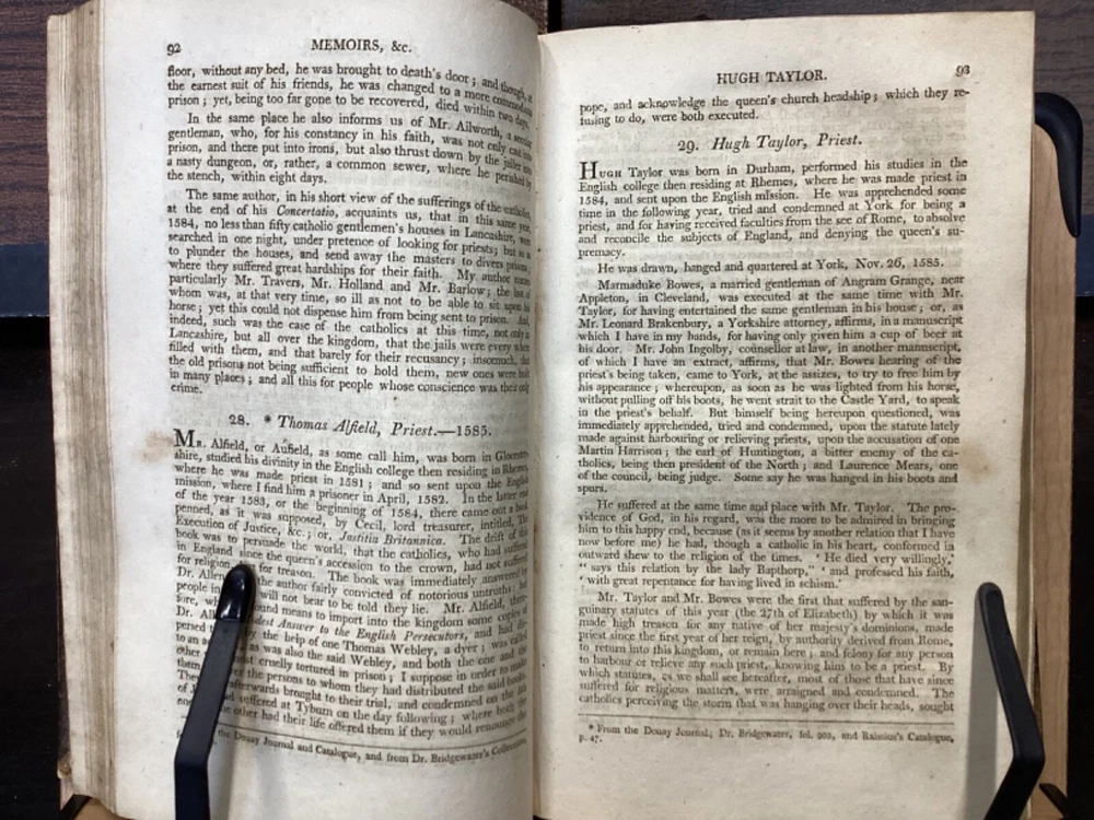 Memoirs of Missionary Priests, and Other Catholics of Both Sexes, That Have Suffered Death in England on Religious Accounts, from the year 1577 to 1684, Volumes 1 and 2, by Bishop Challoner, V.A.L., Mark Wardle, Manchester, 1803, 240pp, 256pp, leather, 5.5 x 8.5", 8vo Fair condition. Wear to front and rear boards. Edges are scuffed and tips bumped with exposed boards. Gilt detailing around edges of both front and rear boards. Front joint is cracked. An instance of worming appears to be present on front board. Spine is cracked and chipped with some exposed binding at tail; illegible. Marginalia on front pastedown and flyleaf. Frontispiece opposite title pages of both volumes. Toning, age-staining, foxing, and tea-staining throughout textblock. Please see photos. Written by Bishop Richard Challoner, these volumes provide a detailed account of the persecution of Catholics in England during the period between 1577 and 1684. Challoner focuses on the stories of Catholic priests and other individuals who were martyred for their faith during this time period. The book includes biographical information about these individuals, as well as descriptions of the events that led to their persecution and eventual death. Challoner also provides a historical context for the persecution of Catholics in England during this time period, including the political and religious factors that contributed to it. FORN-MSB-0224-TUB0006-JC137