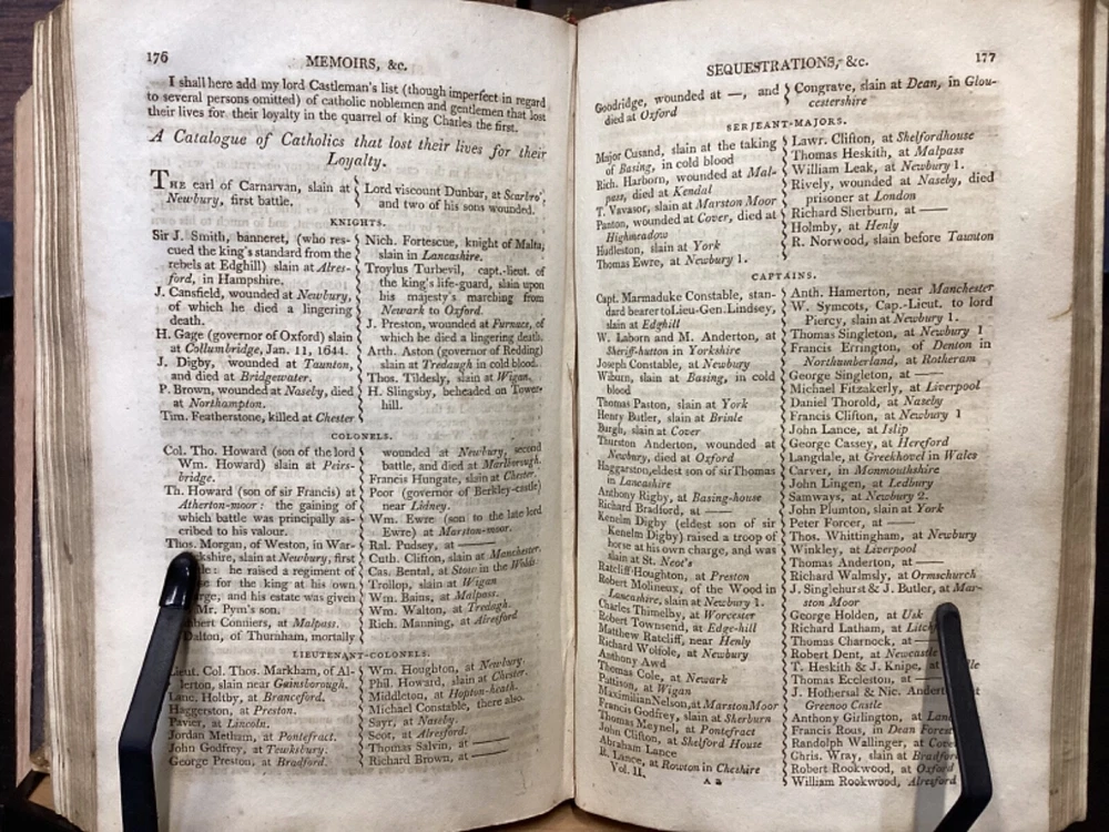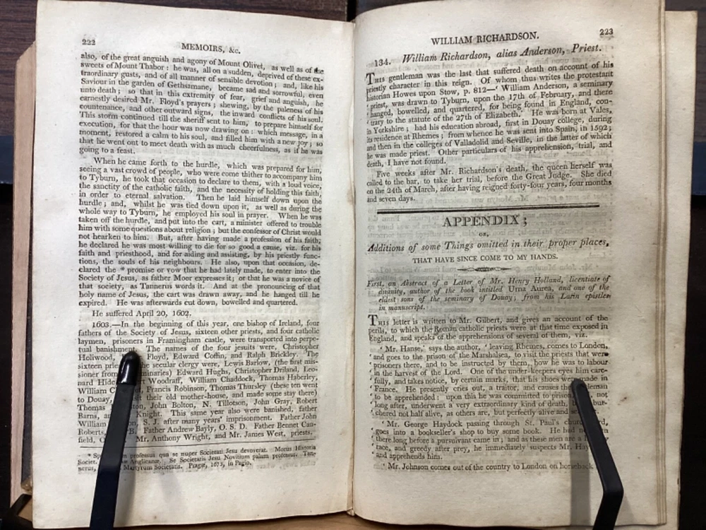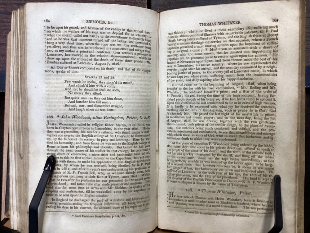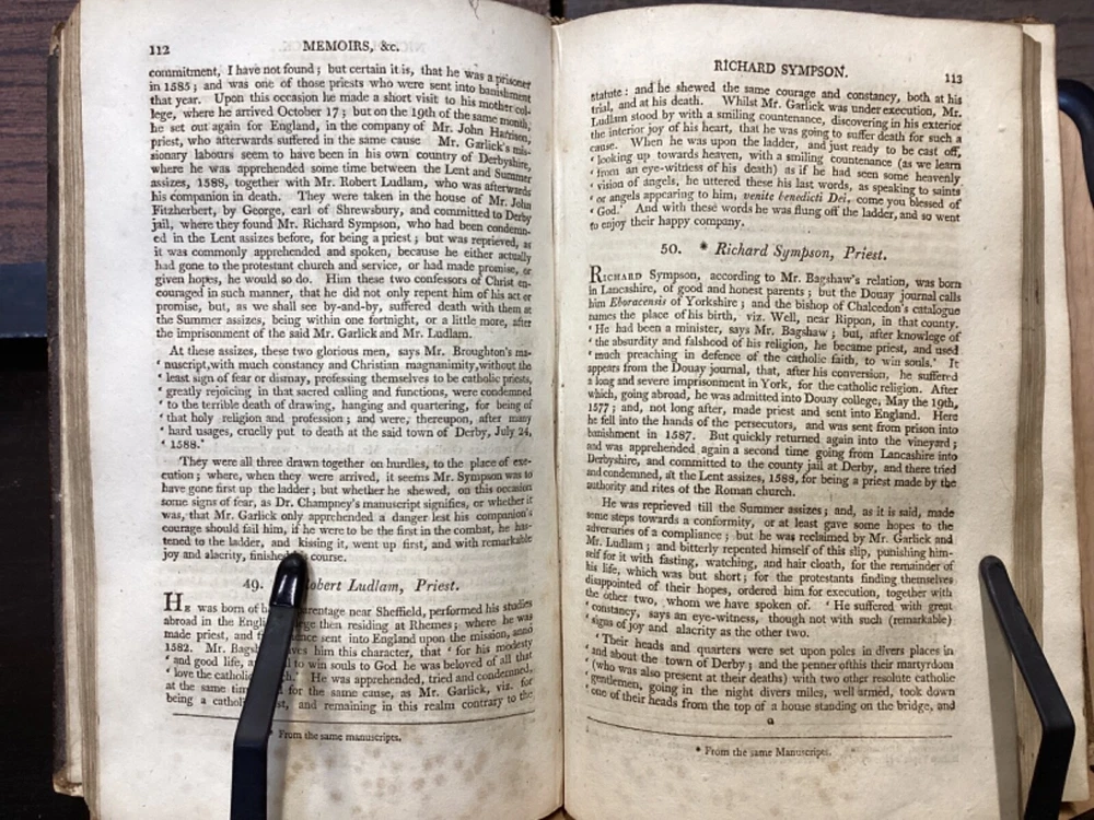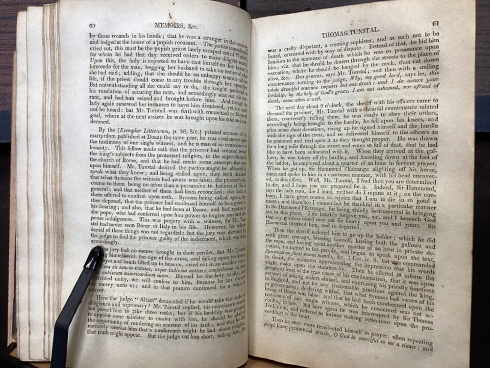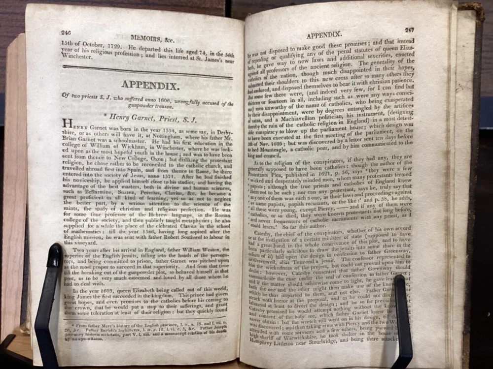 Memoirs of Missionary Priests, and Other Catholics of Both Sexes, That Have Suffered Death in England on Religious Accounts, from the year 1577 to 1684, Volumes 1 and 2, by Bishop Challoner, V.A.L., Mark Wardle, Manchester, 1803, 240pp, 256pp, leather, 5.5 x 8.5", 8vo Fair condition. Wear to front and rear boards. Edges are scuffed and tips bumped with exposed boards. Gilt detailing around edges of both front and rear boards. Front joint is cracked. An instance of worming appears to be present on front board. Spine is cracked and chipped with some exposed binding at tail; illegible. Marginalia on front pastedown and flyleaf. Frontispiece opposite title pages of both volumes. Toning, age-staining, foxing, and tea-staining throughout textblock. Please see photos. Written by Bishop Richard Challoner, these volumes provide a detailed account of the persecution of Catholics in England during the period between 1577 and 1684. Challoner focuses on the stories of Catholic priests and other individuals who were martyred for their faith during this time period. The book includes biographical information about these individuals, as well as descriptions of the events that led to their persecution and eventual death. Challoner also provides a historical context for the persecution of Catholics in England during this time period, including the political and religious factors that contributed to it. FORN-MSB-0224-TUB0006-JC137