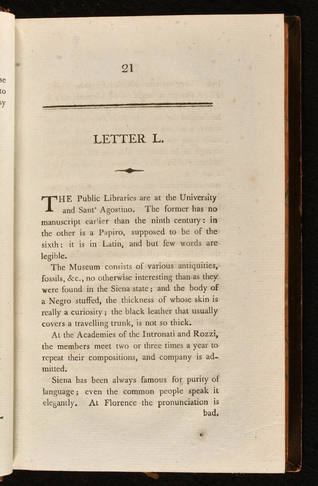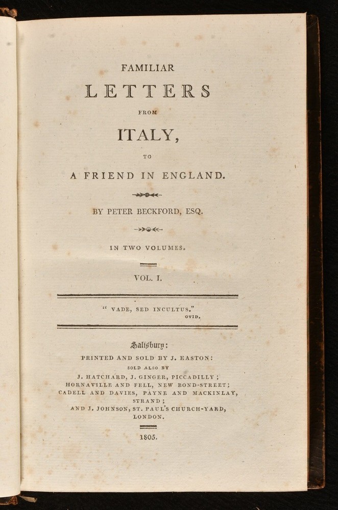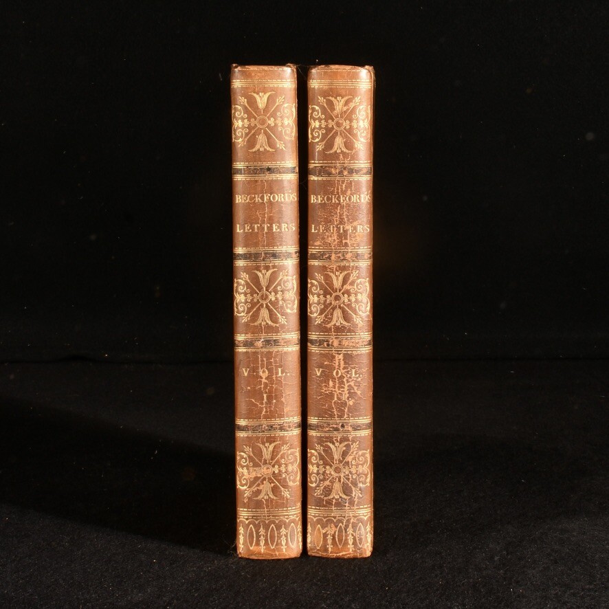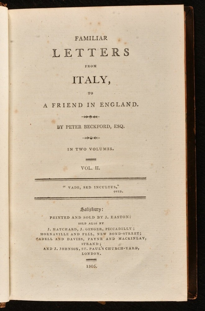 Click here to see our other books! Familiar Letters from Italy, to A Friend in England Peter Beckford 1805 J. Easton : Salisbury 8.5" by 5.5" xii, 450; viii, 454pp SUMMARY A first edition, complete two volume set of Familiar Letters from Italy, to A Friend in England. First Edition,Leather Binding Overall Condition: Very Good This book weighs 2 KG when packed UK Postage: £ 3.99 US Postage: £ 29.99 EU Postage : £ 21.99 European Postage: £ 23.99 Asia Postage: £ 37.99 Worldwide Postage: £ 38.99 DESCRIPTION A complete two volume set. First edition copies. No half title to either volume. These volumes contain a collection of letters by Peter Beckford whilst travelling in Italy largely during the year 1787, before Italy was invaded by the French. A fascinating travel account. CONDITION In full calf binding. Externally, very smart and a little rubbed to the spines. Internally, pages are firmly bound and a little age toned with very light scattered spots. Overall Condition: Very Good GLOSSARY OF TERMS Overall Condition (Dustwrapper condition rating is shown after that for the book itself, where a dustwrapper is present) Fine - Very well preserved copy showing very little wear Very Good Indeed - Only one or two minor faults, really a very attractive copy Very Good - Quite a wide term meaning no major faults but probably several smaller ones often expected given the age of the book, but still a respectable copy Good - Meaning not very good. Some more serious faults as will be described in the condition report under 'condition' Good Only - Meaning one or more faults that could really do with repair Fair - As with good only above but with other faults leaving a compromised copy even after repair Poor - Really bad and possibly seriously incomplete. We only sell books in this condition where their rarity or value makes them attractive none the less. Major defects will be described. GUARANTEE We offer a full money back guarantee on our descriptions. Please ask for details and conditions. We prefer PAYPAL. If you pay via PAYPAL we will post the item off the same or the next working day with the postage you have selected. Please note we cannot accept USD cheques