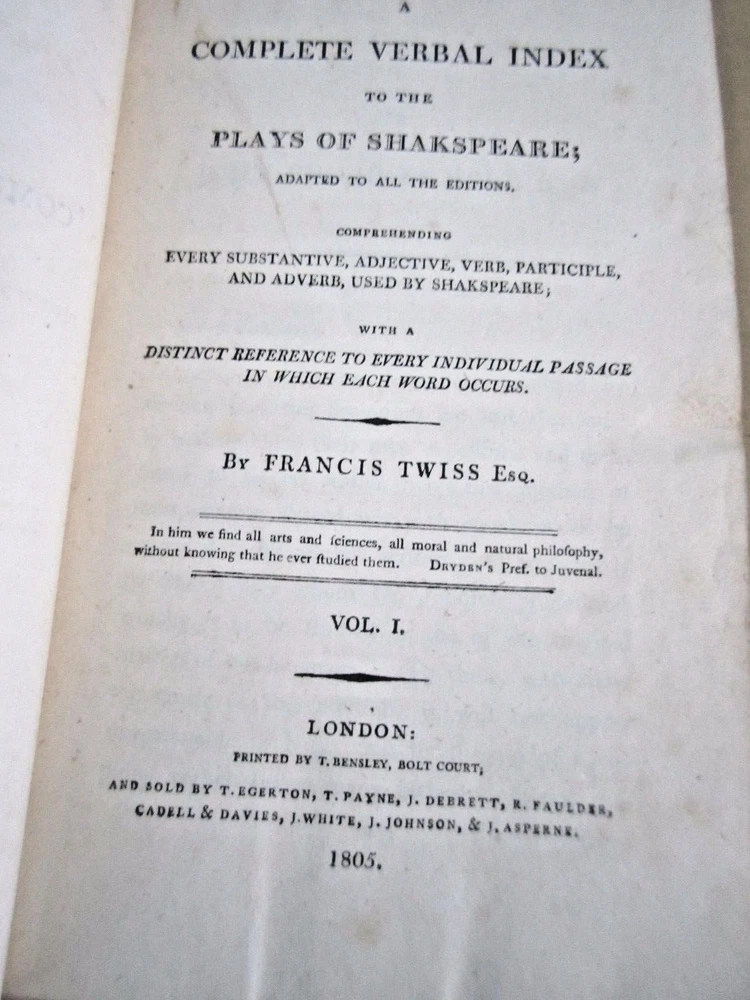 If you are using the Ebay APP and do not see the "Condition Description", please go to the "About this Item" section and hit the arrow to the right. This will lead you to the "Condition Description". Thank you! A Complete Verbal Index to the Plays of Shakespeare [-] With a distinct Reference to every individual Passage in which each Word occurs. volume one of two only. Twiss, Francis Published by London: Printed by T. Bensley, Bolt Court; and sold by T. Egerton, T. Payne [-]., 1805. 564 pgs. At some point Ebay had a bug in their system, resulting in many of my items to lose their photos. Unfortunately, I have too many items to replace all the lost photos. If you are interested in an item that is lacking multiple photos, let me know and I will do my best to provide you with additional images.