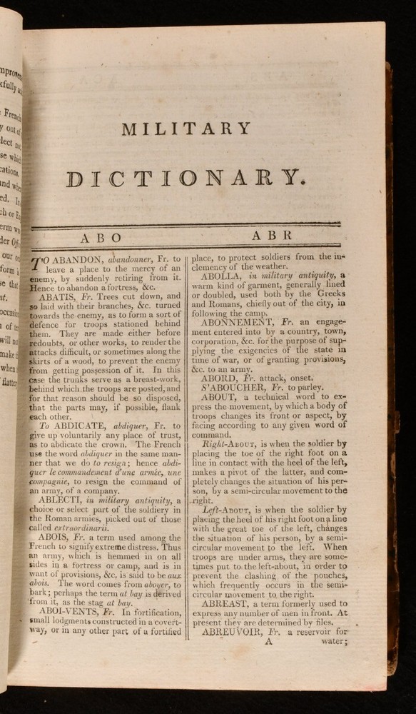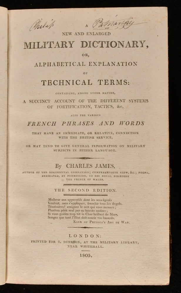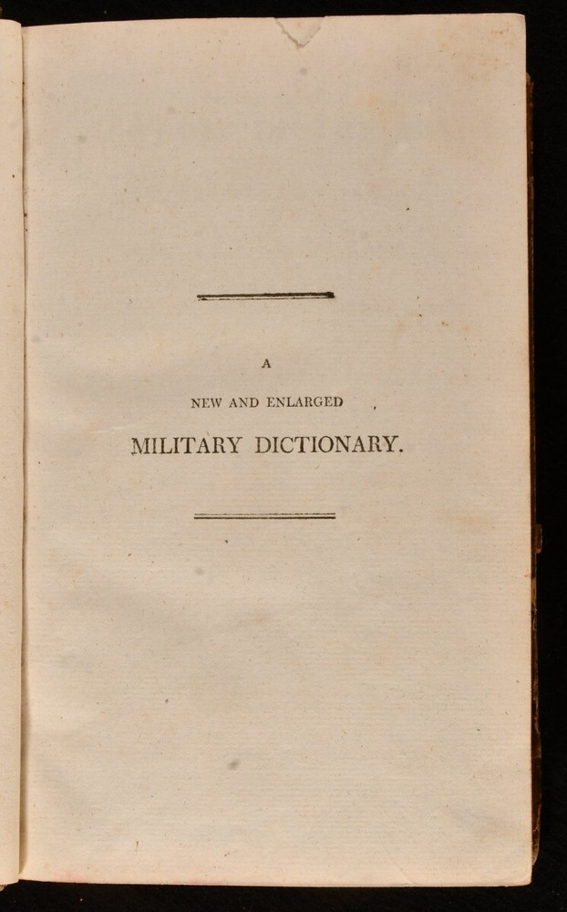 Click here to see our other books! A New and Enlarged Military Dictionary, or, Alphabetical Explanation of Technical Terms Charles James 1805 T. Egerton : London 9" by 6" xlvi, A1-6L3 SUMMARY The second edition of this comprehensive nineteenth-century military dictionary, in contemporary half calf with marbled boards. Early Edition,Leather Binding,Rebound,Scarce Overall Condition: Very Good This book weighs 1.5 KG when packed UK Postage: £ 3.99 US Postage: £ 23.99 EU Postage : £ 18.99 European Postage: £ 19.99 Asia Postage: £ 31.99 Worldwide Postage: £ 32.99 DESCRIPTION A comprehensive early nineteenth century military dictionary, with alphabetical explanations of technical terms and a succinct account of the different systems of fortification, tactics, and more. Also including various French phrases and words that have relation to subjects in British service. The second edition of this work. Written by Charles James, author of the popular 'Regimental Companion'. In contemporary half calf with marbled boards. With the original half title bound in. Containing the contemporary ink signature of one Francis Js. Huelin to the front blank and a small ink signature to the title page. Signature: a1-f3, A1-6L3 CONDITION In contemporary half calf with marbled boards. Externally, smart, with some rubbing and bumping to the joints and extremities. Some light shelf wear to the boards. Containing the contemporary ink signature of one Francis Js. Huelin to the front blank and a small ink signature to the title page. Internally, firmly bound. Pages are generally bright and clean. Overall Condition: Very Good GLOSSARY OF TERMS Overall Condition (Dustwrapper condition rating is shown after that for the book itself, where a dustwrapper is present) Fine - Very well preserved copy showing very little wear Very Good Indeed - Only one or two minor faults, really a very attractive copy Very Good - Quite a wide term meaning no major faults but probably several smaller ones often expected given the age of the book, but still a respectable copy Good - Meaning not very good. Some more serious faults as will be described in the condition report under 'condition' Good Only - Meaning one or more faults that could really do with repair Fair - As with good only above but with other faults leaving a compromised copy even after repair Poor - Really bad and possibly seriously incomplete. We only sell books in this condition where their rarity or value makes them attractive none the less. Major defects will be described. GUARANTEE We offer a full money back guarantee on our descriptions. Please ask for details and conditions. We prefer PAYPAL. If you pay via PAYPAL we will post the item off the same or the next working day with the postage you have selected. Please note we cannot accept USD cheques
