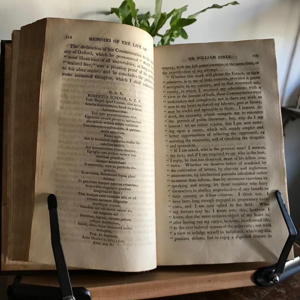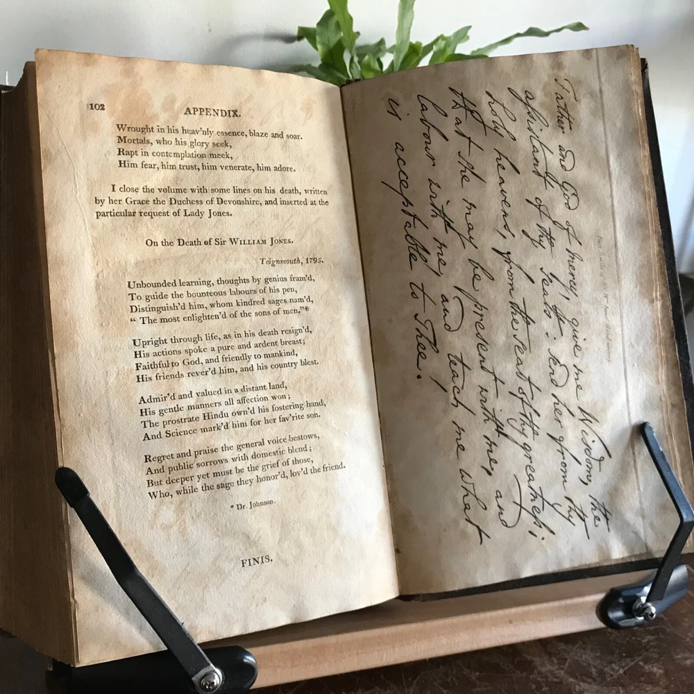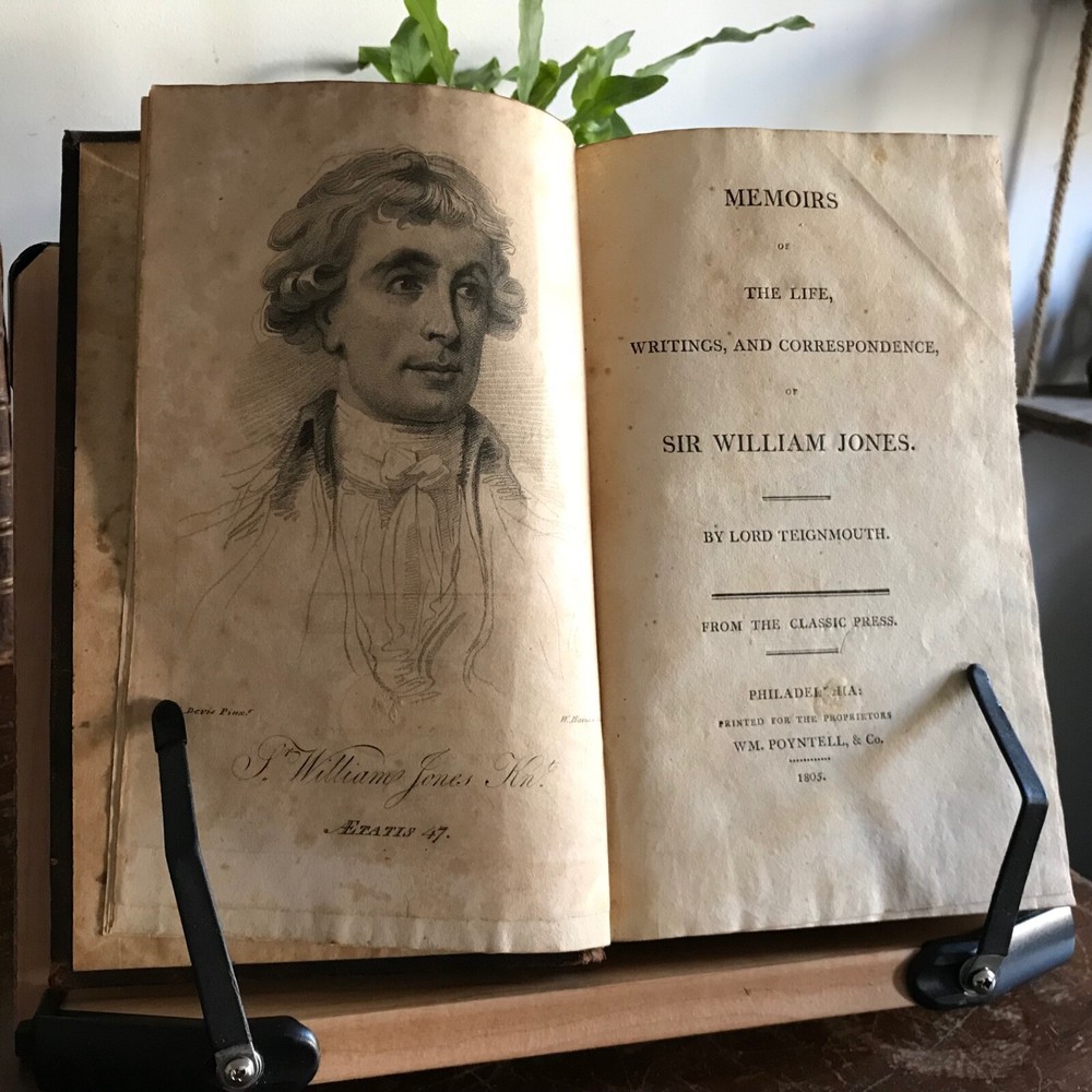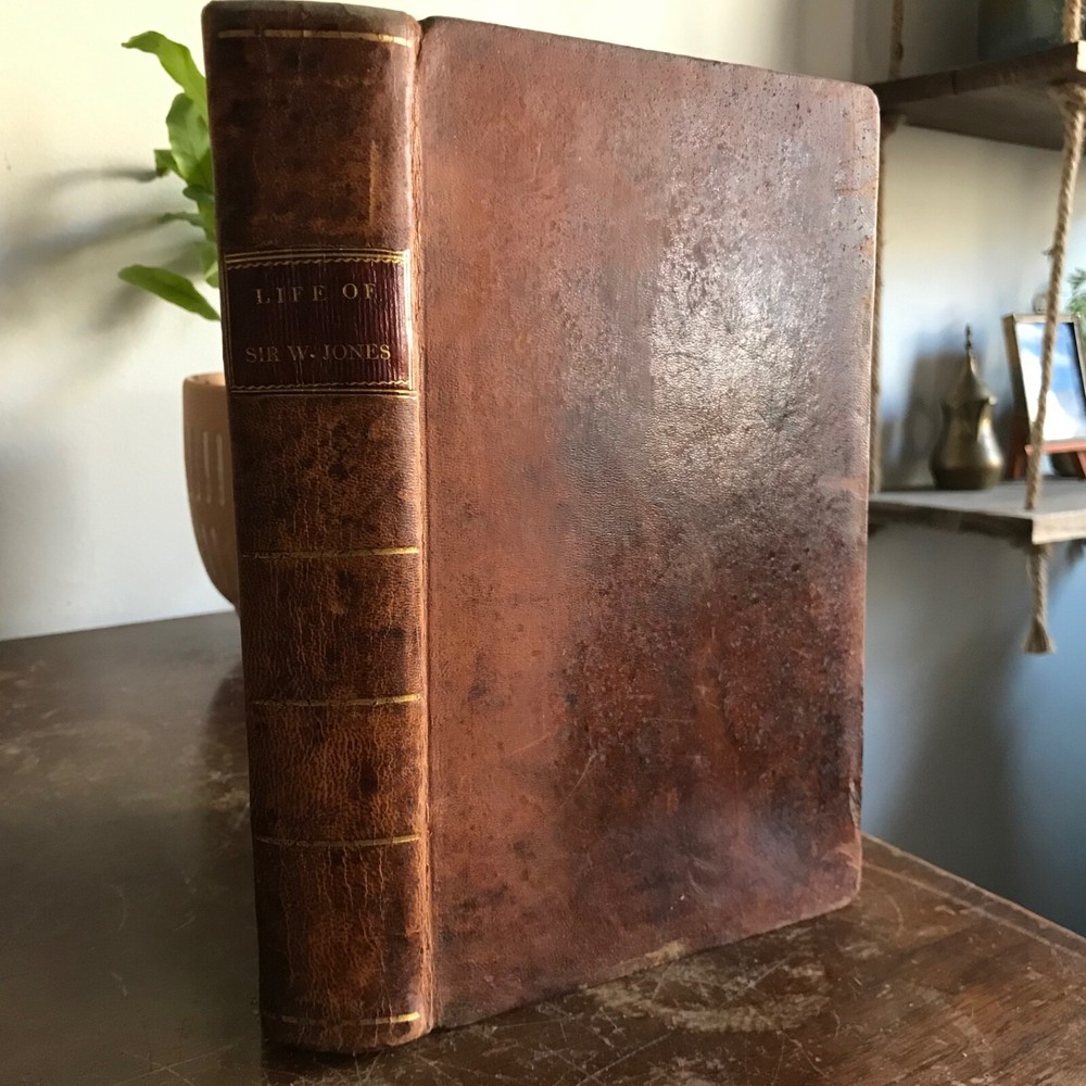 Memoirs of The Life, Writings and Correspondence of Sir William Jones, Lord Teignmouth, From the Classic Press, William Poyntell & Co., Philadelphia, 1805, frontispiece, letter press engraving, 419 pp, 102 pp, full leather, 9 x 6”, 8vo. In good condition. Leather nicely preserved, soft and rich in color. Light wear to extremities. Minimal creasing to spine. End papers toned with moderate foxing. Old hand ownership on fly leaf dated 1805. Light staining and toning to frontispiece. Interior has mild age toning. Free of known markings. Scattered foxing throughout. Binding tight and intact. A solid copy! Please see photos. First American edition. Jones was a judge of the high court at Calcutta from 1783 until his death in 1794, and a respected authority on Indian languages, philosophy and literature. He founded the Asiatic Society of Bengal in 1784, and was the first to discover the relationship between the Sanskrit, Gothic, Greek and Latin languages, and "His clear understanding of the basic principles of scientific linguistics provided the foundation on which Rask, Bopp, and Grimm built the imposing structure of comparative Indo- European studies" COLH1805ABGK
