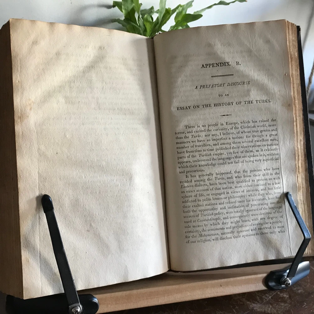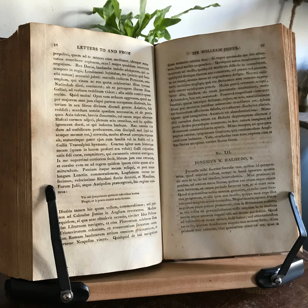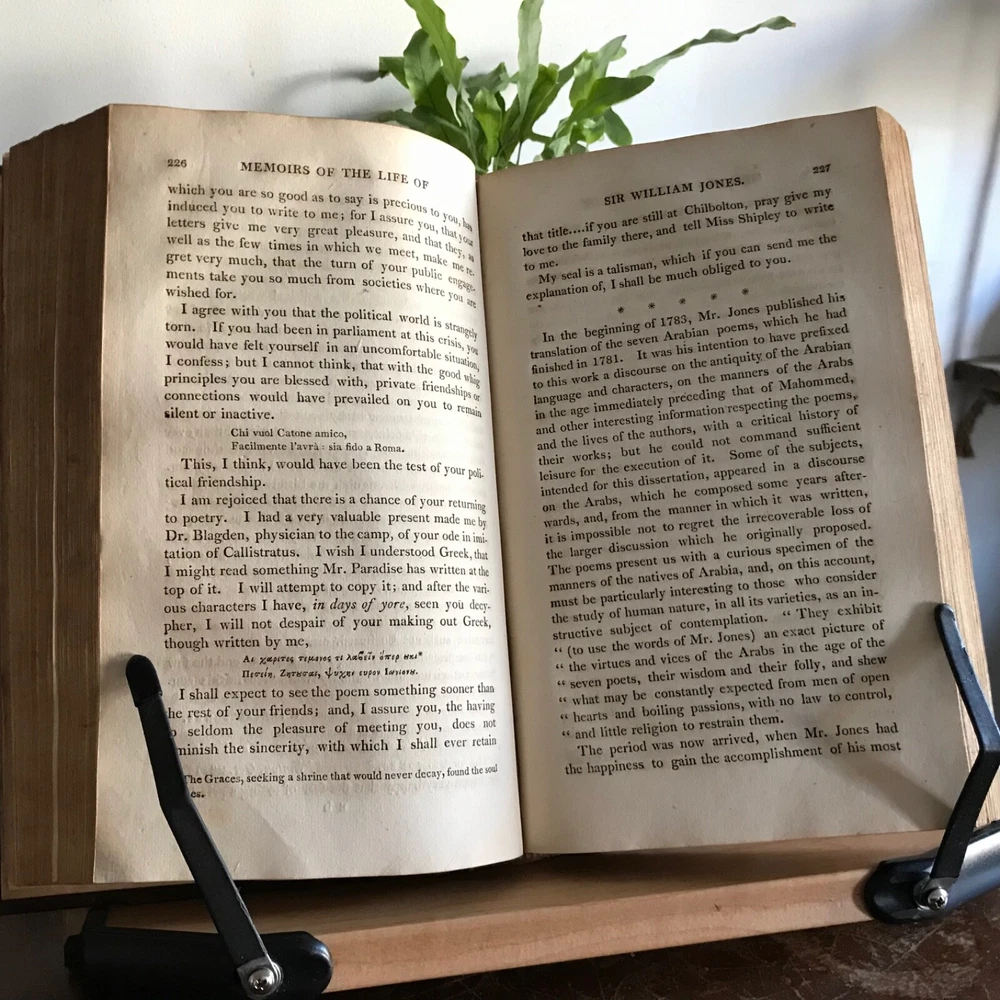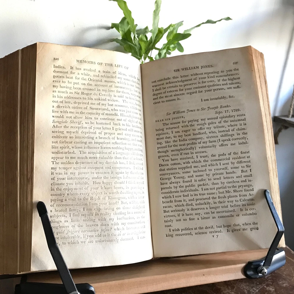 Memoirs of The Life, Writings and Correspondence of Sir William Jones, Lord Teignmouth, From the Classic Press, William Poyntell & Co., Philadelphia, 1805, frontispiece, letter press engraving, 419 pp, 102 pp, full leather, 9 x 6”, 8vo. In good condition. Leather nicely preserved, soft and rich in color. Light wear to extremities. Minimal creasing to spine. End papers toned with moderate foxing. Old hand ownership on fly leaf dated 1805. Light staining and toning to frontispiece. Interior has mild age toning. Free of known markings. Scattered foxing throughout. Binding tight and intact. A solid copy! Please see photos. First American edition. Jones was a judge of the high court at Calcutta from 1783 until his death in 1794, and a respected authority on Indian languages, philosophy and literature. He founded the Asiatic Society of Bengal in 1784, and was the first to discover the relationship between the Sanskrit, Gothic, Greek and Latin languages, and "His clear understanding of the basic principles of scientific linguistics provided the foundation on which Rask, Bopp, and Grimm built the imposing structure of comparative Indo- European studies" COLH1805ABGK