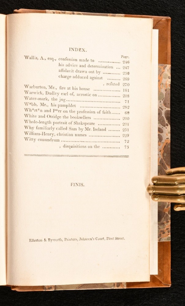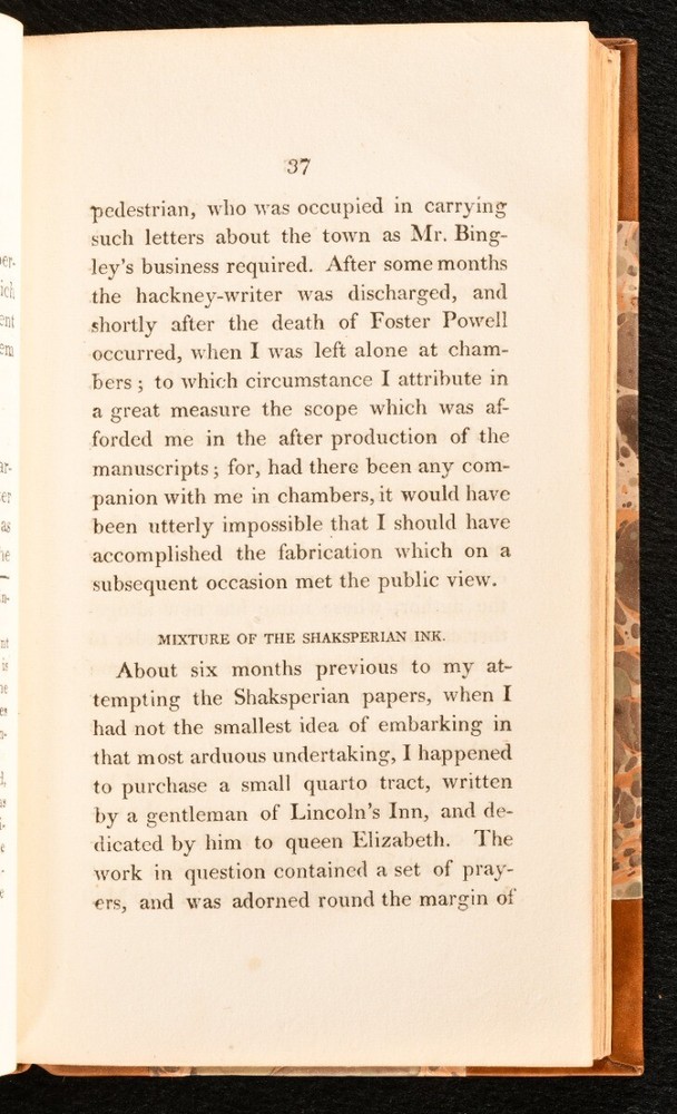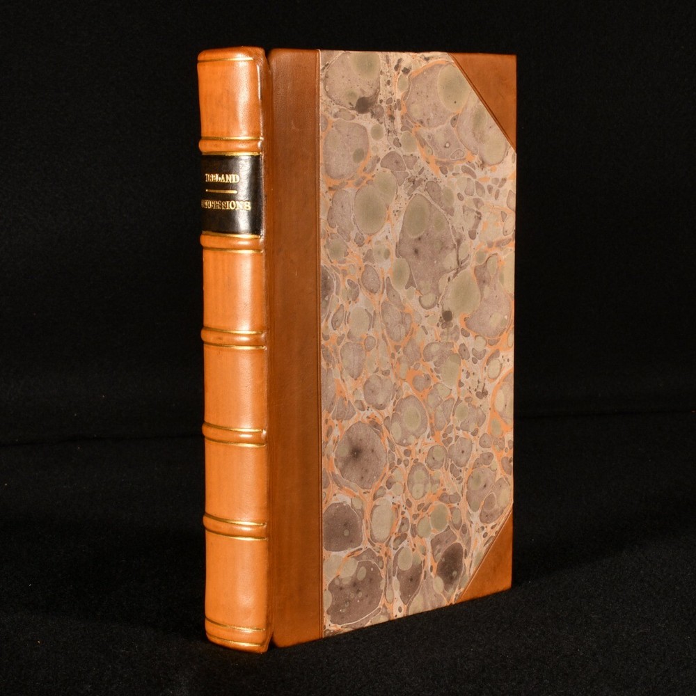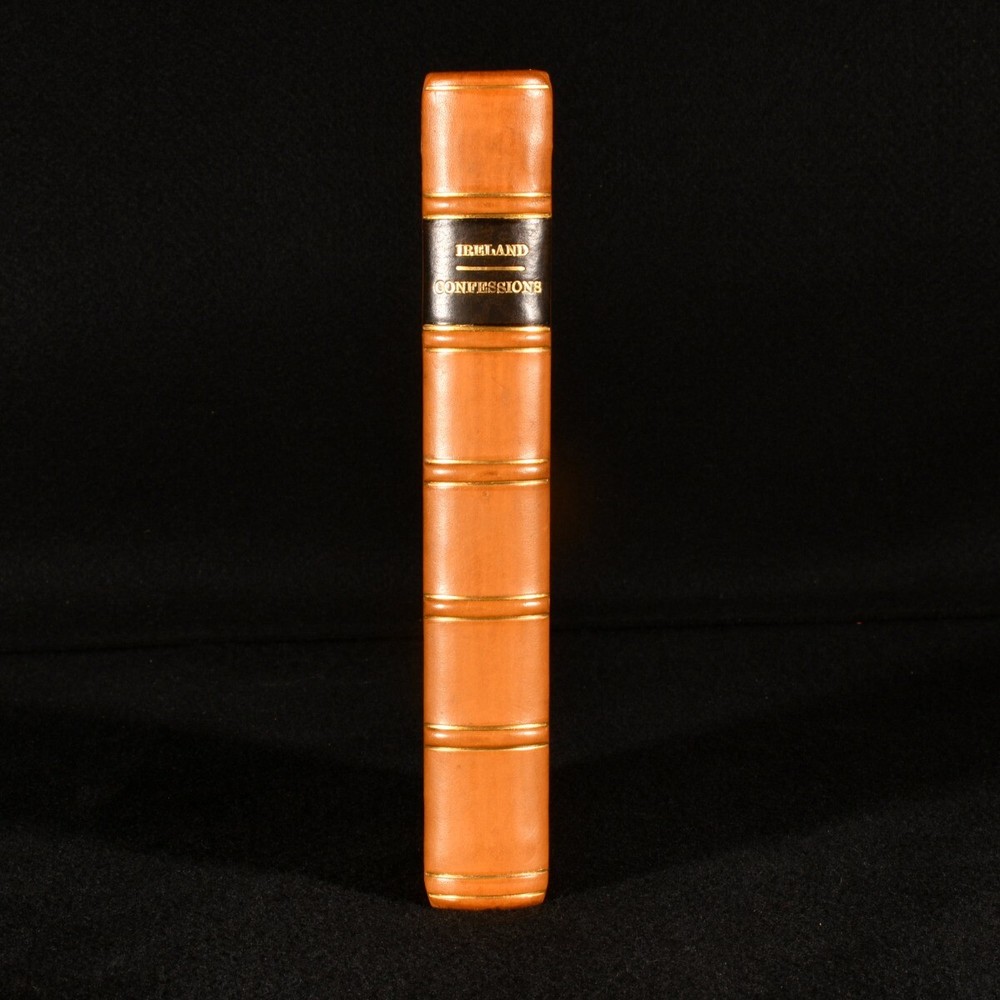 Click here to see our other books! The Confessions of William-Henry Ireland Containing the Particulars of HIs Fabrication of the Shakespearean Manuscripts; Together with Anecdotes and Opinions of many DIstinguished Persons in the Literary, Political, and Theoretical World William-Henry Ireland 1805 Printed for Thomas Goddard : London 7.5" by 4.5" [8], 1-317, [17]pp. SUMMARY A lovely copy of this scarce first edition containing the confessions of famous Shakespearean forger William-Henry Ireland. First Edition,Leather Binding,Pleasing Copy,Rebound,Scarce Overall Condition: Fine This book weighs 0.75 KG when packed UK Postage: £ 3.99 US Postage: £ 19.99 EU Postage : £ 15.99 European Postage: £ 16.99 Asia Postage: £ 21.99 Worldwide Postage: £ 25.99 DESCRIPTION The first edition of this scarce work by William-Henry Ireland, in which he confesses the truth behind his work of fraud and forgery. A thorough and truthful account of Ireland's career. With a detailed look into the Shakespearean manuscripts, and including anecdotes and opinions of relevant people in the literary, political, and theatrical work. Bound without the frontispiece or signature plate. Ireland became famous in the eighteenth and nineteenth century for forging many Shakespearean documents and plays. In an attractive half calf binding over marbled boards. CONDITION In a half calf binding over marbled boards, with five raised bands and new endpapers. Externally, lovely. Internally, firmly bound. The pages are bright and clean. Overall Condition: Fine GLOSSARY OF TERMS Overall Condition (Dustwrapper condition rating is shown after that for the book itself, where a dustwrapper is present) Fine - Very well preserved copy showing very little wear Very Good Indeed - Only one or two minor faults, really a very attractive copy Very Good - Quite a wide term meaning no major faults but probably several smaller ones often expected given the age of the book, but still a respectable copy Good - Meaning not very good. Some more serious faults as will be described in the condition report under 'condition' Good Only - Meaning one or more faults that could really do with repair Fair - As with good only above but with other faults leaving a compromised copy even after repair Poor - Really bad and possibly seriously incomplete. We only sell books in this condition where their rarity or value makes them attractive none the less. Major defects will be described. GUARANTEE We offer a full money back guarantee on our descriptions. Please ask for details and conditions. We prefer PAYPAL. If you pay via PAYPAL we will post the item off the same or the next working day with the postage you have selected. Please note we cannot accept USD cheques