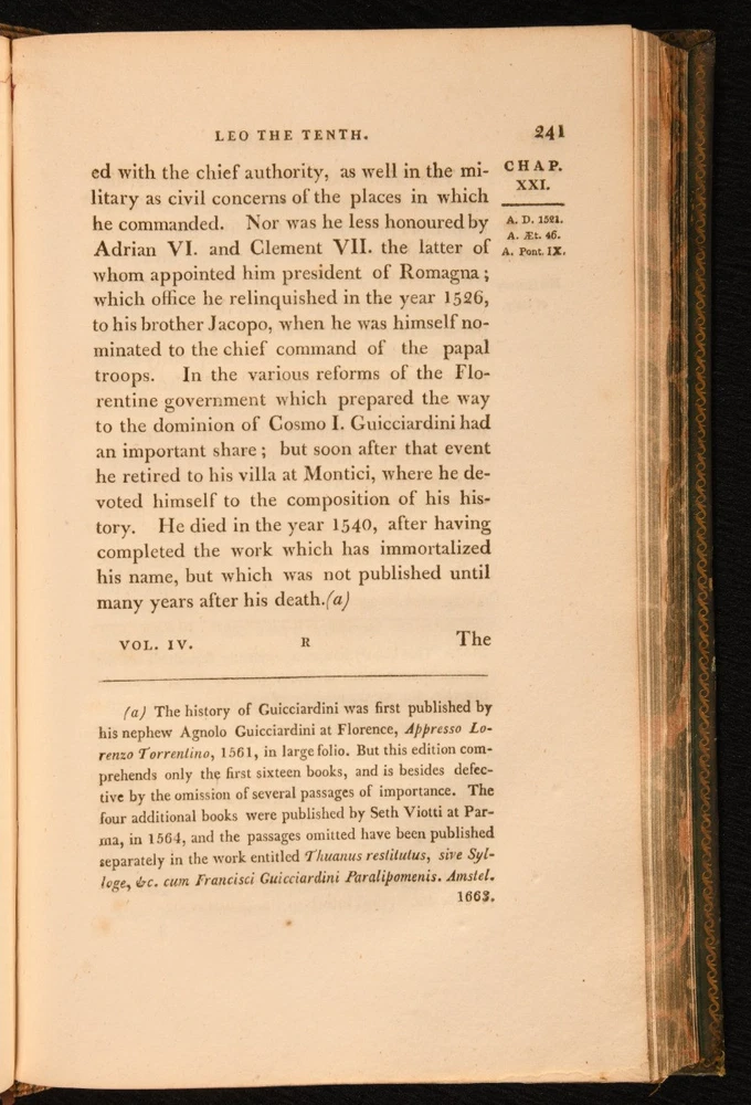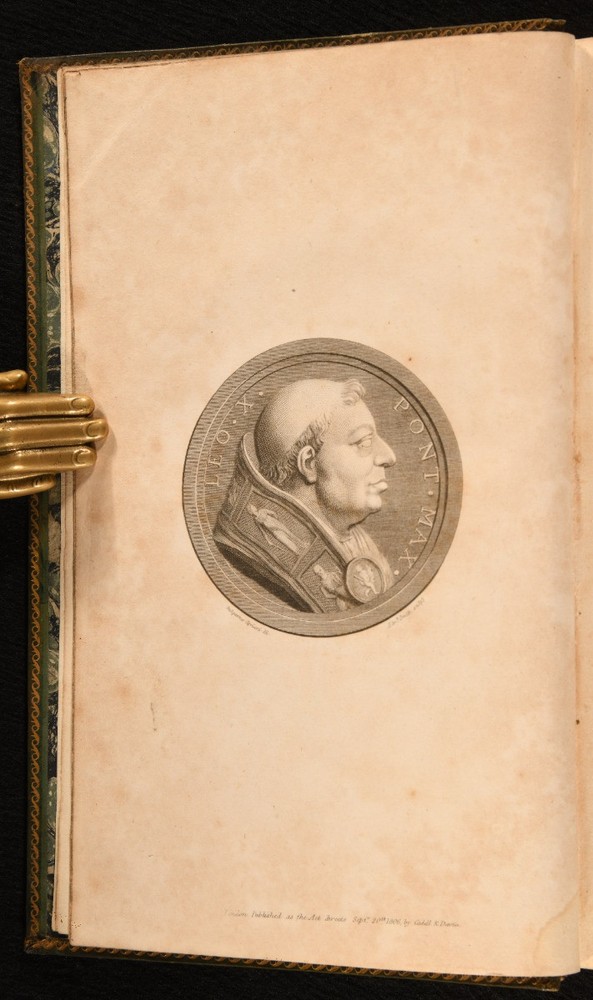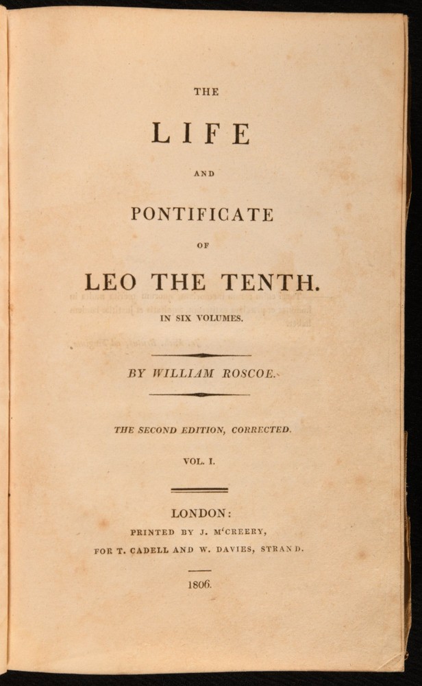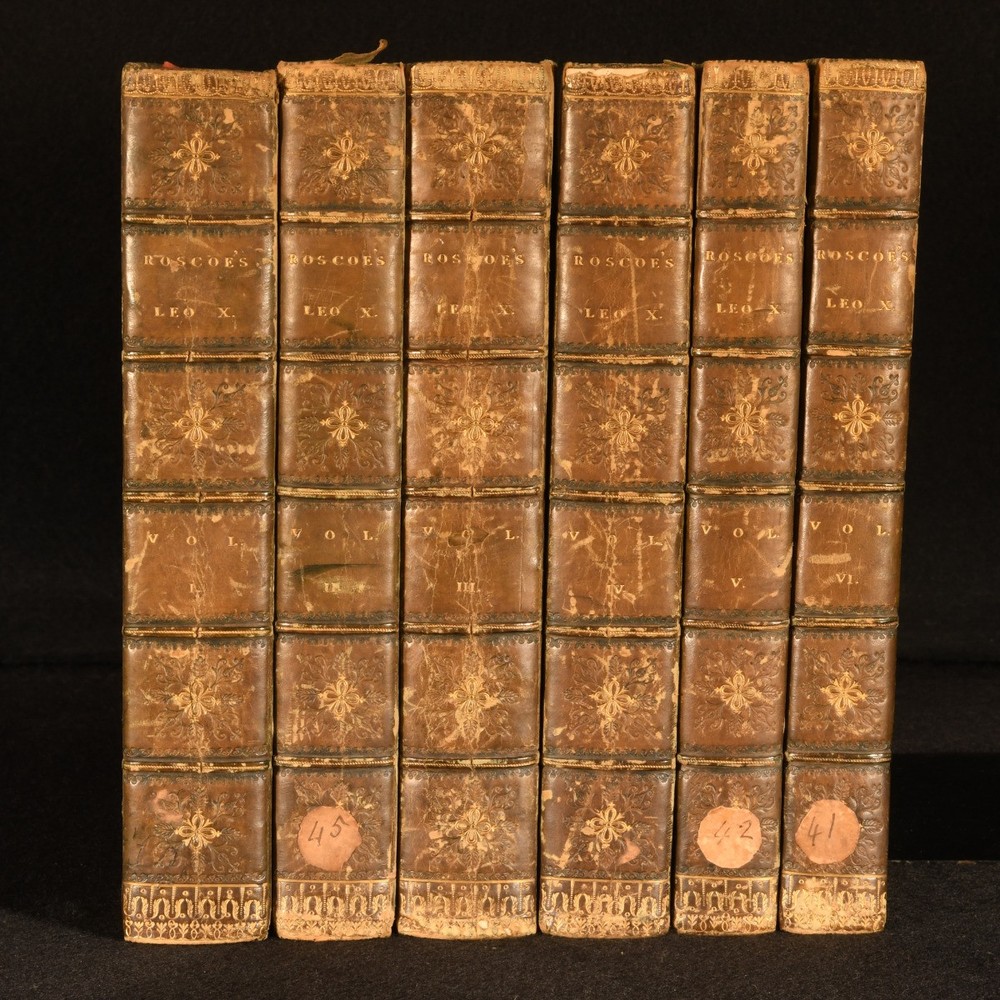 Click here to see our other books! The Life and Pontificate of Leo the Tenth William Roscoe 1806 J. M'Creery; T. Cadell and W. Davies : London 8.5" by 5.5" [4], xlvi, [2], xxiv, 489; [2], 472; [4], 541, [1], 24; [4], 507, [2]; [4], 362; [4], 333, [3pp], lviii SUMMARY The second edition of William Roscoe's important biography on the affluent life of Pope Leo X, part of the infamous de' Medici family. Early Edition,Illustrated,Leather Binding Overall Condition: Good This book weighs 7 KG when packed UK Postage: £ 4.49 US Postage: £ 52.99 EU Postage : £ 30.99 European Postage: £ 55.99 Asia Postage: £ 89.99 Worldwide Postage: £ 189.99 DESCRIPTION The second edition of this work. Complete in six volumes. An extensive biography on Leo X. Illustrated with a frontispiece to Volume I. Pope Leo X was a member of the Medici family, the second son of Lorenzo de' Medici. He served as the head of the Catholic Church and the Ruler of the Papal States from March 1513 to December 1521. Following in the tradition of the de' Medici family, Leo was an indulgent patron of the arts during the Italian Renaissance. It was during his reign that Raphael decorated the Vatican reign. This biography was an important contribution to historical studies. Written by William Roscoe, best known for this important work and the poem 'The Butterfly's Ball'. Roscoe was also one of England's first abolitionists. Collated, bound without the half-title of Volume II. CONDITION In a full straight grain morocco binding. Externally, generally smart, a little rubbed. Spines are faded. Small label to the tail of the spines of Volumes II, V, and VI. Light marks to the boards. Extremities are a little bumped. A small amount of lifting to the head of the spine of Volume II. A small amount of loss to the rear board of Volume III. Internally, generally firmly bound, with a few pages working loose or detached. Pages are lightly age-toned and generally clean with the occasional spot. Overall Condition: Good GLOSSARY OF TERMS Overall Condition (Dustwrapper condition rating is shown after that for the book itself, where a dustwrapper is present) Fine - Very well preserved copy showing very little wear Very Good Indeed - Only one or two minor faults, really a very attractive copy Very Good - Quite a wide term meaning no major faults but probably several smaller ones often expected given the age of the book, but still a respectable copy Good - Meaning not very good. Some more serious faults as will be described in the condition report under 'condition' Good Only - Meaning one or more faults that could really do with repair Fair - As with good only above but with other faults leaving a compromised copy even after repair Poor - Really bad and possibly seriously incomplete. We only sell books in this condition where their rarity or value makes them attractive none the less. Major defects will be described. GUARANTEE We offer a full money back guarantee on our descriptions. Please ask for details and conditions. We prefer PAYPAL. If you pay via PAYPAL we will post the item off the same or the next working day with the postage you have selected. Please note we cannot accept USD cheques