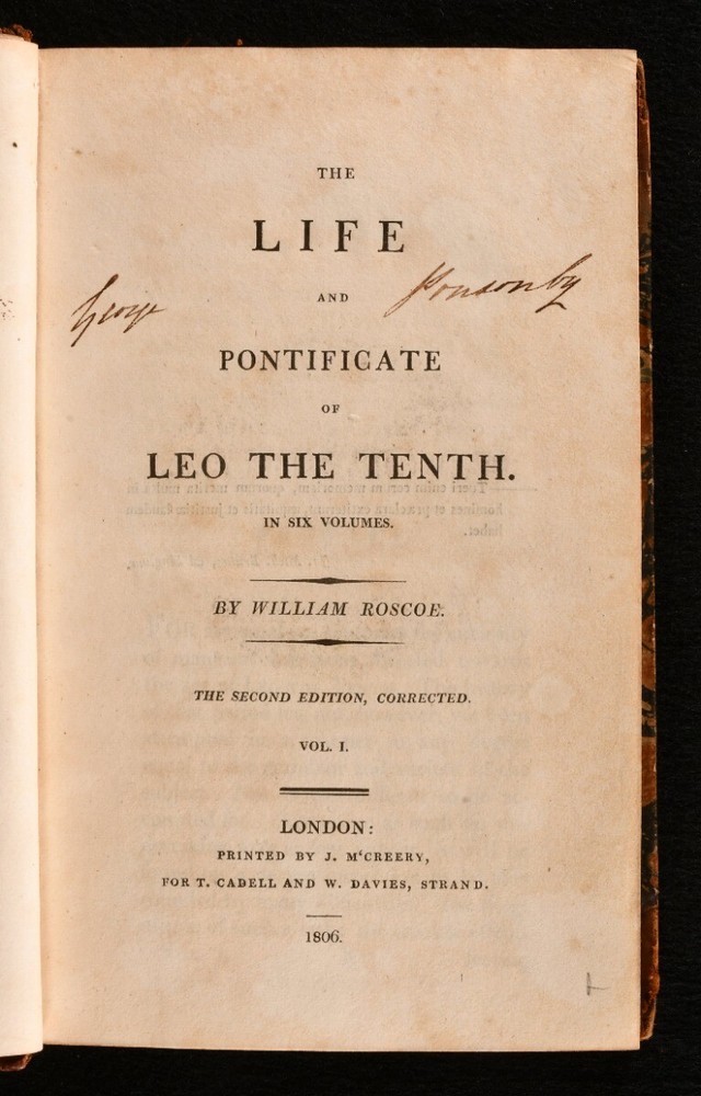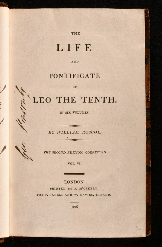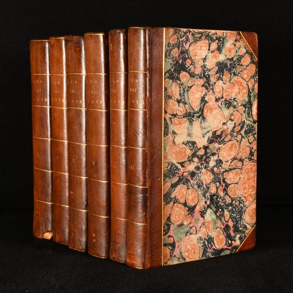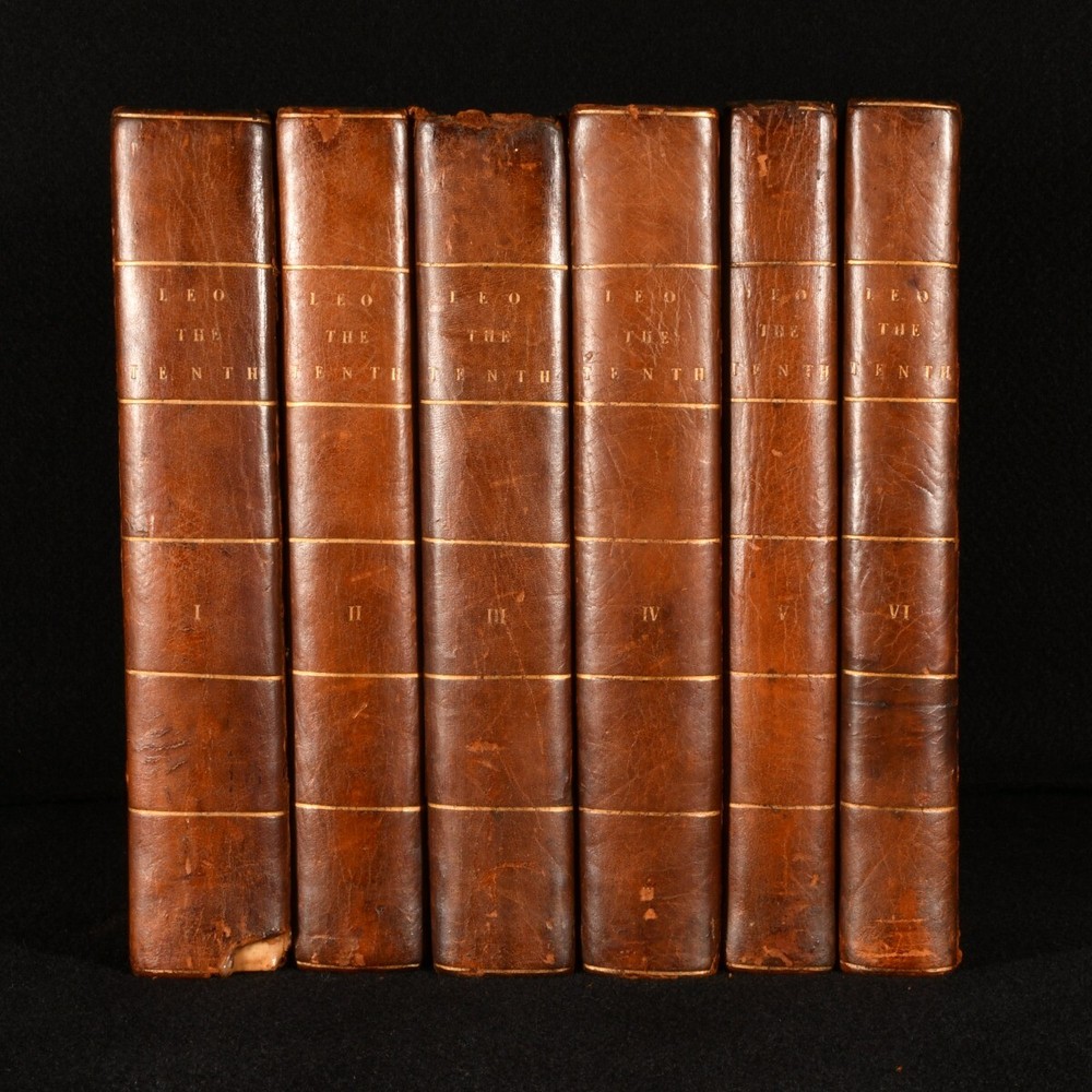 Click here to see our other books! The Life and Pontificate of Leo the Tenth William Roscoe 1806 J. M’Creery for T. Cadell and W. Davies : London 8.5” by 5.5” xxiv, 1-489; [4], 1-472; [4], 1-541, [1-24]; [4], 1-507; xxvi, [2], 1-362; [4], 1-333, [2], i-lviii, [1]pp. SUMMARY The biographical account of Pope Leo X and his pontificate in six extensive volumes by William Roscoe. Early Edition,Illustrated,Leather Binding,Rebound Overall Condition: Very Good This book weighs 5 KG when packed UK Postage: £ 4.49 US Postage: £ 42.99 EU Postage : £ 27.99 European Postage: £ 45.99 Asia Postage: £ 74.99 Worldwide Postage: £ 129.99 DESCRIPTION A second corrected edition complete in six volumes of William Roscoe’s biographical account of Pope Leo X. Born into the prominent political Italian family of Medici of Florence, he was the second son of Lorenzo de’ Medici, and was elevated to the cardinalate in 1489. He was not only the head of the Christian Church, but also the temporal ruler of the Papal States and head of the Medici family that ruled the Florentine Republic. He is known for often resorting to the common practice of nepotism to exert his influence in Italy. Roscoe’s ‘Life of Leo the Tenth’ first appeared in 1805. This is the second edition of 1806. William Roscoe, although best known for his poem for children ‘The Butterfly’s Ball and the Grasshopper’s Feast,’ was also respected as a historian and art collector in his time. In particular, this study of the life and pontificate of Leo X, together with his work on Lorenzo de’ Medici are considered to be important contributions to historical literature. With a dissertation and an extensive appendix to volume V and VI. Bound in a half calf over marbled boards, complete with frontispiece and half-titles. Illustrated with a frontispiece to the first volume and the occasional engraving in text. CONDITION In a half calf binding over marbled boards. Externally very smart with only minor shelf wear and a minor rubbing to the spine. With a minimal loss to the tail of the spine of volume one. The front joints of the first three volumes are starting with a slight cracking to the leather, but firm nonetheless. With Henry Arthur Lascelles’ bookplate to the front pastedown of each volume. Each volume has a previous ownership signature to the title page. Internally, firmly bound. With some minor faint scattered spotting to the occasional leaf, particularly to the first and last although, generally, the pages are bright and clean throughout. Illustrated with a frontispiece to the first volume and the occasional engraving in text. Overall Condition: Very Good GLOSSARY OF TERMS Overall Condition (Dustwrapper condition rating is shown after that for the book itself, where a dustwrapper is present) Fine - Very well preserved copy showing very little wear Very Good Indeed - Only one or two minor faults, really a very attractive copy Very Good - Quite a wide term meaning no major faults but probably several smaller ones often expected given the age of the book, but still a respectable copy Good - Meaning not very good. Some more serious faults as will be described in the condition report under 'condition' Good Only - Meaning one or more faults that could really do with repair Fair - As with good only above but with other faults leaving a compromised copy even after repair Poor - Really bad and possibly seriously incomplete. We only sell books in this condition where their rarity or value makes them attractive none the less. Major defects will be described. GUARANTEE We offer a full money back guarantee on our descriptions. Please ask for details and conditions. We prefer PAYPAL. If you pay via PAYPAL we will post the item off the same or the next working day with the postage you have selected. Please note we cannot accept USD cheques