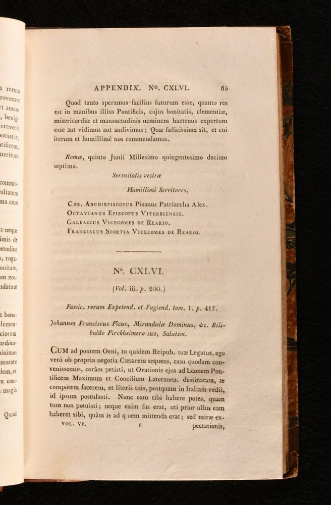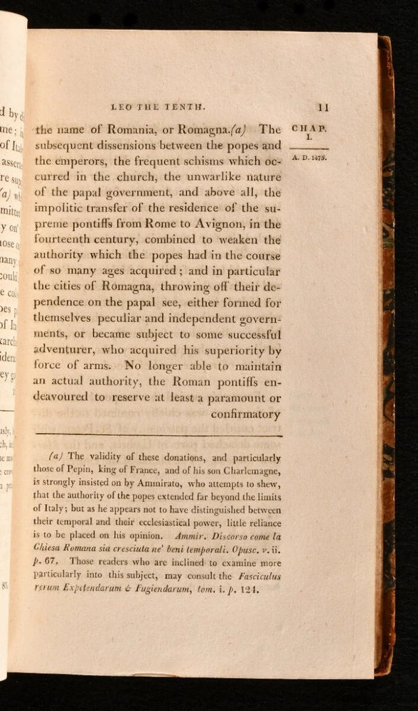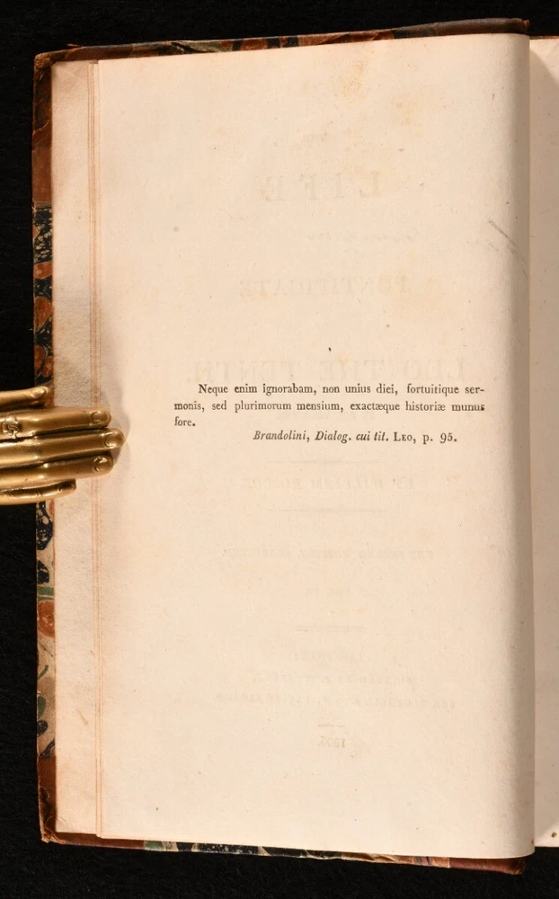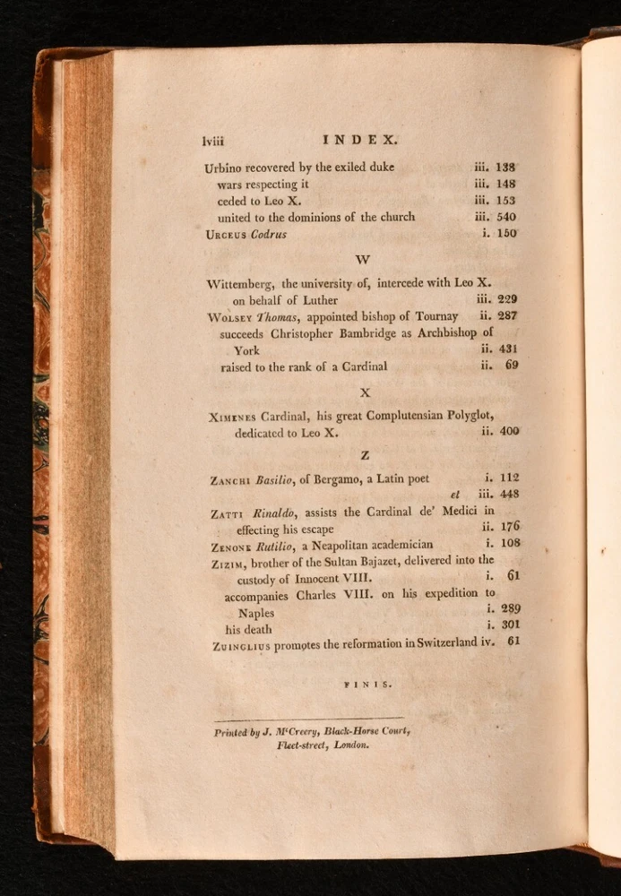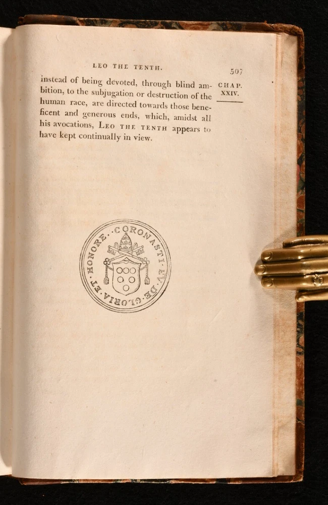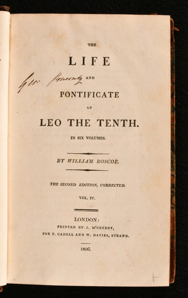Click here to see our other books! The Life and Pontificate of Leo the Tenth William Roscoe 1806 J. M’Creery for T. Cadell and W. Davies : London 8.5” by 5.5” xxiv, 1-489; [4], 1-472; [4], 1-541, [1-24]; [4], 1-507; xxvi, [2], 1-362; [4], 1-333, [2], i-lviii, [1]pp. SUMMARY The biographical account of Pope Leo X and his pontificate in six extensive volumes by William Roscoe. Early Edition,Illustrated,Leather Binding,Rebound Overall Condition: Very Good This book weighs 5 KG when packed UK Postage: £ 4.49 US Postage: £ 42.99 EU Postage : £ 27.99 European Postage: £ 45.99 Asia Postage: £ 74.99 Worldwide Postage: £ 129.99 DESCRIPTION A second corrected edition complete in six volumes of William Roscoe’s biographical account of Pope Leo X. Born into the prominent political Italian family of Medici of Florence, he was the second son of Lorenzo de’ Medici, and was elevated to the cardinalate in 1489. He was not only the head of the Christian Church, but also the temporal ruler of the Papal States and head of the Medici family that ruled the Florentine Republic. He is known for often resorting to the common practice of nepotism to exert his influence in Italy. Roscoe’s ‘Life of Leo the Tenth’ first appeared in 1805. This is the second edition of 1806. William Roscoe, although best known for his poem for children ‘The Butterfly’s Ball and the Grasshopper’s Feast,’ was also respected as a historian and art collector in his time. In particular, this study of the life and pontificate of Leo X, together with his work on Lorenzo de’ Medici are considered to be important contributions to historical literature. With a dissertation and an extensive appendix to volume V and VI. Bound in a half calf over marbled boards, complete with frontispiece and half-titles. Illustrated with a frontispiece to the first volume and the occasional engraving in text. CONDITION In a half calf binding over marbled boards. Externally very smart with only minor shelf wear and a minor rubbing to the spine. With a minimal loss to the tail of the spine of volume one. The front joints of the first three volumes are starting with a slight cracking to the leather, but firm nonetheless. With Henry Arthur Lascelles’ bookplate to the front pastedown of each volume. Each volume has a previous ownership signature to the title page. Internally, firmly bound. With some minor faint scattered spotting to the occasional leaf, particularly to the first and last although, generally, the pages are bright and clean throughout. Illustrated with a frontispiece to the first volume and the occasional engraving in text. Overall Condition: Very Good GLOSSARY OF TERMS Overall Condition (Dustwrapper condition rating is shown after that for the book itself, where a dustwrapper is present) Fine - Very well preserved copy showing very little wear Very Good Indeed - Only one or two minor faults, really a very attractive copy Very Good - Quite a wide term meaning no major faults but probably several smaller ones often expected given the age of the book, but still a respectable copy Good - Meaning not very good. Some more serious faults as will be described in the condition report under 'condition' Good Only - Meaning one or more faults that could really do with repair Fair - As with good only above but with other faults leaving a compromised copy even after repair Poor - Really bad and possibly seriously incomplete. We only sell books in this condition where their rarity or value makes them attractive none the less. Major defects will be described. GUARANTEE We offer a full money back guarantee on our descriptions. Please ask for details and conditions. We prefer PAYPAL. If you pay via PAYPAL we will post the item off the same or the next working day with the postage you have selected. Please note we cannot accept USD cheques
