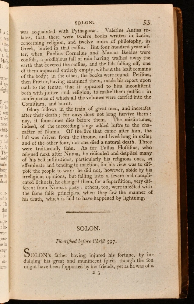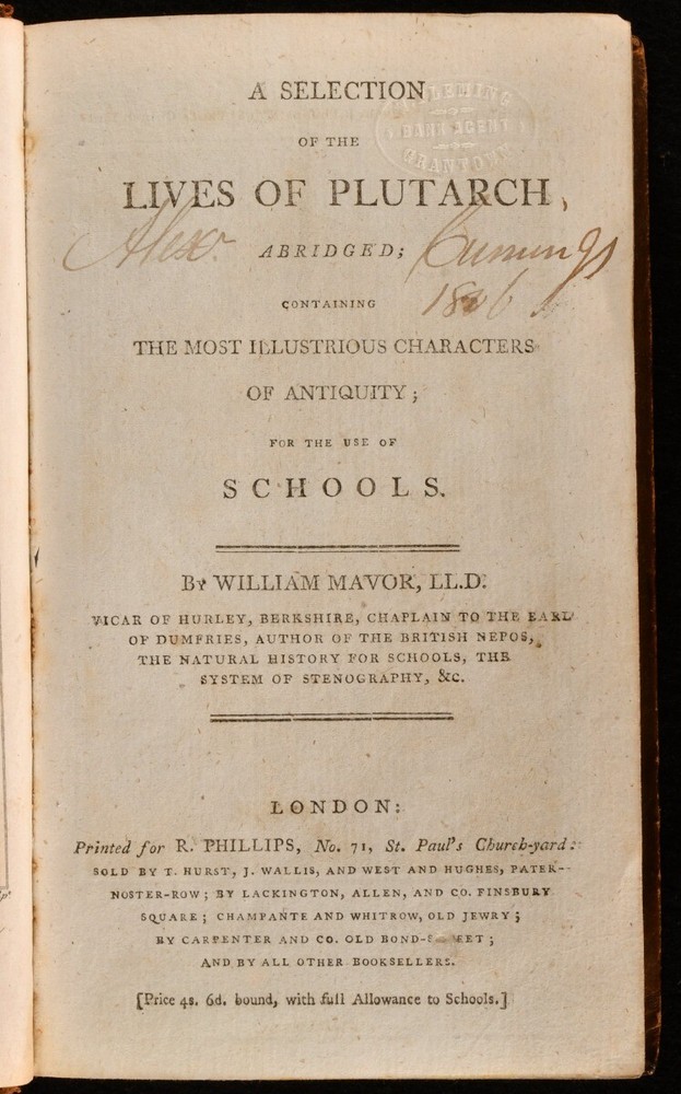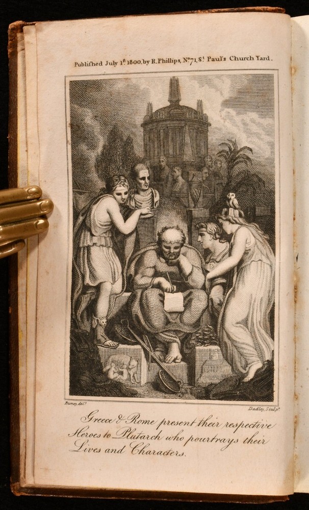 Click here to see our other books! A Selection of the Lives of Plutarch Abridged; Containing the Most Illustrious Characters of Antiquity; for the use of Schools William Mavor; Plutarch 1806 R. Phillips : London 7.5" by 4.5" 2-443 [5]pp SUMMARY A charming volume of seven of Plutarch's biographies of famous Greek and Roman figures, abridged for schools and in a smart tree calf binding. Leather Binding,Scarce Overall Condition: Very Good This book weighs 0.5 KG when packed UK Postage: £ 3.99 US Postage: £ 15.99 EU Postage : £ 13.99 European Postage: £ 14.99 Asia Postage: £ 18.99 Worldwide Postage: £ 19.99 DESCRIPTION A scarce early nineteenth century edition of Greek philosopher Plutarch's 'Parallel Lives', here abridged and significantly revised for use in schools by Scottish educator and priest William Mavor. First published in 1800 and scarce in all early editions, Mavor includes seventeen of Plutarch' forty-eight biographies of famous men. Written at the beginning of the second century AD, Plutarch's concern was not historical detail but rather with exploring the influence of character, good or bad, on the lives and destinies of famous men. Illustrated with an engraved frontispiece. With the contemporary inscription of Max Cummings, 1806, to the title page, and the blind stamp of a bank agent to the title page also. A charming volume of biographies of historical figures including Cicero, Julius Ceasar, Alexander the Great and Dimosthenes. CONDITION In a full tree calf binding. Rubbing to back strip head, tail and joints, with small losses to leather in these regions. Internally, firmly bound. Blind stamp and contemporary inscription to title page. Spotting to first few leaves, with pages otherwise generally clean and bright. Overall Condition: Very Good GLOSSARY OF TERMS Overall Condition (Dustwrapper condition rating is shown after that for the book itself, where a dustwrapper is present) Fine - Very well preserved copy showing very little wear Very Good Indeed - Only one or two minor faults, really a very attractive copy Very Good - Quite a wide term meaning no major faults but probably several smaller ones often expected given the age of the book, but still a respectable copy Good - Meaning not very good. Some more serious faults as will be described in the condition report under 'condition' Good Only - Meaning one or more faults that could really do with repair Fair - As with good only above but with other faults leaving a compromised copy even after repair Poor - Really bad and possibly seriously incomplete. We only sell books in this condition where their rarity or value makes them attractive none the less. Major defects will be described. GUARANTEE We offer a full money back guarantee on our descriptions. Please ask for details and conditions. We prefer PAYPAL. If you pay via PAYPAL we will post the item off the same or the next working day with the postage you have selected. Please note we cannot accept USD cheques