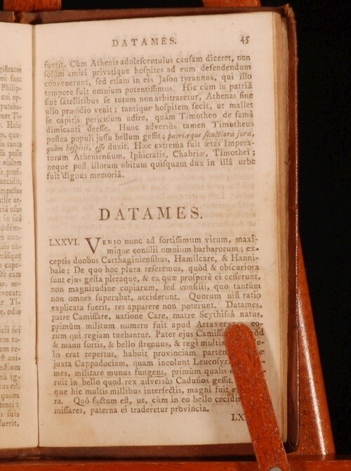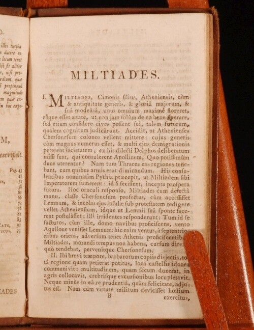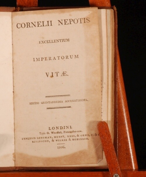 Click here to see our other books! Cornelii Nepotis Excellentium Imperatorum Vitae Michael Maittaire 1806 Longman, Hurst, Rees, & Orme, et al : London 6" by 3.5" [8pp], 106pp, [6pp] SUMMARY An early nineteenth century edition of Maittaire's biography of Cornelius Nepos, in a full calf binding. Leather Binding,Original Binding Overall Condition: Very Good This book weighs 0.5 KG when packed UK Postage: £ 3.99 US Postage: £ 15.99 EU Postage : £ 13.99 European Postage: £ 14.99 Asia Postage: £ 18.99 Worldwide Postage: £ 19.99 DESCRIPTION A biography about the Roman biographer Cornelius Nepos. In Latin. Michael Maittaire, (1668 - 1747), was a French born British classical scholar, bibliographer, and typographer. From "the early 1700s he devoted himself to scholarship and began to publish extensively, nearly seventy individual works being attributed to him, mostly in the fields of classics and typography. He lived for much of his life at various residences in London. CONDITION In a full contemporary calf binding. Externally, rubbed to the extremities, with a small section missing from the front and rear board, and one small instance of past worming to the spine. Internally, firmly bound. Pages are bright with the occasional spot. With an ink signature to the bottom margin of page 29. Overall Condition: Very Good GLOSSARY OF TERMS Overall Condition (Dustwrapper condition rating is shown after that for the book itself, where a dustwrapper is present) Fine - Very well preserved copy showing very little wear Very Good Indeed - Only one or two minor faults, really a very attractive copy Very Good - Quite a wide term meaning no major faults but probably several smaller ones often expected given the age of the book, but still a respectable copy Good - Meaning not very good. Some more serious faults as will be described in the condition report under 'condition' Good Only - Meaning one or more faults that could really do with repair Fair - As with good only above but with other faults leaving a compromised copy even after repair Poor - Really bad and possibly seriously incomplete. We only sell books in this condition where their rarity or value makes them attractive none the less. Major defects will be described. GUARANTEE We offer a full money back guarantee on our descriptions. Please ask for details and conditions. We prefer PAYPAL. If you pay via PAYPAL we will post the item off the same or the next working day with the postage you have selected. Please note we cannot accept USD cheques