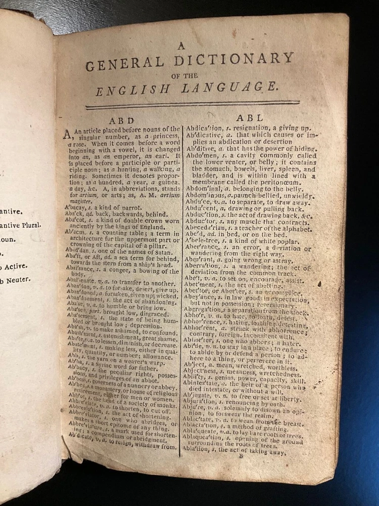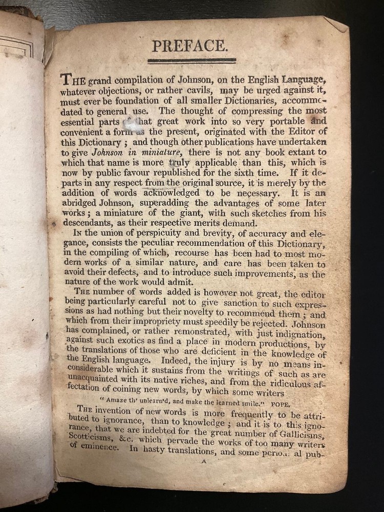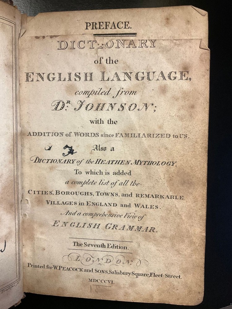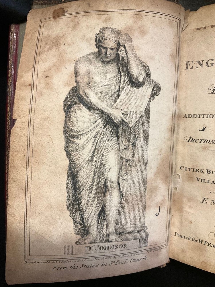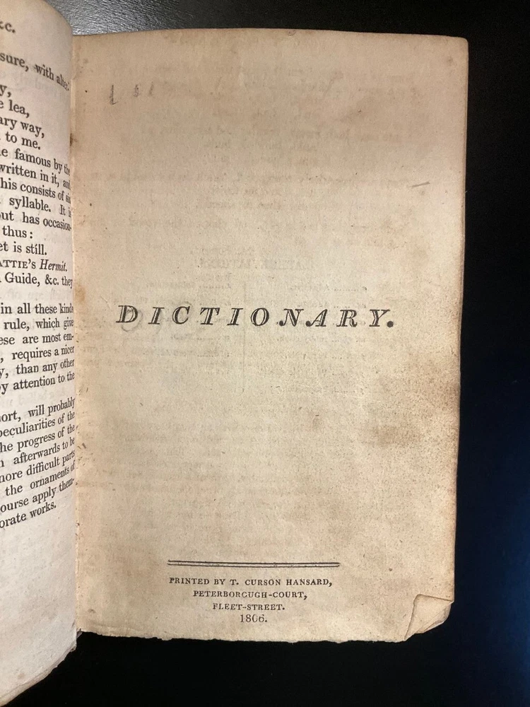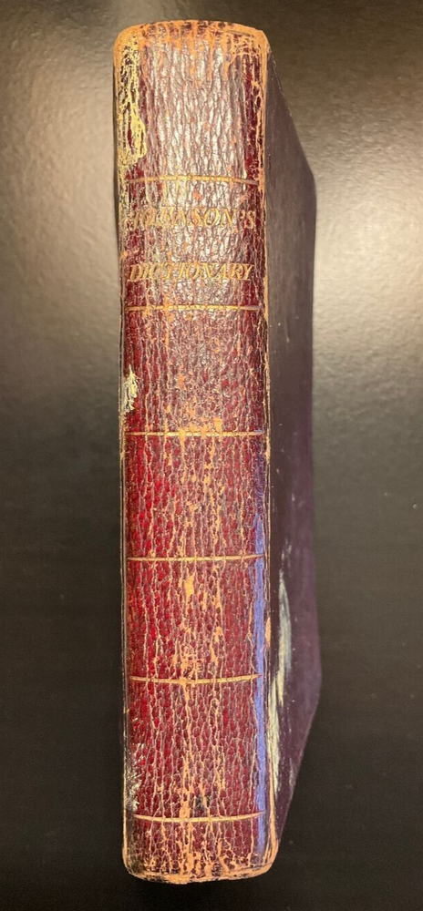 Attention Collectors! You are bidding on a very scarce hardcover book titled Dictionary of the English Language Compiled From Dr. Johnson; With the Addition of Words Since Familiarized to Us. Also with a Dictionary of the Heathen Mythology. To which is Added, a Complete List of All the Cities, Boroughs, Towns and Remarkable Villages in England and Wales; And a Comprehensive View of English Grammar. The Seventh Edition. Printed in London for W. Peacock and Sons, 1806. This is a pocket-sized book. Imagine, this book is over 200 years old!! Book is fully bound in leather. The binding shows wear and has some white stain on front cover. All pages are tightly bound. The pages show some mostly mild foxing/soiling and are quite legible. The very top of the tile page has been cut off (refer to picture). Book is solid and remains in overall good condition. Nice book to add to a collection! This is a very rare book. Very collectible! Great gift idea! (Inventory: 460-K) Track Page Views With Auctiva's FREE Counter
