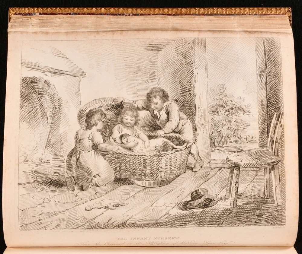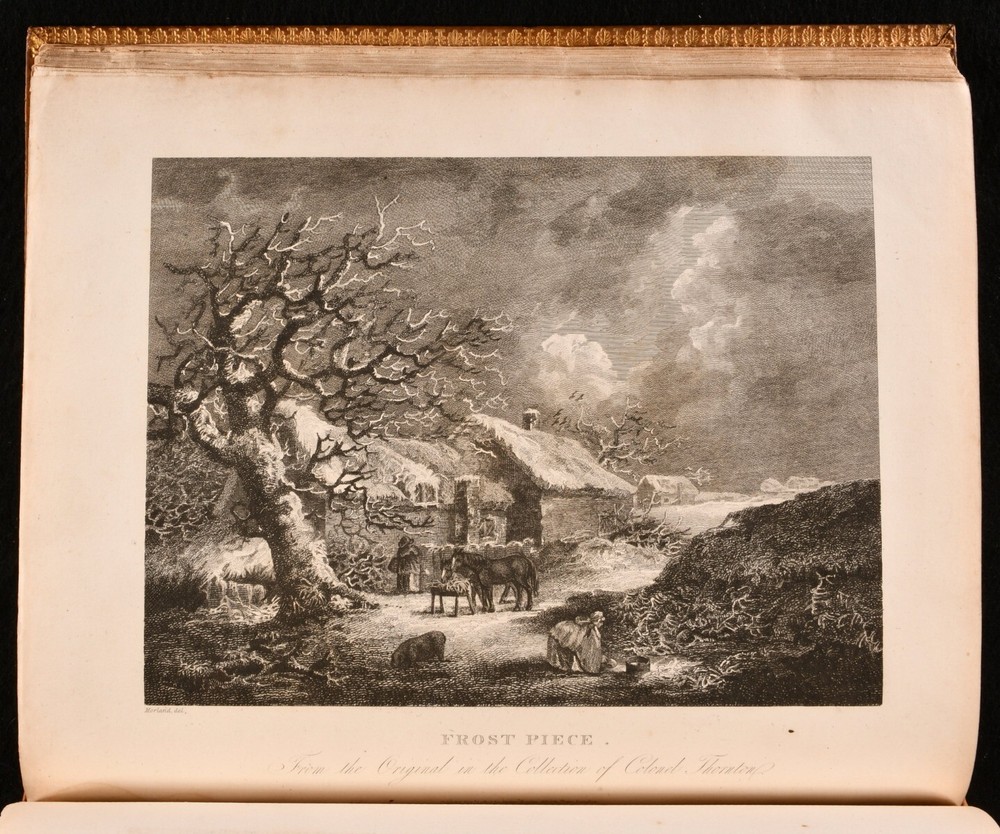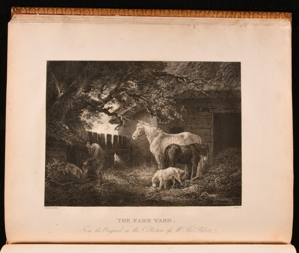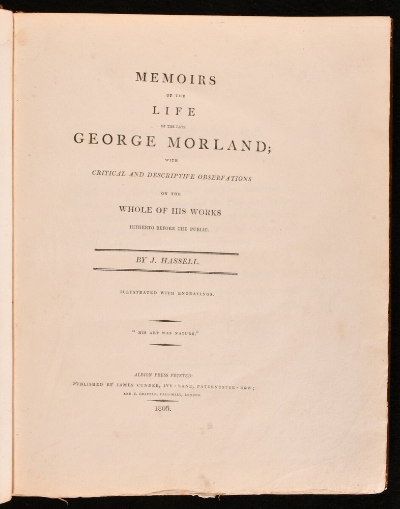 Click here to see our other books! Memoirs of the Life of the Late George Morland John Hassell 1806 James Cundee : London 12" by 10" vii [2], 2-204pp SUMMARY The first edition of John Hassel's beautifully engraved biography of painter George Morland, published only two years after his death. First Edition,Illustrated,Leather Binding Overall Condition: Very Good This book weighs 1.5 KG when packed UK Postage: £ 3.99 US Postage: £ 23.99 EU Postage : £ 18.99 European Postage: £ 19.99 Asia Postage: £ 31.99 Worldwide Postage: £ 32.99 DESCRIPTION The first edition of landscape painter John Hassell's illustrated biography of his fellow artist, English painter George Morland. In a smart full calf binding. Illustrated with an engraved title page, and eight further plates, 'executed by the first artists [...] offered as a specimen of the talents of Morland in the respective subjects treated'. Collated, complete. Morland's finest work portrayed rustic and rural scenes, depicting rich landscapes informed by the Dutch Golden Age paintings. Many of his most iconic images are represented in this work. With the armorial bookplate of Mexborough to the front pastedown, and the contemporary owner's inscription of Alan Davies to a front endpaper. Davies' attractive illustrated bookplate appears to the front free endpaper. A charming and beautifully engraved biographical study, featuring a catalogue of the works of Morland to the rear. CONDITION In a full calf binding. Externally, smart, with rubbing to back strip, most concentrated to head, and light discolouration. Minor rubbing to the leather of the boards, most concentrated to rear board. Bookplates to front pastedown and front free endpaper. Contemporary owner's inscription to a front endpaper. Internally, firmly bound. Significant spotting and discolouration to engraved title page. Pages otherwise lightly age toned to perimeters, but generally bright. Light spotting to plate perimeters, and pages facing them. Overall Condition: Very Good GLOSSARY OF TERMS Overall Condition (Dustwrapper condition rating is shown after that for the book itself, where a dustwrapper is present) Fine - Very well preserved copy showing very little wear Very Good Indeed - Only one or two minor faults, really a very attractive copy Very Good - Quite a wide term meaning no major faults but probably several smaller ones often expected given the age of the book, but still a respectable copy Good - Meaning not very good. Some more serious faults as will be described in the condition report under 'condition' Good Only - Meaning one or more faults that could really do with repair Fair - As with good only above but with other faults leaving a compromised copy even after repair Poor - Really bad and possibly seriously incomplete. We only sell books in this condition where their rarity or value makes them attractive none the less. Major defects will be described. GUARANTEE We offer a full money back guarantee on our descriptions. Please ask for details and conditions. We prefer PAYPAL. If you pay via PAYPAL we will post the item off the same or the next working day with the postage you have selected. Please note we cannot accept USD cheques