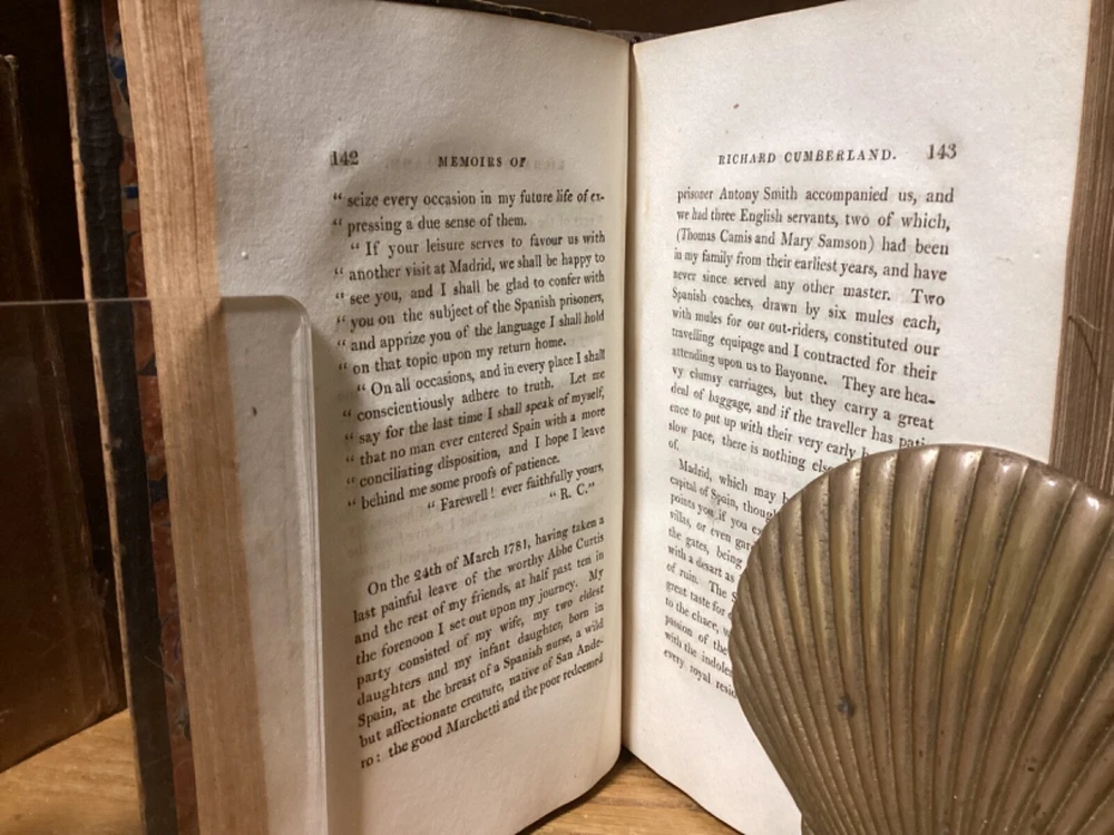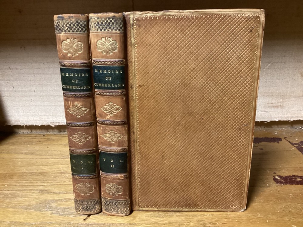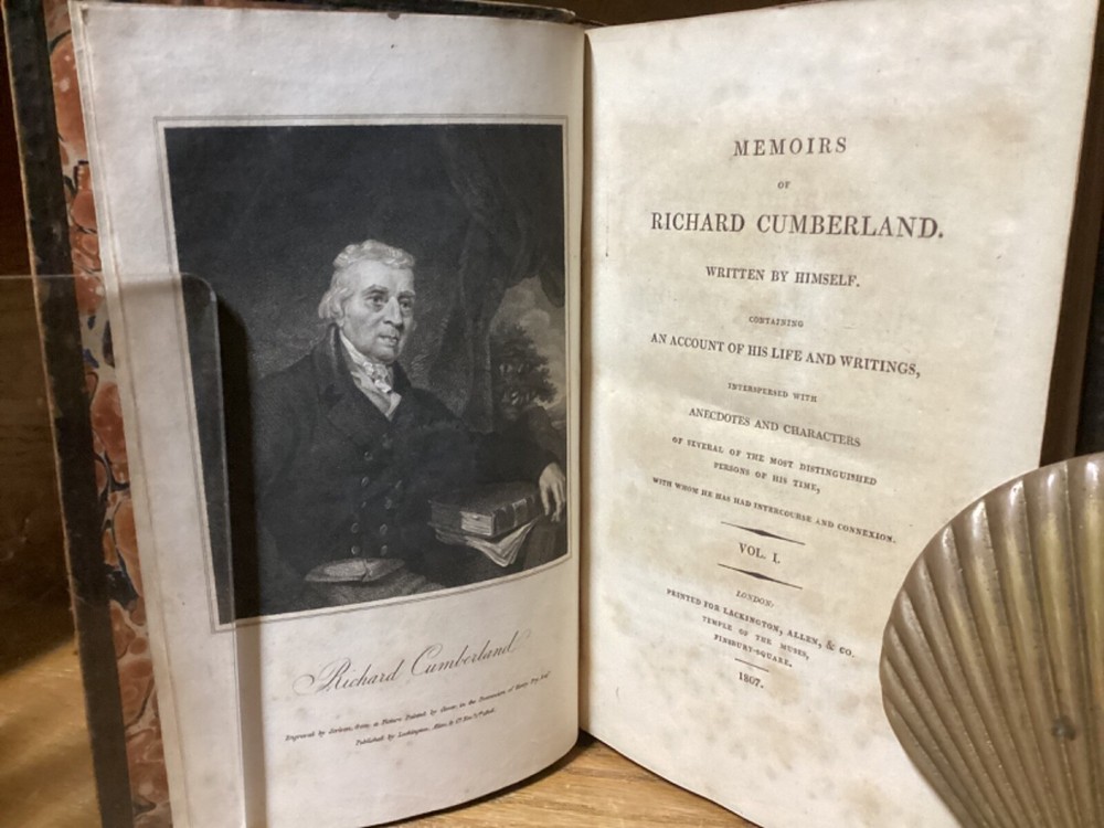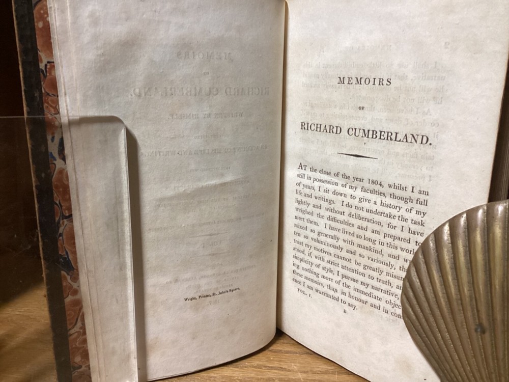 Memoirs of Richard Cumberland, Written by Himself. Containing an Account of His Life and Writings. Printed in London by Lackington, Allen, and Co. 1807. In two volumes. 499 and 432 pp. 8.5” x 5.5”. 8vo. Hardcover full leather. In fair condition, with scuffing and wear to exterior. Some bumping along edges of boards and corners. Front board of Volume I cracked and shaky. Text blocks remain in good condition. Bookplates affixed to front pastedown of each volume. General age-related toning to pages, along with periodic foxing and wear. Light markings. Frontispiece portrait adjacent to title page of Volume I. Please see photographs and ask any questions prior to purchasing. A scarce piece on the life, travels, and career of Richard Cumberland (1731/2 - 1811), an English dramatist and civil servant. The author of The West Indian , he was also secretly sent to Spain during the American War of Independence in order to attempt a peace agreement between London and Madrid. Bookplates of George de Linge Gregory, High Sheriff of Nottinghamshire, and the owner of Harlaxton Manor, a county house in Harlaxton, Lincolnshire. COLR1805ABDX