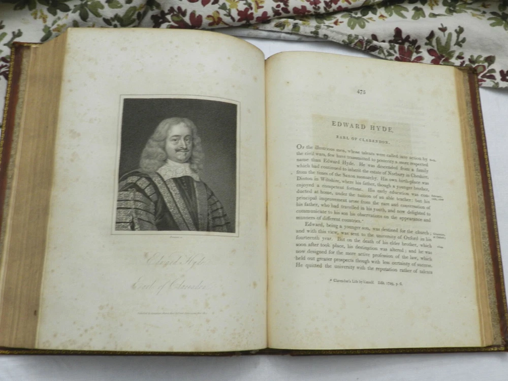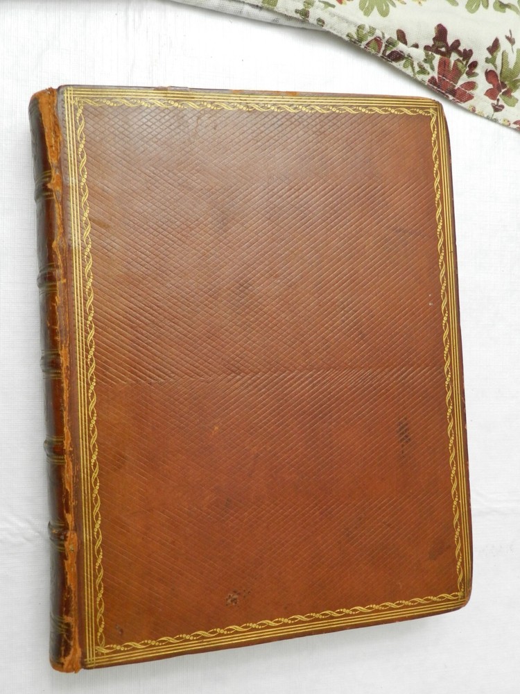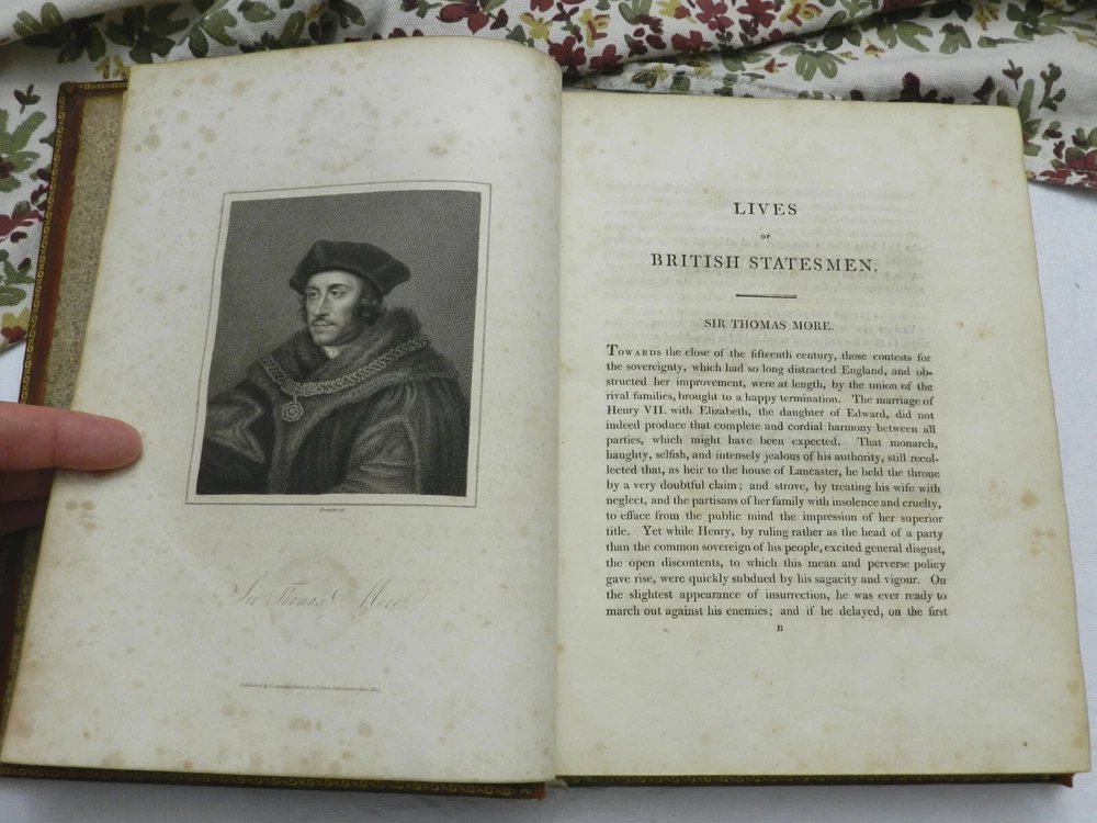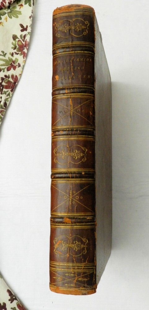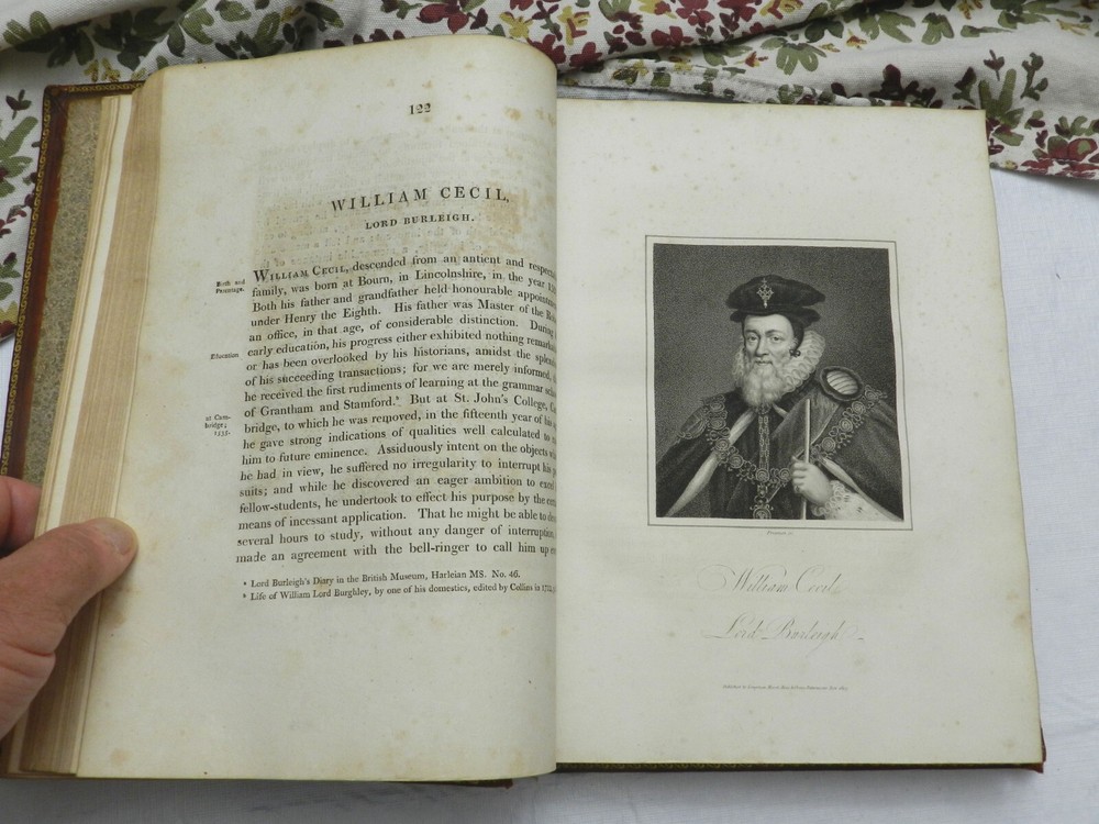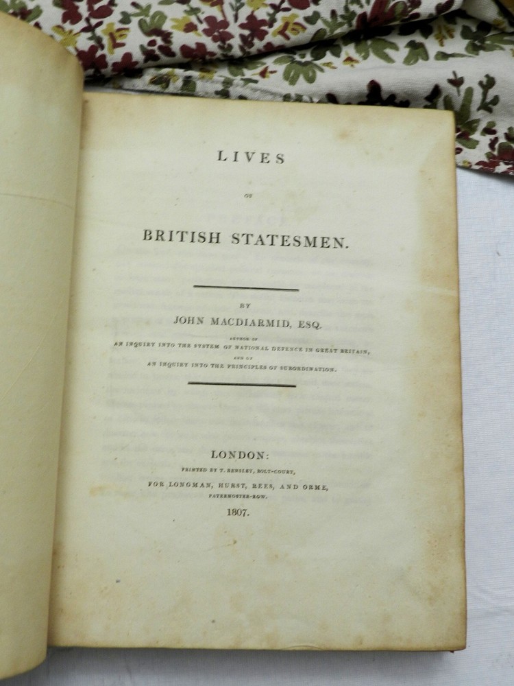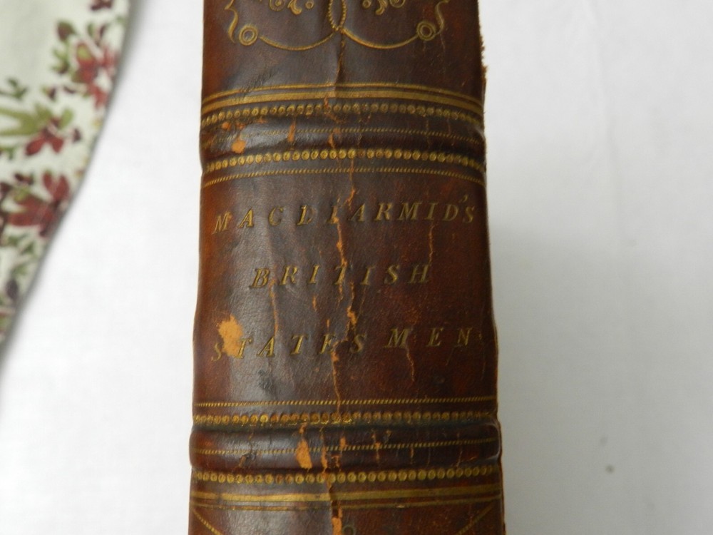 A VERY NICE FULL LEATHER COPY OF, LIVES OF BRITISH STATESMEN, AUTHORED BY JOHN MACDIARMID, PUBLISHED IN 1807 BY LONDON, PRINTED BY T. BENSLEY FOR LONGMAN, HURST, REES AND ORME. Clean brown leather boards with gilt decoration and lettering front cover and spine. The brown on the spine leather is darkened, and the titling and decoration rubbed but legible on the spine. There is heavy corner and top/bottom spine wear on the leather, corner bumped, beginning of board separation top and bottom where front and rear boards meet the spine. The boards are still solidly attached. Dark top stain, floral endpapers, no interior marks in xii, 577 pages, followed by a 3 Appendices entailing 29 pages, ending with 2 pages (one leaf) of publisher ads. The book measures about 11" by 9" and weighs 3 pounds 15 oz. The book has four plates, three of which shown in the listing photos, and includes essays on Thomas More, William Cecil, Thomas Wentworth and Edward Hyde. BB8