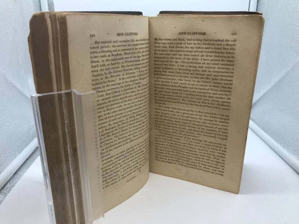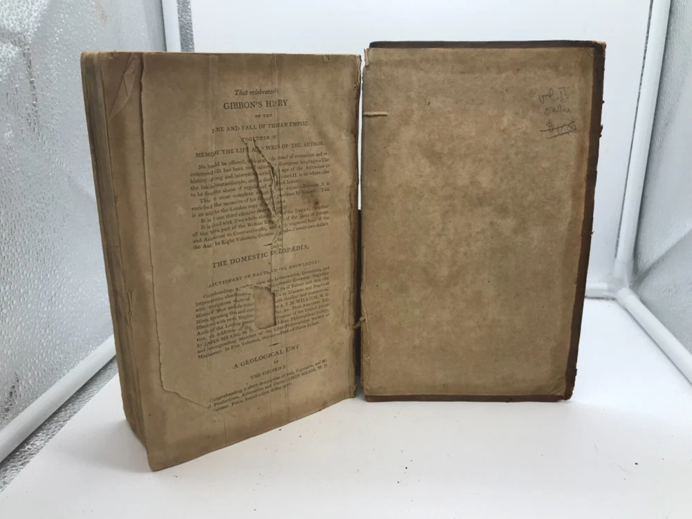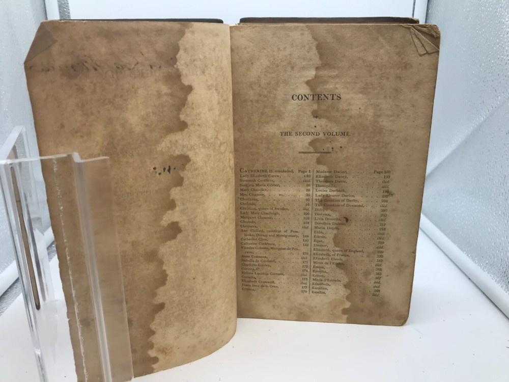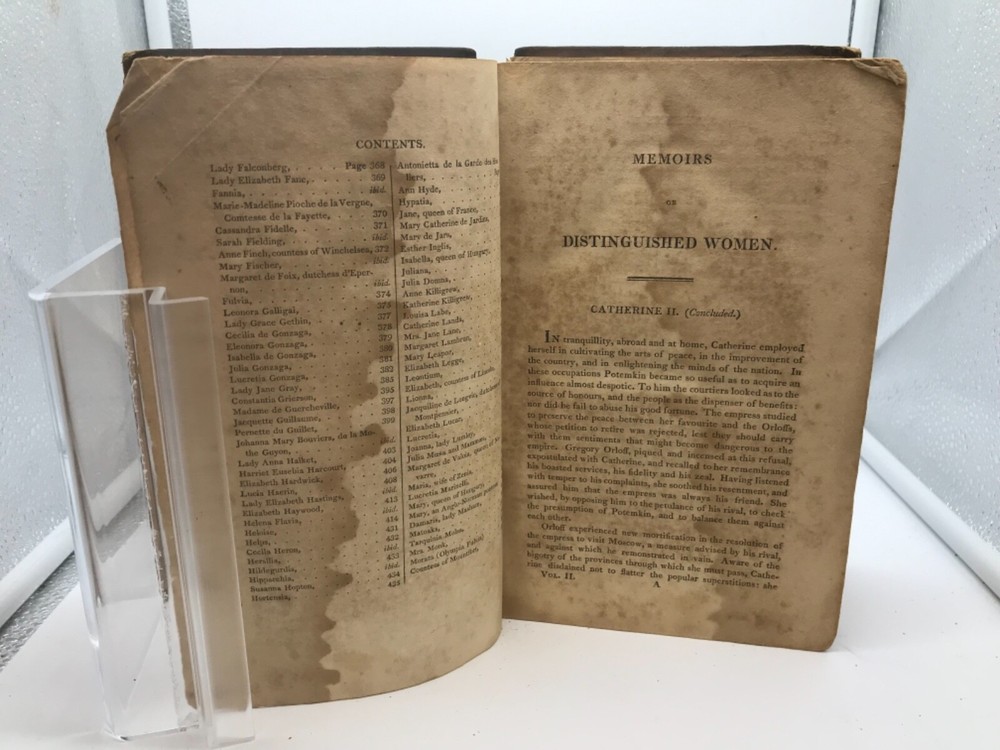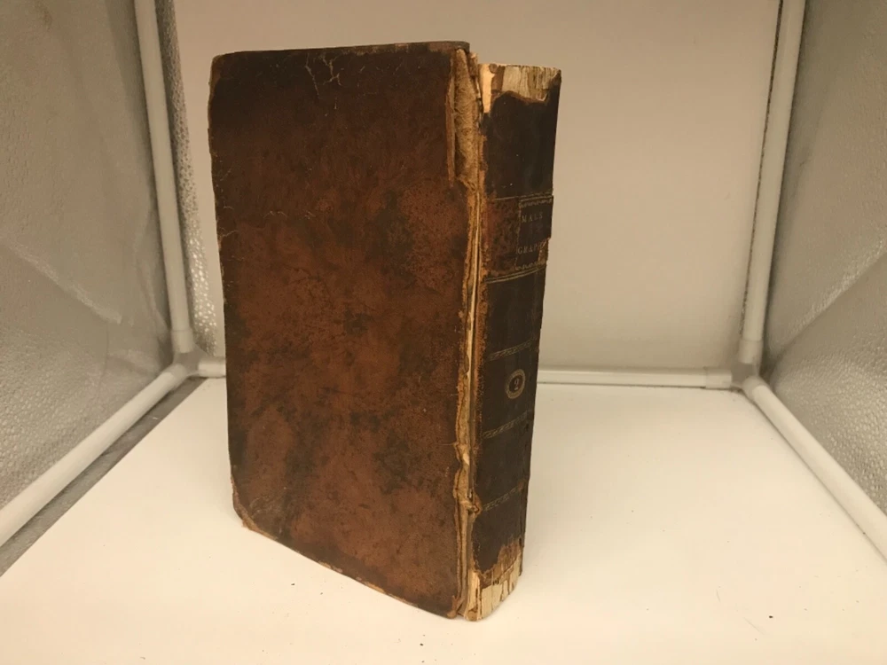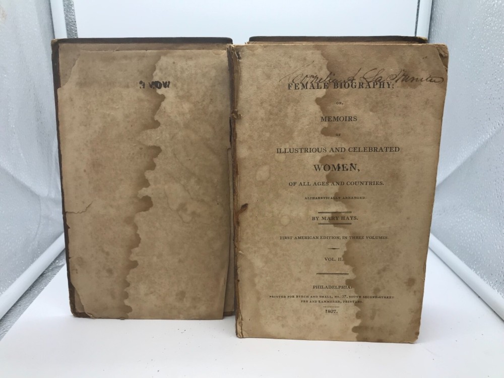 Female Biography; Or, Memoirs of Illustrious and Celebrated Women, Of All Ages and Countries. Alphabetically Arranged. By Mary Hays and printed in Philadelphia for Byrch and Small. 1807, 510 pp, 8.5 x 5.5”, leather, 8vo. First American edition in as-is condition. Volume II only of the 3-volume set. Front board completely detached, while the back board is only attached by one thread. Rubbing to leather, primarily around the edges and corners. Front flyleaf detached. Hinges worn around front and back of book but sturdy throughout the text block. Top and bottom portions of leather are missing from the spine, as well as part of the title label. Staining to the first 15-20 pages of the book that does not prevent overall readability. Inscriptions and signatures on the front and back pastedown, front flyleaf, and title page; text block appears free of marginalia. Periodic folding of top corners of pages. Includes a damaged advertisement sheet at the end of the text block. Initials of “H.A.” are written into the fore edge of the book. General age-related toning to text block throughout. Please see photos. Mary Hays (1759-1843) was a British writer and intellect who is considered an early feminist thinker. This work examines the lives of dozens of women considered influential in the early 19th century, many of whom have become relatively unknown in the modern era. FORN-ABE-MSB-0821-Shelf-574-aj027