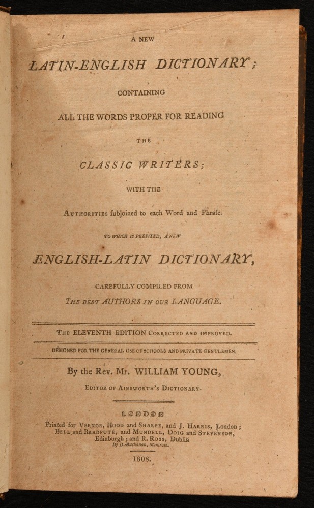 Click here to see our other books! A New Latin-English Dictionary; Containing All the Words Proper for Reading the Classic Writers Rev. William Young 1808 Vernor, Hood and Sharpe : London 8.5" by 5.5" unpaginated SUMMARY The eleventh edition of this new Latin-English dictionary, in full tree calf binding. Leather Binding,Original Binding,Publishers' Original Binding Overall Condition: Very Good This book weighs 1 KG when packed UK Postage: £ 3.99 US Postage: £ 22.99 EU Postage : £ 16.99 European Postage: £ 17.99 Asia Postage: £ 22.99 Worldwide Postage: £ 28.99 DESCRIPTION Eleventh edition. A comprehensive Latin-English dictionary designed for the use of schools and private learning. Containing the proper words for reading the classic writers, with the authorities subjoined to each word and phrase. With a new English-Latin dictionary carefully compiled. Produced by Reverend William Young, a British editor. CONDITION In the original full tree calf binding. Externally, smart with light rubbing and minor loss to the extremities. Light fading to the spine with the odd mark to the boards. A small crack to the head of the front joint. Internally, firmly bound. Pages are very bright with the odd small spot and light age toning to the extremities. Overall Condition: Very Good GLOSSARY OF TERMS Overall Condition (Dustwrapper condition rating is shown after that for the book itself, where a dustwrapper is present) Fine - Very well preserved copy showing very little wear Very Good Indeed - Only one or two minor faults, really a very attractive copy Very Good - Quite a wide term meaning no major faults but probably several smaller ones often expected given the age of the book, but still a respectable copy Good - Meaning not very good. Some more serious faults as will be described in the condition report under 'condition' Good Only - Meaning one or more faults that could really do with repair Fair - As with good only above but with other faults leaving a compromised copy even after repair Poor - Really bad and possibly seriously incomplete. We only sell books in this condition where their rarity or value makes them attractive none the less. Major defects will be described. GUARANTEE We offer a full money back guarantee on our descriptions. Please ask for details and conditions. We prefer PAYPAL. If you pay via PAYPAL we will post the item off the same or the next working day with the postage you have selected. Please note we cannot accept USD cheques