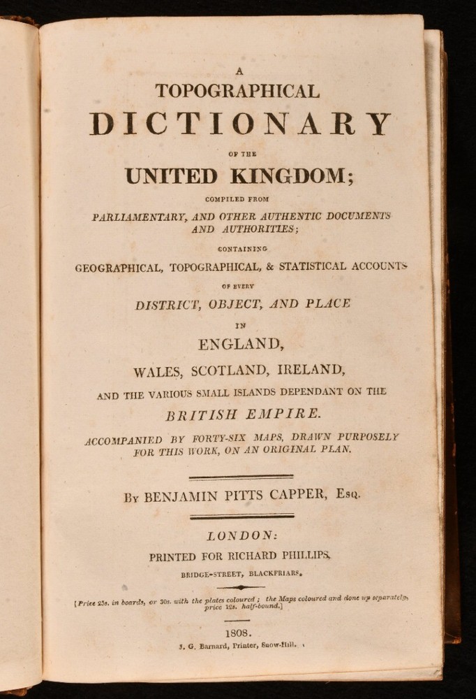 Click here to see our other books! A Topographical Dictionary of the United Kingdom Benjamin Pitts Capper 1808 Richard Phillips : London 8.5" by 5.5" xiv, unpaginated SUMMARY A smart first edition of this topographical dictionary for the UK, with folding maps throughout. First Edition,Folding Maps,Illustrated,Leather Binding Overall Condition: Good This book weighs 3 KG when packed UK Postage: £ 3.99 US Postage: £ 36.99 EU Postage : £ 25.99 European Postage: £ 27.99 Asia Postage: £ 47.99 Worldwide Postage: £ 69.99 DESCRIPTION First edition. Illustrated with thirty-nine maps and seven folding maps, for a total of forty-six. Collated complete. A topographical dictionary of the UK, with geographical, topographical, and statistical accounts of every district and place in England, Scotland, Wales, Ireland, and various small islands of the British Empire. Compiled from parliamentary and authenticated documents. Written by Benjamin Pitts Capper, an English author and topographer. CONDITION Bound in contemporary full calf. Externally, sound with rubbing and wear resulting in light loss to the extremities. Fading to the spine and the odd mark to the board. Creases to the spine. Internally, firmly bound. Pages are bright and clean with the odd handling mark. Contemporary ink inscription to the front pastedown dated 1849. Overall Condition: Good GLOSSARY OF TERMS Overall Condition (Dustwrapper condition rating is shown after that for the book itself, where a dustwrapper is present) Fine - Very well preserved copy showing very little wear Very Good Indeed - Only one or two minor faults, really a very attractive copy Very Good - Quite a wide term meaning no major faults but probably several smaller ones often expected given the age of the book, but still a respectable copy Good - Meaning not very good. Some more serious faults as will be described in the condition report under 'condition' Good Only - Meaning one or more faults that could really do with repair Fair - As with good only above but with other faults leaving a compromised copy even after repair Poor - Really bad and possibly seriously incomplete. We only sell books in this condition where their rarity or value makes them attractive none the less. Major defects will be described. GUARANTEE We offer a full money back guarantee on our descriptions. Please ask for details and conditions. We prefer PAYPAL. If you pay via PAYPAL we will post the item off the same or the next working day with the postage you have selected. Please note we cannot accept USD cheques