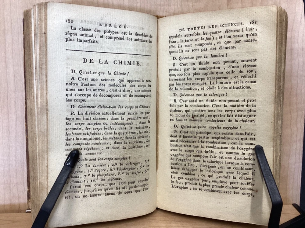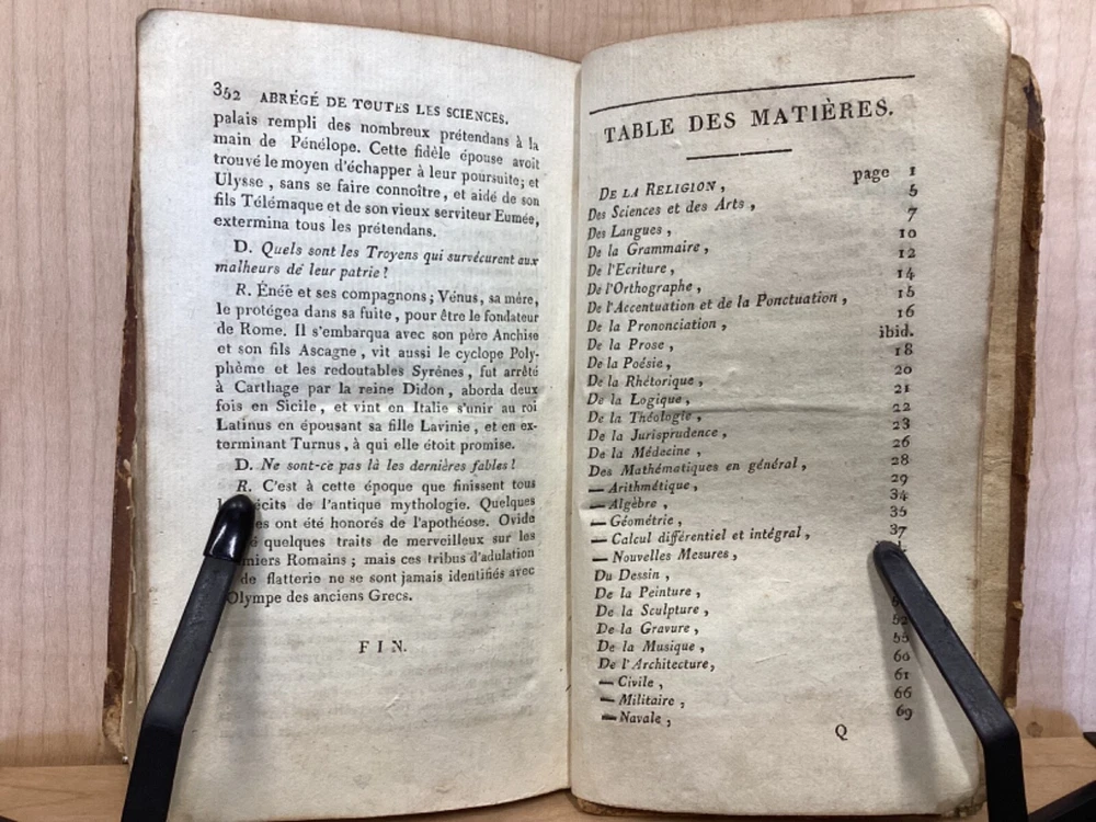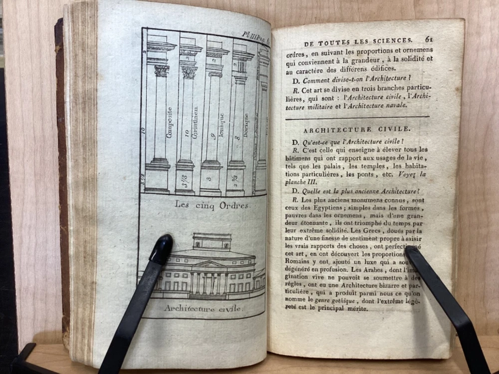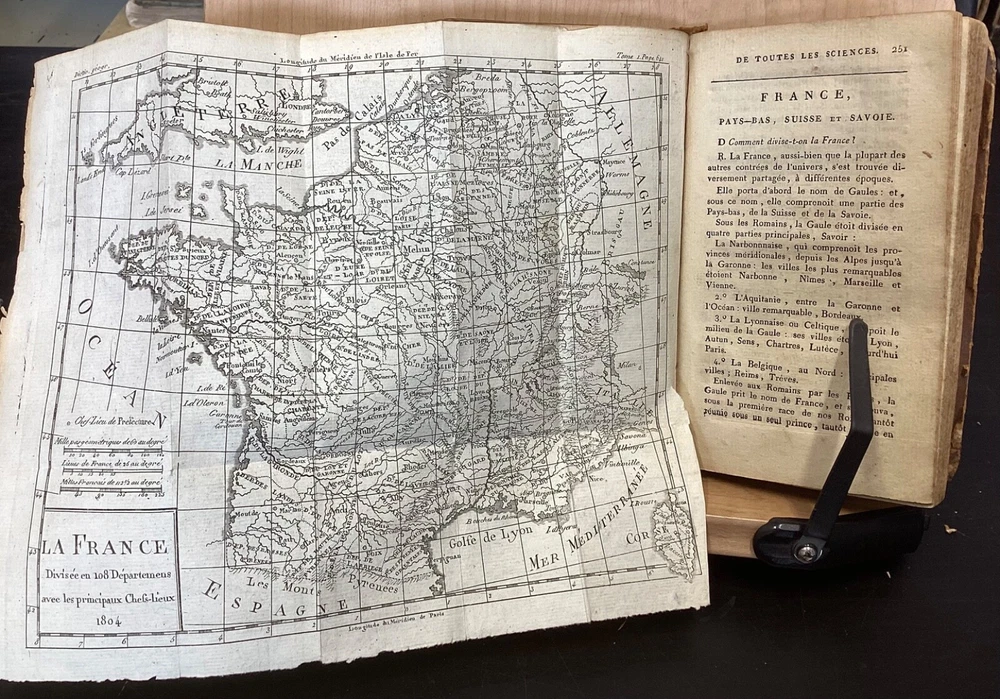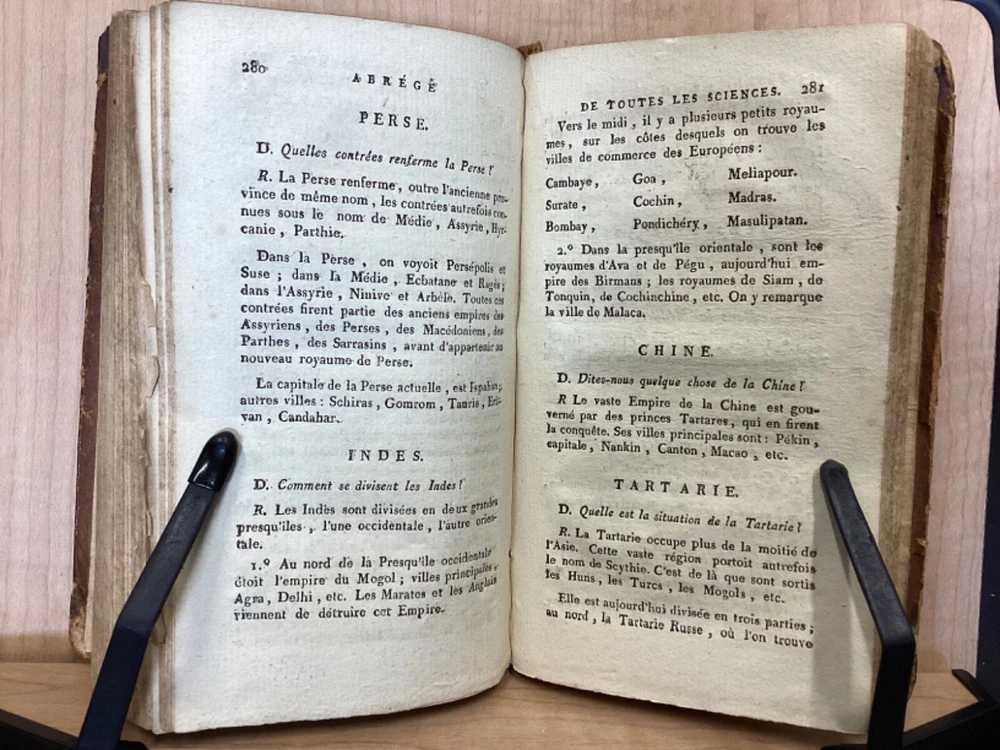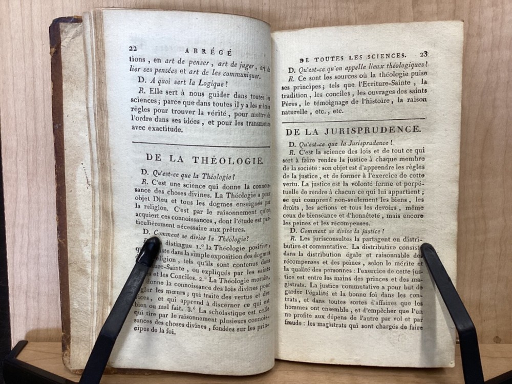Encyclopedie des Enfans, ou Abrege de Toutes les Sciences, A l’usage des Ecoles des deux sexes, Nouvelle Edition, Revue, corrigee et ornee de figures, Par M-Z, Rusand, Lyon, 1808, 352pp, leather, 4 x 7”, 18mo Fair condition. Wear and chipping to boards. Tips are bumped with exposed boards. Edges are scuffed. Joints and hinges are cracked. Chipping and cracking to spine. Red leather title plate is cracked but still mostly legible. Speckling to fore edges. Provenance on flyleaf (Melanie Jory[?]). Bottom half of plate II has been torn off. Toning, age-staining, tea-staining, and ink-staining throughout textblock. Rear endpaper has been torn out. Illustrations throughout including fold-out plates. Please see photos. Scientific encyclopedia aimed at children. This listing is for part M-Z only. Covers various topics like mythology, sculpture, music, and theology, as well as a number of others. FORN-TUB-0050-XX-2407-JC1001