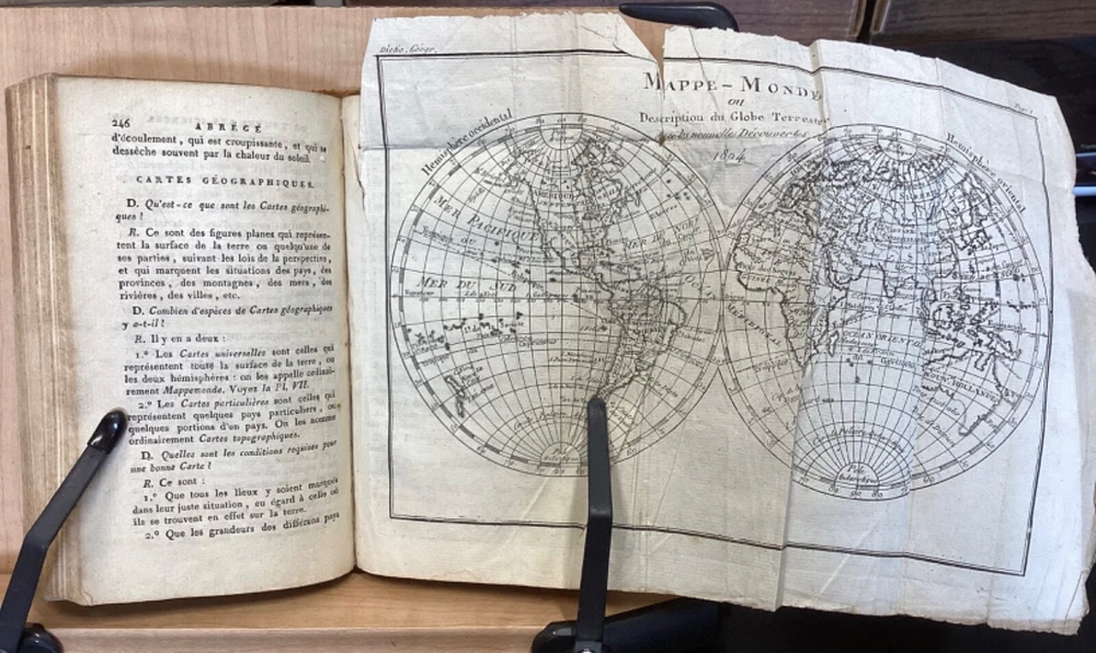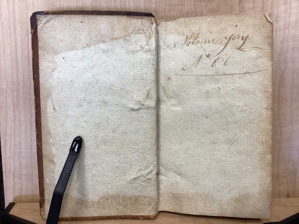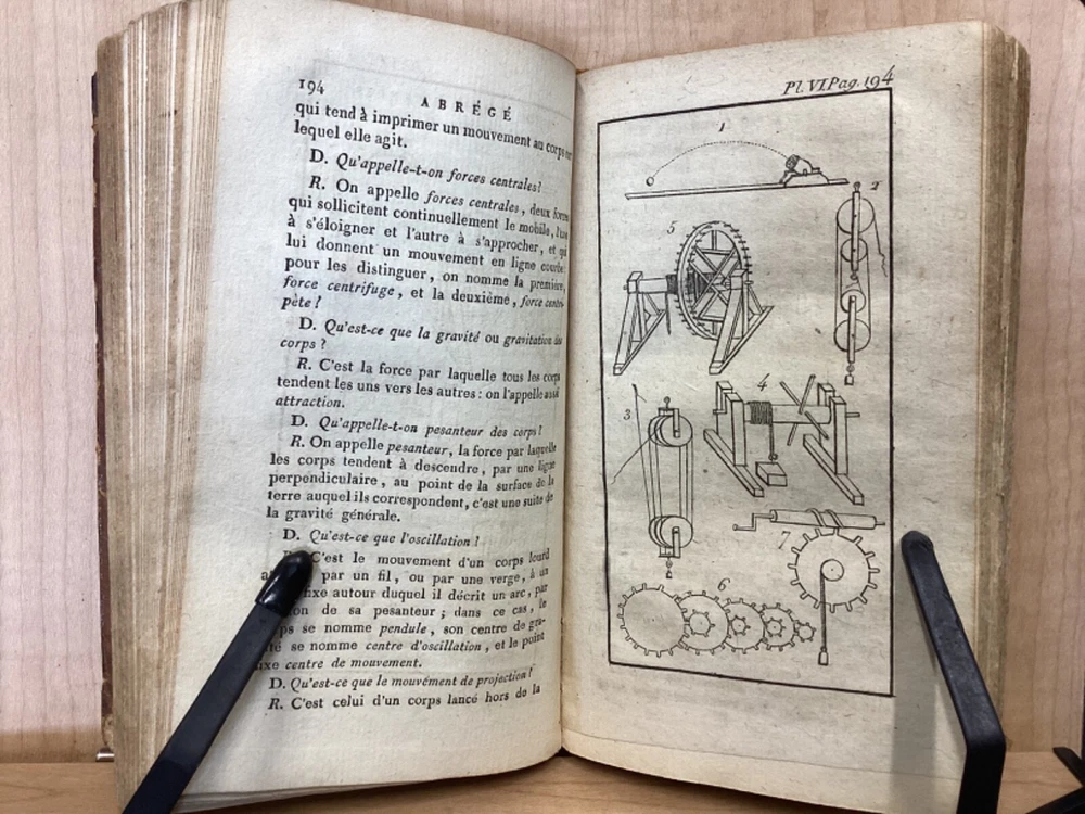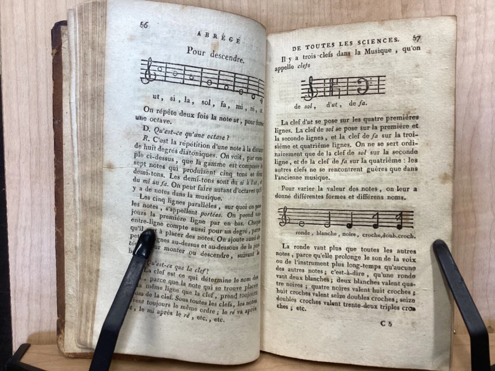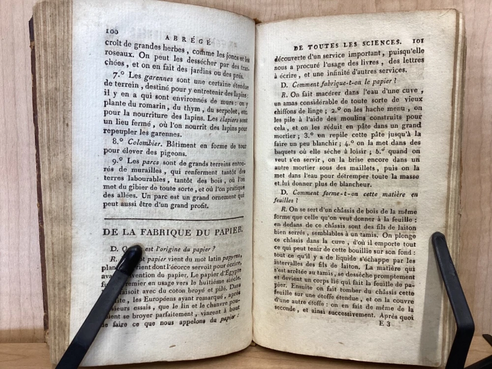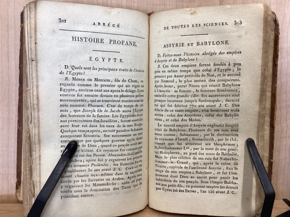 Encyclopedie des Enfans, ou Abrege de Toutes les Sciences, A l’usage des Ecoles des deux sexes, Nouvelle Edition, Revue, corrigee et ornee de figures, Par M-Z, Rusand, Lyon, 1808, 352pp, leather, 4 x 7”, 18mo Fair condition. Wear and chipping to boards. Tips are bumped with exposed boards. Edges are scuffed. Joints and hinges are cracked. Chipping and cracking to spine. Red leather title plate is cracked but still mostly legible. Speckling to fore edges. Provenance on flyleaf (Melanie Jory[?]). Bottom half of plate II has been torn off. Toning, age-staining, tea-staining, and ink-staining throughout textblock. Rear endpaper has been torn out. Illustrations throughout including fold-out plates. Please see photos. Scientific encyclopedia aimed at children. This listing is for part M-Z only. Covers various topics like mythology, sculpture, music, and theology, as well as a number of others. FORN-TUB-0050-XX-2407-JC1001